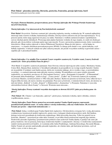 Piotr Bakal - piosenka autorska, literacka, poetycka, francuska, poezja śpiewana, bard Prawdziwą nędzą jest życie bez sztuki Wywiad z Piotrem Bakalem, przeprowadzony przez Macieja Jędrzejko dla Wolnego Portalu Szantowego SZANTYMANIAK. Maciej Jędrzejko: Czy interesował się Pan kiedykolwiek szantami? Piotr Bakal: Oczywiście. Zarówno szantami jak i piosenką żeglarską, morską, wodniacką itp. W szantach najbardziej interesuje mnie warstwa wokalna, harmonizacja chóralna. Zresztą warstwa tekstowa nie jest tam najważniejsza. To są przecież pieśni, które mają zagrzewać do pracy na statku. Natomiast z wielkim zainteresowaniem i upodobaniem zawsze słucham pieśni chóralnych. Wzruszają mnie piękne harmonie wokalne do tego stopnia, że ciarki mi chodzą po plecach, gdy słyszę dobrze wykonane partie tego typu muzyki. To jest z pewnością zainteresowanie, które wyniosłem z dzieciństwa. Oboje rodzice śpiewali w chórze Filharmonii Narodowej. Mama do dziś śpiewa – od lat będąc na emeryturze – w zespole chóralnym prowadzonym przez SPAM. Co innego jeśli chodzi o tzw. pieśni kubryku, czyli ballady żeglarskie, w których szukam nie tylko ciekawej muzyki, ale przede wszystkim osobistej wypowiedzi autora – zupełnie jak w piosenkach bardów. Maciej Jędrzejko: Czy mógłby Pan wymienić 5 nazw zespołów szantowych, 5 tytułów szant, 2 nazwy festiwali szantowych - które przychodza Panu do głowy? Piotr Bakal: Z zespołów szantowych pamiętam: Stare Dzwony (chociaż śpiewają nie tylko szanty), Mechanicy Szanty, Cztery Refy, Banana Boat, niedawno w Suwałkach natknąłem się przypadkowo na występ zespołu Sąsiedzi i bardzo mi się podobał. Z tytułami szant będzie gorzej, chyba nie wymienię żadnego, ale to wynika z tego, co powiedziałem wcześniej – w szantach interesuje mnie głównie warstwa wokalna. Wymieniłbym za to sporo tytułów piosenek żeglarskich, czy morskich, począwszy od „Pod żaglami Zawiszy”, przez „Pożegnanie Liverpoolu”, „O Shenandoah”, do piosenek Jurka Porębskiego: „Gdzie ta keja”, „Cztery piwka”, „Ciałko” itd. Z festiwali szantowych wymienię oczywiście Shanties, na którym byłem w 1982 roku jako słuchacz. Byłem też jurorem na festiwalu, który odbywał się w Zegrzu kilka lat temu, ale nazwy niestety nie pamiętam. Poza tym są festiwale, o istnieniu których wiem, ale niestety na nich nie byłem: „Kubryk” w Łodzi, „Kopyść” w Białymstoku i „Szantaclaus” w Poznaniu. Natomiast w tym roku odwiedziłem festiwal „Rock Szanty” w Serwach. Wrażenia mam mieszane... Maciej Jędrzejko: Proszę wymienić wszystkie skorzajenia ze słowem SZANTY jakie przychodzą panu do głowy? Piotr Bakal: OK. Chanter = po francusku „śpiewać”, pieśni pracy, harmonia wokalna, śpiew chóralny, ciekawe współbrzmienia, morze... Maciej Jędrzejko: Panie Piotrze pomysł na uczczenie pamięci Tomka Opoki poprzez zaproszenie przedstawicieli polskich szant - to ważny ukłon w stronę środowiska, a dla nas wielki honor. DLACZEGO? Pytanie jest proste – odpowiedź niekoniecznie :-) Piotr Bakal: Jedną z wielkich pasji Tomka Opoki było żeglarstwo. Od dzieciństwa związany był z wodą, pływaniem, wodniactwem, konstruował modele żaglowców, potem wraz z kolegami zbudował prawdziwy jacht. Był bardem, którego twórczość przeniknęła do środowiska żeglarskiego. Miał niezwykłą charyzmę. Tylko raz pojawił się na festiwalu „Shanties” i pozostawił po sobie takie wrażenie, że po kilku latach ustanowiono nagrodę jego imienia... Środowisko piosenki żeglarskiej i przedstawiciele polskich szant zachowali Tomka Opokę w pamięci tak samo jak polscy bardowie. Jest on postacią, która łączy środowisko bardów i szantymenów. Zresztą i w środowisku szantymenów znaleźć można prawdziwych bardów, że wymienię tylko Jurka Porębskiego, Andrzeja Koryckiego, Ryszarda Muzaja... Gdyby Tomek żył, pewnie nadal pisałby piosenki żeglarskie, ale właśnie takie, jak bard pisać powinien, czyli od siebie, o tym, co mu w duszy gra... strona 1 / 5 Piotr Bakal - piosenka autorska, literacka, poetycka, francuska, poezja śpiewana, bard Prawdziwą nędzą jest życie bez sztuki Maciej Jędrzejko: Przglądając stronę www.tomekopoka.com nie znlazłem informacji jak zginął Tomek Opoka? Piotr Bakal: Tomek nie zginął, a zmarł w wyniku choroby nowotworowej. Maciej Jędrzejko: Jakie znaczenie dla kultury mają Bardowie? Piotr Bakal: Odpowiedź na to pytanie byłaby godna poważnego eseju, albo nawet pracy doktorskiej. W krótkiej formie wywiadu trzeba zastosować z konieczności duże skróty myślowe. W dawnych czasach bardowie pełnili rolę komentatorów znaczących wydarzeń historycznych, opiewali bohaterskie czyny królów i wodzów, a więc ukazywali w swych pieśniach szerszemu ogółowi to, co było według nich ważne. Dzisiaj współcześni bardowie komentują po swojemu zarówno świat zewnętrzny, jak i swój świat wewnętrzny. Tak, jak malarz, rzeźbiarz, dramaturg, poeta – komunikują się ze światem przy pomocy swojej sztuki. Wyrażają siebie poprzez piosenkę autorską. Ich znaczenie dla kultury jest więc podobne, jak znaczenie malarza, rzeźbiarza, dramaturga, czy poety. Oczywiście można się bez nich obejść... i co tu dużo mówić – ogromna i coraz większa liczba ludności naszego kraju obchodzi się bez nich, nie zauważając nawet swej nędzy... Bo prawdziwą nędzą jest życie bez sztuki, bez wzruszenia wywołanego dziełem artysty. Nie łudźmy się, że bardowie uczynią cud i od ich słuchania Naród zmądrzeje. Ważne jest jednak, aby z tej masy ludzi mieli szansę wyłowić tych, którzy jeszcze nie są do końca straceni. Ocalić ich dla wrażliwości. I o tę szansę daną bardom, daną nam, powinniśmy się upominać. Nie powinniśmy się godzić na spychanie bardów do coraz ciaśniejszych nisz... Nie powinniśmy się godzić na spychanie wszyst