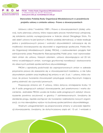 Stanowisko Polskiej Rady Organizacji Młodzieżowych w przedmiocie projektu ustawy o zmianie ustawy- Prawo o stowarzyszeniach Ustawa z dnia 7 kwietnia 1989 r. Prawo o stowarzyszeniach [dalej: ustawa], była pierwszą ustawą, która rozpoczęła proces transformacji ustrojowej. Jej założenia zostały wynegocjowane w trakcie obrad Okrągłego Stołu. Po dziś dzień ustawa ta jest jednym z filarów polskiej demokracji, a także realizuje jedno z podstawowych prawa i wolności obywatelskich odnoszące się do możliwości stowarzyszania się obywateli w organizacje społeczne. Polska Rada Organizacji Młodzieżowych [dalej: PROM], z zadowoleniem przyjęła fakt zainicjowania przez Prezydenta Rzeczpospolitej Polski prac nad wprowadzeniem zmian do ustawy. Naszym zdaniem, ustawa obowiązująca od 25 lat, mimo wcześniejszych zmian, wymaga gruntownej nowelizacji i dostosowania do obecnych potrzeb społeczeństwa obywatelskiego. PROM z aprobatą podchodzi do zaproponowanych zmian w zakresie przyznania prawa do zrzeszania się w stowarzyszeniach każdemu, a nie tylko obywatelom polskim oraz implikacji tej zmiany w art. 3 ust. 1 ustawy, która stanowi, że prawo tworzenia stowarzyszeń przysługuje osobą fizycznym mającą pełną zdolność do czynności prawnych. Propozycja zmiana art. 9 ustawy, która dotyczy zmniejszenia liczby 15 do 9 osób pragnących założyć stowarzyszenie, jest przełomowa i warta docenienia. Jednakże PROM uważa że liczba osób pragnących założyć stowarzyszenie powinna oscylować w granicy 7 zainteresowanych. Uważamy że obniżenie progu, będzie zachęcać do tworzenia i zakładania nowych organizacji, co ma niewątpliwy wpływ na budowę społeczeństwa obywatelskiego. Ważnym udogodnieniem są proponowane zmiany w procesie rejestracji stowarzyszenia. Uważamy, że dotychczasowy zapis art. 13 ust. 1-wniosek o zarejestrowanie stowarzyszenia sąd rejonowy rozpoznaje niezwłocznie, a rozstrzygnięcie powinno nastąpić nie później niż w ciągu 3 miesięcy od dnia złożenia wniosku- znacznie zniechęcał do zakładania stowarzyszeń, poprzez długi proces ich rejestracji. Wydłużenie było spowodowane doręczaniem wniosku o rejestrację organowi nadzorującemu. Obecnie proponowane ujęcie art. 13 ust. 1, powoduje że rejestracja stowarzyszenia, będzie trwała tak samo długo jak innych podmiotów rejestrowanych w KRS. Uważamy, że proponowany, 7 dniowy termin (wynikający z ustawy o Krajowym Rejestrze Sądowym) rejestracji, znacznie zachęca do dokonywania tej czynności. Zwracamy uwagę na proponowany zapis art. 13 ust. 3- sąd rejonowy przed wydaniem postanowienia o wpisie stowarzyszenia, jeżeli jest niezbędne dokonanie dodatkowych ustaleń, wyznacza w tym celu posiedzenie wyjaśniające. PROM proponuje do wyżej przytoczonego zapisu dodać frazę „sąd rejonowy na posiedzenie wyjaśniające może wezwać uczestników postępowania”. Proponowany zapis nie obliguje sądu rejonowego do wezwania uczestników (tak jak ma to miejsce obecnie, a podstawę ku temu stanowi art. 15 ust. 2), a jedynie daje taką możliwość. Uważamy, że na gruncie praktycznego stosowania ustawy, proponowany zapis umożliwi sądowi, wezwanie zainteresowanych uczestników postępowania. Zapis ten pozwoli na dokonanie sądowi wszelkich czynności niezbędnych do dokładnego wyjaśnienia zaistniałego stanu oraz do załatwienia sprawy mając na względzie interes społeczny i słuszny interes obywateli. PROM rekomenduje również wprowadzenie zmiany w zakresie prowadzenia uproszczeń w księgowości stowarzyszeń. W tym zakresie, w szczególności przychylamy się do postulowanych uproszczeń proponowanych przez Ogólnopolską Federacje Organizacji Pozarządowych [dalej: OFOP]. Uproszczenia, o których mowa to: 1. Stowarzyszenia, które chcą prowadzić zbiórki publiczne i korzystać z dofinansowania ze środków publicznych, są zobligowani do udostępniania swoich rocznych sprawozdań finansowych i merytorycznych. 2. Stowarzyszenia rejestrowe do momentu przekroczenia określonych obrotów i niekorzystający z funduszy publicznych w wysokości powyżej pewnego pułapu powinny móc prowadzić uproszczoną księgowość. 3. Dostosowanie zakresów i formularzy sprawozdań finansowych do specyfiki działalności prowadzonej przez organizacje pozarządowe, którymi są stowarzyszenia.1 W wyżej wymienionym zakresie rekomendujemy wprowadzenie zmian do ustawy o rachunkowości w celu wprowadzenia uproszczeń w księgowości stowarzyszeń. Uważamy że, księgowość uproszczona jako zestaw podstawowych, prostych zasad gromadzenia danych finansowych, powinien wystarczyć do rozliczeń stowarzyszeń. Ważną zaletą księgowości uproszczonej jest, to że jest stosunkowo prosta i tania w prowadzeniu, a to niezwykle ważne z punku widzenia organizacji społecznych. Jako Polska Rada Organizacji Młodzieżowych mamy nadzieję, że nasze uwagi będą miały wpływ na opracowanie jak najlepsze prawo dotyczące stowarzyszeń, co przełożą się na rozbudowę społeczeństwa obywatelskiego. Deklarujemy również, chęć dalszej współpracy w procesie nowelizacji ustawy. 1 Wymienione postulaty pochodzą z dokumentu wypracowanego przez OFOP razem z grupą roboczą, dostępnego pod adresem: http://ofop.eu/sites/ofop.eu/files/m_ostateczna_wersja_uproszczen_stowarzyszenia_ofop.pdf [dostęp na dzień: 8.08.2014].