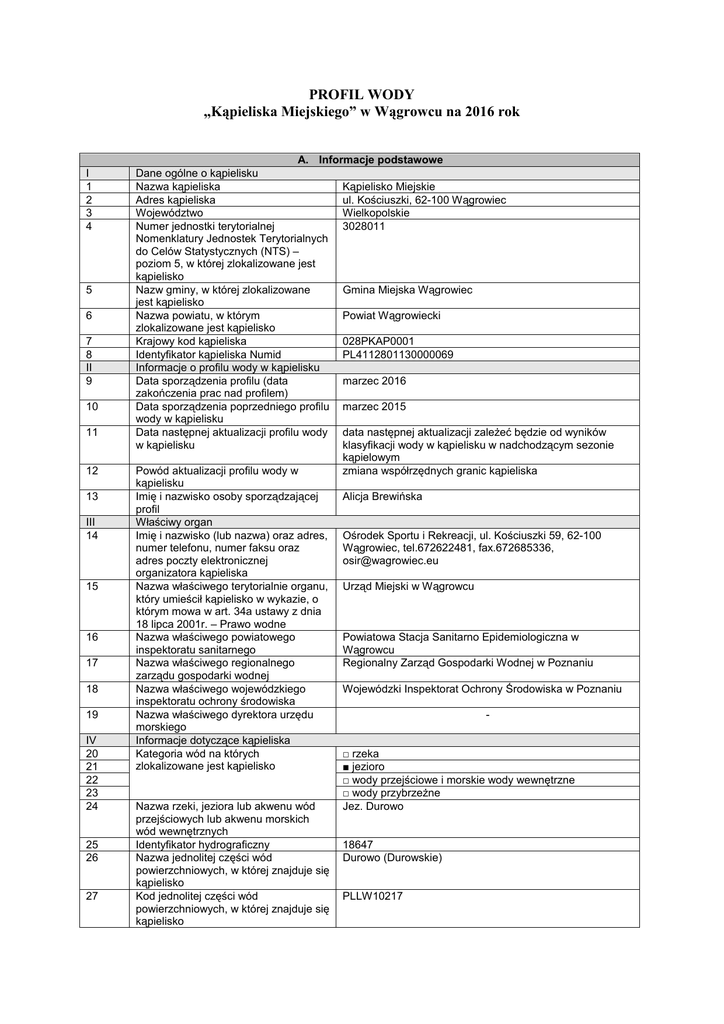 PROFIL WODY „Kąpieliska Miejskiego” w Wągrowcu na 2016 rok I 1 2 3 4 5 6 7 8 II 9 10 11 12 13 III 14 15 16 17 18 19 IV 20 21 22 23 24 25 26 27 A. Informacje podstawowe Dane ogólne o kąpielisku Nazwa kąpieliska Kąpielisko Miejskie Adres kąpieliska ul. Kościuszki, 62-100 Wągrowiec Województwo Wielkopolskie Numer jednostki terytorialnej 3028011 Nomenklatury Jednostek Terytorialnych do Celów Statystycznych (NTS) – poziom 5, w której zlokalizowane jest kąpielisko Nazw gminy, w której zlokalizowane Gmina Miejska Wągrowiec jest kąpielisko Nazwa powiatu, w którym Powiat Wągrowiecki zlokalizowane jest kąpielisko Krajowy kod kąpieliska 028PKAP0001 Identyfikator kąpieliska Numid PL4112801130000069 Informacje o profilu wody w kąpielisku Data sporządzenia profilu (data marzec 2016 zakończenia prac nad profilem) Data sporządzenia poprzedniego profilu marzec 2015 wody w kąpielisku Data następnej aktualizacji profilu wody data następnej aktualizacji zależeć będzie od wyników w kąpielisku klasyfikacji wody w kąpielisku w nadchodzącym sezonie kąpielowym Powód aktualizacji profilu wody w zmiana współrzędnych granic kąpieliska kąpielisku Imię i nazwisko osoby sporządzającej Alicja Brewińska profil Właściwy organ Imię i nazwisko (lub nazwa) oraz adres, Ośrodek Sportu i Rekreacji, ul. Kościuszki 59, 62-100 numer telefonu, numer faksu oraz Wągrowiec, tel.672622481, fax.672685336, adres poczty elektronicznej [email protected] organizatora kąpieliska Nazwa właściwego terytorialnie organu, Urząd Miejski w Wągrowcu który umieścił kąpielisko w wykazie, o którym mowa w art. 34a ustawy z dnia 18 lipca 2001r. – Prawo wodne Nazwa właściwego powiatowego Powiatowa Stacja Sanitarno Epidemiologiczna w inspektoratu sanitarnego Wągrowcu Nazwa właściwego regionalnego Regionalny Zarząd Gospodarki Wodnej w Poznaniu zarządu gospodarki wodnej Nazwa właściwego wojewódzkiego Wojewódzki Inspektorat Ochrony Środowiska w Poznaniu inspektoratu ochrony środowiska Nazwa właściwego dyrektora urzędu morskiego Informacje dotyczące kąpieliska Kategoria wód na których □ rzeka zlokalizowane jest kąpielisko ■ jezioro □ wody przejściowe i morskie wody wewnętrzne □ wody przybrzeżne Nazwa rzeki, jeziora lub akwenu wód Jez. Durowo przejściowych lub akwenu morskich wód wewnętrznych Identyfikator hydrograficzny 18647 Nazwa jednolitej części wód Durowo (Durowskie) powierzchniowych, w której znajduje się kąpielisko Kod jednolitej części wód PLLW10217 powierzchniowych, w której znajduje się kąpielisko 28 29 30 31 32 33 34 Kąpielisko jest zlokalizowane w silnie zmienionej jednolitej części wód Kąpielisko jest zlokalizowane w sztucznej jednolitej części wód Lokalizacja kąpieliska – kilometraż rzeki Lokalizacja kąpieliska – długość plaży wzdłuż linii brzegowej Lokalizacja kąpieliska – informacje uzupełniające Lokalizacja kąpieliska – współrzędne geograficzne granic kąpieliska w formacie dziesiętnym 36 38 39 40 41 I 42 43 44 45 46 47 48 49 50 51 52 53 54 55 II 56 ■ Nie □ Tak ■ Nie - 220 m □ prawy brzeg ■ lewy brzeg granica północna: N 52°49’0.25’’ E 17°12’0.02’’ granica południowa N 52°48’54.1’’ E 17°12’3.2’’ wierzchołek północny w części wodnej: N 52°49’0.06’’ E 17°11’58.59’’ wierzchołek północny w części lądowej: N 52°49’0.33’’ E 17°12’0.55’’ wierzchołek południowy w części wodnej: N 52°48’54.1’’ E 17°12’2.6’’ wierzchołek południowy w części lądowej: N 52°48’54.1’’ E 17°12’3.5’’ B. Klasyfikacja i ocena jakości wód w kąpielisku Oceny jakości wód w kąpielisku po data wykonania oceny (dd/mm/rr): ostatnim sezonie kąpielowym 24.08.2015 - dobry 35 37 □ Tak Wyniki czteroletnich ocen jakości wód w kąpielisku ocena za lata: - 2012 wynik oceny: - dobry ocena za lata: - 2013 wynik oceny: - dobry ocena za lata: 2014 wynik oceny: - dobry ocena za lata: - 2015 wynik oceny: - dobry I. N 52°48’53.1’’ E 17°12’1.7’’ II. N 52°48’56.0’’ E 17°12’1.8’’ Lokalizacja punktu lub punktów kontroli jakości wód w kąpielisku – współrzędne geograficzne w formacie dziesiętnym Data wykonania klasyfikacji – czerwiec 2012, rok Wynik ostatniej klasyfikacji stanu ekologicznego bądź potencjału przeprowadzenia badań monitoringowych będących źródłem danych do klasyfikacji: 2011 ekologicznego jednolitej części wód, w Stan ekologiczny jednolitej części wód: umiarkowany której zlokalizowane jest kąpielisko Kod celowego punktu pomiarowokontrolnego objętego programem PL02S0502_2188 monitoringu wód wyznaczonych do celów rekreacyjnych, w tym kąpieliskowych, z którego dane posłużyły do wykonania oceny, o której mowa w polu 34 C. Opis, źródła zanieczyszczeń i ocena ryzyka Opis cech fizycznych, hydrologicznych i geograficznych wody w kąpielisku zlokalizowanym na rzece □ < 200 m Wysokość nad poziomem morza □ 200 – 800 m □ >800 m 2 Powierzchnia zlewni rzeki □ < 10 km 2 2 □ 10 km lub więcej, ale mniej niż 100 km 2 2 □ 100 km lub więcej, ale mniej niż 1000 km 2 2 □ 1000 km lub więcej, ale mniej niż 10000 km 2 □ ≥ 10000 km Typ abiotyczny cieku nazwa typu: kod typu: 3 Średni przepływ z ostatnich 4 lat SNQ ………. m /s 3 SSQ ………. m /s 3 SWQ ………. m /s Współczynnik nieregularności przepływów SSQ/SWQ Opis cech fizycznych, hydrologicznych i geograficznych wody w kąpielisku zlokalizowanym na jeziorze Wysokość nad poziomem morza ■ < 200 m □ 200 – 800 m □ >800 m 2 Powierzchnia jeziora – wg MPHP 1,41 km Typ abiotyczny jeziora nazwa typu: jeziora o wysokiej zawartości wapnia, o dużym wpływie zlewni, stratyfikowane 61 kod typu: 3a 62 Charakterystyka dna kąpieliska muliste, piaszczyste Głębokość jeziora – (wg Atlasu jezior 63 max: 14,6 m Polski, red. J.Jańczak) 64 średnia 7,9 m III Opis cech fizycznych, 
