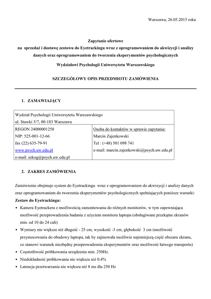 Warszawa, 26.05.2015 roku Zapytanie ofertowe na sprzedaż i dostawę zestawu do Eyetrackingu wraz z oprogramowaniem do akwizycji i analizy danych oraz oprogramowaniem do tworzenia eksperymentów psychologicznych Wydziałowi Psychologii Uniwersytetu Warszawskiego SZCZEGÓŁOWY OPIS PRZEDMIOTU ZAMÓWIENIA 1. ZAMAWIAJĄCY Wydział Psychologii Uniwersytetu Warszawskiego ul. Stawki 5/7, 00-183 Warszawa REGON 24000001258 Osoba do kontaktów w sprawie zapytania: NIP: 525-001-12-66 Marcin Zajenkowski fax (22) 635-79-91 Tel : (+48) 501 098 741 www.psych.uw.edu.pl e-mail: [email protected] e-mail: [email protected] 2. ZAKRES ZAMÓWIENIA Zamówienie obejmuje system do Eyetrackingu wraz z oprogramowaniem do akwizycji i analizy danych oraz oprogramowaniem do tworzenia eksperymentów psychologicznych spełniających poniższe warunki: Zestaw do Eyetrackingu: • Kamera Eyetrackera z możliwością zamontowania do różnych monitorów, w tym zapewniająca możliwość przeprowadzenia badania z użyciem monitora laptopa (obsługiwane przekątne ekranów min. od 10 do 24 cali) • Wymiary nie większe niż długość - 25 cm, wysokość -3 cm, głębokość 3 cm (możliwość przymocowania do obudowy laptopa, tak by zajmowała możliwie najmniejszą część obszaru ekranu, co stanowi warunek niezbędny przeprowadzenia eksperymentów oraz możliwość łatwego transportu) • Częstotliwość próbkowania urządzenia min. 250Hz. • Niedokładność próbkowania nie większa niż 0.4% • Latencja przetwarzania nie większa niż 8 ms dla 250 Hz • Całkowita latencja przetwarzania nie większa niż 10 ms • Maksymalny ruch głową bez przerwania śledzenia nie mniejszy niż 70cm/s (45cm/s dla 250Hz) • Swobodne ruchy głową (urządzenie nie wymaga stabilizatora na głowę) • Możliwość szybkiej kalibracji (z wykorzystaniem 0-5 punktów odniesienia). • Monitor LCD o przekątnej min. 22 cali i rozdzielczości min. 1920x1080 pikseli. • Jeden komputer przenośny (laptop) dostosowany do obsługi systemu Eyetrackingowego • Walizka transportowa mieszcząca system do Eyetrackingu oraz laptopa. Oprogramowanie do obsługi Eyetrackera • Oprogramowanie umożliwiające przygotowania eksperymentów (bez konieczności znajomości języków programowania, z wykorzystaniem bodźców statycznych – pliki pdf, obrazy; stworzenie kwestionariuszy); akwizycji; wizualizacji (m.in. mapy ciepła – heatmap, ścieżki wzroku – scanpath, mapy skupień - focusmap, wskaźniki statystyczne w oparciu o rejony zainteresowań - AOI) i wstępnej obróbki danych (wyniki surowe dotyczące ruchów oka oraz reakcji osoby badanej, możliwość eksportu danych do programów statystycznych SPSS, MatLab) • Oprogramowanie do obsługi Eyetrackera musi umożliwiać synchronizację z oprogramowaniem EPrime oraz Presentation • Oprogramowanie musi umożliwiać obserwowanie przebiegu badania w innym pomieszczeniu niż osoba badana oraz zdalne monitorowanie i wpływanie na jego przebieg (rozpoczynanie, kończenie). • Oprogramowanie musi zapewniać możliwość dożywotniej aktualizacji do najnowszej wersji oferowanej przez producenta. Oprogramowanie do tworzenia eksperymentów komputerowych i eyetrackingowych – specyfikacja • Prezentacja obrazów w formatach *.bmp, *.jpg, *.jpeg, *gif, *.png, *.tif, *.tiff, *.emf, *.wmf • Prezentacja filmów w formatach MPEG, AVI, WMV • Prezentacja dźwięków w różnych formatach, w tym MP3 i WMA, długość dźwięków co najmniej 2 minuty • Prezentacja bodźców przy użyciu znaków spoza języka angielskiego przy użyciu czcionek UNICODE • Nagrywanie dźwięków i odpowiedzi badanych • Możliwość wykorzystanie portu szeregowego i równoległego w eksperymentach • Możliwość integracji z Eyetrackerem Instalacja i szkolenia : • pełna instalacja i uruchomienie zakupionego systemu w siedzibie Zamawiającego oraz warsztaty w czasie których zademonstrowane zostanie oprogramowanie: od przygotowania, przez przeprowadzenie eksperymentu na jednej osobie badanej przez przedstawienia wyników prostej analizy statystycznej (w sumie nie mniej niż 6 godzin, w ciągu jednego dnia) • W ramach warsztatów zostaną przekazane wszystkie inne ważne informacje niezbędne do poprawnego korzystania z systemu. • Salę i infrastrukturę do w/w szkoleń zapewnia Zamawiający. Uwagi: • Dostarczone i zainstalowane systemy mają być gotowe do działania. • Gwarancja minimum 24 miesiące na system do Eyetrackingu wraz z laptopem i monitorem, liczone od daty podpisania protokołu odbioru. • Oferowany sprzęt musi być fabrycznie nowy. Warunki udziału w postępowaniu O udzielenie zamówienia mogą ubiegać się Wykonawcy, którzy spełniają warunki określone w art. 22 ustawy, dotyczące: • posiadania uprawnień do wykonywania określonej działalności lub czynności, jeżeli przepisy prawa nakładają obowiązek ich posiadania; • posiadania wiedzy i doświadczenia; • dysponowania odpowiednim potencjałem technicznym oraz osobami zdolnymi do wykonania zamówienia; • sytuacji ekonomicznej i finansowej W celu potwierdzenia, że oferowane dostawy spełniają wymagania określone przez Zamawiającego, Wykonawca ma obowiązek załączyć szczegółowy opis oferowanego sprzętu i oprogramowania lub specyfikację techniczną oferowanego sprzętu i oprogramowania w celu weryfikacji wymagań określonych przez Zamawiającego w SIWZ. Zamawiający nie dopuszcza składania ofert częściowych. W części 2 dopuszcza się składnie oferty wspólnej kilku podmiotów zgodnie z Art 23 Ustawy o Zamówieniach Publicznych. Zgodnie z Art 23. ustęp 4 Zamawiający będzie żądał umowy regulującej współpracę wykonawców przed zawarciem umowy w sprawie zamówienia publicznego. 1. TERMIN REALIZACJI ZAMÓWIENIA – w ciągu 60 dni od daty podpisania umowy, w uzasadnionych przypadkach Zamawiający zastrzega sobie prawo do przesunięcia terminu rozpoczęcia realizacji zamówienia. 2. OPIS SPOSOB