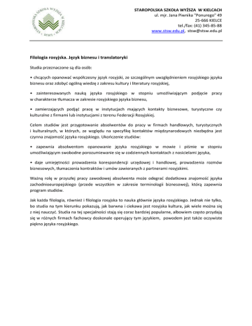STAROPOLSKA SZKOŁA WYŻSZA W KIELCACH ul. mjr. Jana Piwnika "Ponurego" 49 25-666 KIELCE tel./fax: (41) 345-85-88 www.stsw.edu.pl, [email protected] Filologia rosyjska. Język biznesu i translatoryki Studia przeznaczone są dla osób: • chcących opanować współczesny język rosyjski, ze szczególnym uwzględnieniem rosyjskiego języka biznesu oraz zdobyć ogólną wiedzę z zakresu kultury i literatury rosyjskiej, • zainteresowanych nauką języka rosyjskiego w stopniu umożliwiającym podjęcie pracy w charakterze tłumacza w zakresie rosyjskiego języka biznesu, • zamierzających podjąć pracę w instytucjach mających kontakty biznesowe, turystyczne czy kulturalne z firmami lub instytucjami z terenu Federacji Rosyjskiej. Celem studiów jest przygotowanie absolwentów do pracy w firmach handlowych, turystycznych i kulturalnych, w których, ze względu na specyfikę kontaktów międzynarodowych niezbędna jest czynna znajomość języka rosyjskiego. Ukończenie studiów: • zapewnia absolwentom opanowanie języka rosyjskiego w mowie i piśmie w stopniu umożliwiającym swobodne porozumiewanie się w codziennych kontaktach z nosicielami języka, • daje umiejętności prowadzenia korespondencji urzędowej i handlowej, prowadzenia rozmów biznesowych, tłumaczenia kontraktów i umów zawieranych z partnerami rosyjskimi. Ważną rolę w przyszłej pracy zawodowej absolwenta może odegrać dodatkowa znajomość języka zachodnioeuropejskiego (przede wszystkim w zakresie terminologii biznesowej), którą zapewnia program studiów. Jak każda filologia, również i filologia rosyjska to nauka głównie języka rosyjskiego. Jednak nie tylko, bo studia na tym kierunku pokazują, jak barwna i ciekawa jest rosyjska kultura, jak wiele można się z niej nauczyć. Studia na tej specjalności stają się coraz bardziej popularne, albowiem często przydają się w różnych firmach fachowcy doskonale operujący tym językiem, powodem jest także oczywiste piękno języka rosyjskiego.