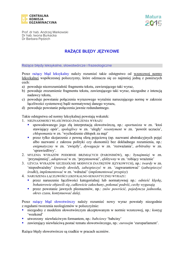 Prof. dr hab. Andrzej Markowski Dr hab. Iwona Burkacka Dr Barbara Pędzich RAŻĄCE BŁĘDY JĘZYKOWE Rażące błędy leksykalne, słowotwórcze i frazeologiczne Przez rażący błąd leksykalny należy rozumieć takie odstępstwo od wzorcowej normy leksykalnej współczesnej polszczyzny, które odznacza się co najmniej jedną z poniższych cech: a) powoduje niezrozumiałość fragmentu tekstu, zawierającego taki wyraz, b) powoduje zrozumienie fragmentu tekstu, zawierającego taki wyraz, niezgodne z intencją nadawcy tekstu, c) powoduje powstanie połączenia wyrazowego wyraźnie naruszającego normę w zakresie łączliwości systemowej bądź normatywnej danego wyrazu, d) powoduje powstanie połączenia jawnie redundantnego. Takie odstępstwa od normy leksykalnej powstają wskutek: 1. NIEZNAJOMOŚCI WŁAŚCIWEGO ZNACZENIA WYRAZU spowodowanego jego złą interpretacją słowotwórczą, np.: oportunista w zn. ‘ktoś stawiający opór’, spolegliwy w zn. ‘uległy’ resentyment w zn. ‘powrót uczucia’, chłopomania w zn. ‘wychodzenie chłopek za mąż’ przez tylko skojarzenie z pewną sferą pojęciową (np. nazwami abstrakcyjnych pojęć albo nazwami z zakresu polityki czy ekonomii) bez dokładnego rozumienia, np.: enigmatyczny w zn. ‘zwięzły’, dywagacje w zn. ‘rozważania’, arbitralny w zn. ‘sprawiedliwy’. 2. MYLENIA WYRAZÓW PODOBNIE BRZMIĄCYCH (PARONIMÓW), np.: bynajmniej w zn. ‘przynajmniej’, adoptować w zn. ‘przystosować’, efektywny w zn. ‘robiący wrażenie’ 3. UŻYCIA WYRAZÓW SZCZEGÓLNIE MODNYCH (NATRĘTÓW JĘZYKOWYCH), np.: twardy w zn. ‘niepodważalny’ (twardy dowód), zabezpieczyć w zn. ‘zagwarantować’ (zabezpieczyć środki), implementować w zn. ‘wdrażać’ (implementować przepisy) 4. NARUSZENIA ŁĄCZLIWOŚCI LEKSYKALNO-SEMANTYCZNEJ WYRAZU: przez naruszenie łączliwości kategorialnej lub normatywnej np.: odnieść klęskę, bohaterowie objawili się, całkowicie zakochany, pokonać podróż, cechy wygasają przez powstanie jawnych pleonazmów, np.: znów powrócić, pojedyncza jednostka, okres czasu, kontynuować dalej. Przez rażący błąd słowotwórczy należy rozumieć nowy wyraz powstały niezgodnie z regułami tworzenia neologizmów w polszczyźnie: niezgodny z modelem słowotwórczym akceptowanym w normie wzorcowej, np.: kontyg ‘weekend’ utworzony niewłaściwym formantem, np.: babciowy ‘babciny’ zawierający niewłaściwą postać tematu słowotwórczego, np.: eurosejm ‘europarlament’. Rażące błędy słowotwórcze są rzadkie w pracach uczniów. Przez rażący błąd frazeologiczny należy rozumieć takie odstępstwo od wzorcowej normy frazeologicznej współczesnej polszczyzny, które odznacza się co najmniej jedną z następujących cech: a) powoduje niezrozumiałość tekstu zawierającego dany frazeologizm, b) powoduje zrozumienie frazeologizmu niezgodne z jego znaczeniem, c) powoduje w danym kontekście udosłownienie znaczenia elementów tworzących frazeologizm. Takie odstępstwa od normy frazeologicznej powstają wskutek: niezrozumienia znaczenia użytego związku frazeologicznego, np.: rozpisują się oni do granic możliwości modyfikacji jego formy (wymiany, rozszerzenia, skrócenia bądź kontaminacji składu leksykalnego), np.: [miłość] odgórnie skazana na niepowodzenie, [dramaty] dokładnie wytykają nam palcem, utwory, których harmonia i ekspresyjność uczuć dotykają każdą duszę umieszczenia związku w niewłaściwym kontekście, np.: Wokulski był ofiarą losu, kiedy starał się zrobić coś użytecznego. Rażące błędy fleksyjne Za rażące błędy fleksyjne należy uznać takie odstępstwa od wzorcowej normy fleksyjnej współczesnej polszczyzny, które dotyczą wyrazów powszechnie znanych, często używanych i odnoszących się do codziennych realiów, utrudniają właściwą interpretację tekstu lub budzą skojarzenia niezgodne z intencją nadawcy. Do rażących odstępstw od normy językowej należy więc zaliczyć następujące typy błędów fleksyjnych: 1. W ZAKRESIE FLEKSJI RZECZOWNIKÓW POSPOLITYCH Przypisanie rzeczownikowi niewłaściwego rodzaju gramatycznego, np. *ta komponenta, *ten pomarańcz. Wybór niewłaściwej postaci mianownika liczby pojedynczej, np. *boginia, *ideja, *gałęź. Wybór niewłaściwej końcówki fleksyjnej, np. *kotowi, *w cudzysłowiu, *przyjacielami. Wybór niewłaściwej postaci tematu fleksyjnego, np. *o kwiacie, *w gniaździe, *(tego) znamia. 2. W ZAKRESIE FLEKSJI NAZW WŁASNYCH Błędna odmiana nazwiska lub nieodmienianie nazwiska, któremu można przypisać wzorzec odmiany, np.: *(utwory) Fredra, * z Bonapartym, *(obrazy) Picasso. Błędna odmiana nazwy geograficznej lub nieodmienianie nazwy, której można przypisać wzorzec odmiany, np. *w Zakopanym, *z Kołobrzega, *w Niemcach,*z Liverpool. 3. W ZAKRESIE FLEKSJI CZASOWNIKÓW Używanie niewłaściwej postaci bezokolicznika, np. *wziąć, *schuść, *pęc. Odmiana czasowników zakończonych na -ać wg niewłaściwego wzorca, np. *depta, *gwizda, *trzymie. Niepoprawna odmiana czasowników o zakończeniu -ywać, np. *porównywuje, *dorównywujący, *dokonywujący. Używanie niepoprawnych form 1. os. lp czasu przeszłego rodz. męskiego, np. *zaczęłem, *wzięłem *przyszłem. Używanie niepoprawnych form czasu przeszłego rodz. żeńskiego, np. *dmuchła, *poślizła się, *trzasła. Nieuwzględnianie wymian głoskowych w odmianie czasowników, np. *gnietą, *zawiezą. Używanie w 3 os. lm form z głoską miękką w wypadku czasowników zachowujących w odmianie głoskę twardą (lub odwrotnie), np. *rwią, *tłuczą, *kłamą. Używanie skróconych postaci czasowników umieć i rozumieć w 3 os. lm czasu teraźniejszego: *umią, *rozumią. 4. W ZAKRESIE FLEKSJI POZOSTAŁYCH CZĘŚCI MOWY Błędy w odmianie przymiotników, takie jak *bardziej wyższy, *niebieściejszy. Błędy w odmianie liczebników, takie jak *dwiestu, *czterdziestoro. Błędy w odmianie zai