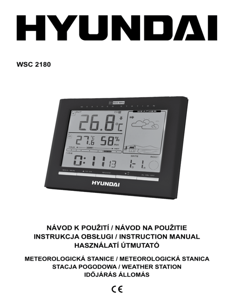 wsC 2180 NÁVOD K POUŽITÍ / NÁVOD NA POUŽITIE INSTRUKCJA OBSŁUGI / INSTRUCTION MANUAL HASZNÁLATÍ ÚTMUTATÓ METEOROLOGICKÁ STANICE / METEOROLOGICKÁ STANICA STACJA POGODOWA / WEATHER STATION IDŐJÁRÁS ÁLLOMÁS 1. Vlastnosti 1.1 Předpověď počasí -- Animace pro slunečno, polojasno, oblačno, zataženo s deštěm a sněžení 1.2 Čas -- Čas řízený rádiem s možností manuálního nastavení času -- Nastavení dvojího času -- Režim 12/24 hod. volitelný uživatelem -- Funkce dvojího denního budíku s přispáním -- Věčný kalendářní do roku 2099 -- Den v týdnu v 8 jazycích volitelných uživatelem 1.3 Vlhkost -- Měřitelný rozsah: 20 až 99 % -- Paměť pro maximum a minimum 1.4 Teplota -- Měřitelný rozsah vnitřní teploty: 0 až 50 °C (+32 až +122 °F) -- Uživatelem volitelné jednotky měření °C/°F -- Měřitelný rozsah venkovní teploty: -20 až 50 °C (-4 až +122 °F) -- Paměť pro maximum a minimum (vnitřní a venkovní) -- Pruh ukazatele komfortu 1.5 Bezdrátový venkovní senzor -- Indikátor slabé baterie pro venkovní teplotní senzor -- Upevnění na zeď nebo postavení na stůl -- Jeden bezdrátový teplotní senzor je součástí balení -- Vysílací rádiová frekvence 433 MHz -- Vysílací dosah v otevřeném prostoru 30 metrů (98 stop) CZ - 2 CZ 2. Vzhled hlavní jednotky 2.1 Část A – LCD A1: Kanál venkovní teploty A2: Tendence venkovní teploty A3: Venkovní teplota A4: Vnitřní teplota A5: Vnitřní vlhkost A6: Pruh indikátoru komfortu A7: Čas ovládaný rádiovým signálem A8: Tendence tlaku vzduchu A9: Předpověď počasí A10: Datum A11: Fáze měsíce 2.2 Část B – Tlačítka B1: Tlačítko „SNOOZE/LIGHT“ (Přispání/Světlo) B2: Tlačítko „MAX/MIN“ B3: Tlačítko „▲ 12/24“ B4: Tlačítko „MODE“ (Režim) B5: B6: B7: B8: B9: 2.3 Část C – Součásti C1: Otvor pro upevnění na stěnu C2: Kryt baterií C3: Stojan CZ - 3 Tlačítko „▼/ “ Přepínač „AL ON/OFF“ (Budík zap./vyp.) Tlačítko „RESET“ (Resetování) Tlačítko „WEATHER“ (Počasí) Tlačítko „CHANNEL“ (Kanál) 3. Venkovní teplotní senzor D1: LED kontrolka přenosu D2: Venkovní teplota D3: Prostor pro baterie D4: Otvor pro upevnění na stěnu D5: Tlačítko „RESET“ (Resetování) D6: Přepínač volby kanálů D7: Zástrčka a konektor teplotní sondy D8: Stojan 4. Začínáme: 4.1 Hlavní jednotka: • Vysunutím otevřete kryt prostoru pro baterie hlavní jednotky [C2] • Vložte 2 baterie AA s dodržením polarity [označení „+“ a „–“] • Nasaďte zpět kryt prostoru pro baterie hlavní jednotky [C2] • Pomocí špendlíku stiskněte tlačítko „RESET“ [B7] na zadní straně hlavní jednotky. Nyní je hlavní jednotka připravena k použití 4.2 Venkovní teplotní senzor • Prostor pro baterie (D3) teplotního senzoru se nachází za zadním krytem, otevřete jej odšroubováním • Vložte 2 baterie AAA s dodržením polarity [označení „+“ a „–“] 5. Instalace 5.1 Hlavní jednotka Hlavní jednotku lze položit na jakýkoliv plochý povrch (C3) nebo může být upevněna na stěnu za otvor pro zavěšení (C1) na zadní straně přístroje. 5.2 Venkovní teplotní senzor Dálkový senzor je třeba bezpečně upevnit na vodorovný povrch. Poznámka: Přenos mezi přijímačem a vysílačem lze uskutečnit až do vzdálenosti 30 m v otevřeném prostoru. Otevřený prostor: bez rušících překážek jako jsou budovy, stromy, vozidla, vedení vysokého napětí, atd. CZ - 4 CZ 6. Funkce předpovědi počasí 6.1 Provoz • Po vložení baterií nebo podržení tlačítka „WEATHER“ (Počasí) (B8) po dobu 3 vteřin začne na LCD displeji blikat ikona počasí (A9). Aktuální počasí zadejte stisknutím tlačítka „▲“ (B3) nebo „▼“ (B5). Stisknutím tlačítka „WEATHER“ (B8) nastavení potvrďte. Pokud správně nevložíte aktuální počasí, pak předpověď počasí nemusí být přesná. • Aktuální stav počasí je třeba zadat znovu, pokud se změní nadmořská výška hlavní jednotky. (Barometrický tlak je v místech s vyšší nadmořskou výškou nižší. Proto má změna nadmořské výšky vliv na předpověď počasí). Meteorologická stanice provede první předpověď 6 hodin po zadání aktuálního stavu počasí. 6.2 Počasí V předpovědi počasí je celkem 5 různých animací stavu počasí. Slunečno Polojasno Oblačno Zataženo s deštěm Mráz nebo sněžení Poznámka: “Mráz nebo sněžení“ se zobrazí, pokud je předpověď počasí zataženo s deštěm a venkovní teplota (kteréhokoliv kanálu) je nižší než 0 °C. “ se • Upozornění na námrazu: Symbol „ zobrazí, pokud je venkovní teplota (kteréhokoliv kanálu) mezi -2 °C a +3 °C. • Pokud existuje rozpor mezi předpovědí počasí místní meteorologické stanice a tímto přístrojem, pak má přednost předpověď místní meteorologické stanice. Výrobce neodpovídá za problémy, které mohou nastat v důsledku nesprávné předpovědi počasí z tohoto přístroje. CZ - 5 6.3 Ukazatel tendence barometrického tlaku (A8) Ukazatel tendence zobrazený na LCD displeji (A8) ukazuje tendenci barometrického tlaku. Znamená, že tendence barometrického tlaku je stoupající Znamená, že tendence barometrického tlaku je stálá Znamená, že tendence barometrického tlaku je klesající 7. Teploměr 7.1 Přenos na rádiové frekvenci: • Po nastavení počasí hlavní jednotka automaticky spustí přenos venkovní teploty z venkovního teplotního senzoru. • Jednotka teplotního senzoru automaticky přenese signál do hlavní jednotky po vložení baterií. • Máte-li více než jeden externí vysílač (maximálně 3), zvolte kanál CH1, CH2 nebo CH3, abyste před vložením baterií zajistili, že každý senzor bude vysílat na jiném kanále. Přepínač volby kanálů (D6) je na zadní straně teplotního senzoru.