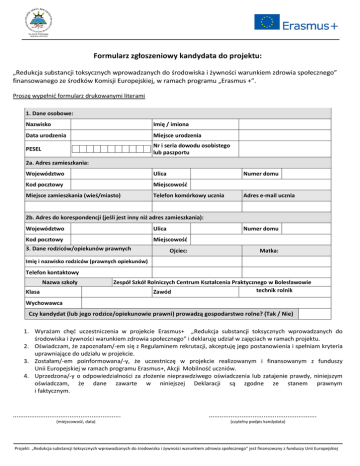 Formularz zgłoszeniowy kandydata do projektu: „Redukcja substancji toksycznych wprowadzanych do środowiska i żywności warunkiem zdrowia społecznego” finansowanego ze środków Komisji Europejskiej, w ramach programu „Erasmus +”. Proszę wypełnić formularz drukowanymi literami 1. Dane osobowe: Nazwisko Imię / imiona Data urodzenia Miejsce urodzenia PESEL Nr i seria dowodu osobistego lub paszportu 2a. Adres zamieszkania: Województwo Ulica Numer domu Kod pocztowy Miejscowość Miejsce zamieszkania (wieś/miasto) Telefon komórkowy ucznia Adres e-mail ucznia 2b. Adres do korespondencji (jeśli jest inny niż adres zamieszkania): Województwo Ulica Kod pocztowy Miejscowość 3. Dane rodziców/opiekunów prawnych Numer domu Ojciec: Matka: Imię i nazwisko rodziców (prawnych opiekunów) Telefon kontaktowy Nazwa szkoły Klasa Zespół Szkół Rolniczych Centrum Kształcenia Praktycznego w Bolesławowie technik rolnik Zawód Wychowawca Czy kandydat (lub jego rodzice/opiekunowie prawni) prowadzą gospodarstwo rolne? (Tak / Nie) 1. Wyrażam chęć uczestniczenia w projekcie Erasmus+ „Redukcja substancji toksycznych wprowadzanych do środowiska i żywności warunkiem zdrowia społecznego” i deklaruję udział w zajęciach w ramach projektu. 2. Oświadczam, że zapoznałam/-em się z Regulaminem rekrutacji, akceptuję jego postanowienia i spełniam kryteria uprawniające do udziału w projekcie. 3. Zostałam/-em poinformowana/-y, że uczestniczę w projekcie realizowanym i finansowanym z funduszy Unii Europejskiej w ramach programu Erasmus+, Akcji Mobilność uczniów. 4. Uprzedzona/-y o odpowiedzialności za złożenie nieprawdziwego oświadczenia lub zatajenie prawdy, niniejszym oświadczam, że dane zawarte w niniejszej Deklaracji są zgodne ze stanem prawnym i faktycznym. ........................................................... (miejscowość, data) ........................................................... (czytelny podpis kandydata) Projekt: „Redukcja substancji toksycznych wprowadzanych do środowiska i żywności warunkiem zdrowia społecznego” jest finansowany z funduszy Unii Europejskiej