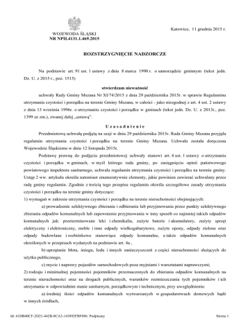 Katowice, 11 grudnia 2015 r. WOJEWODA ŚLĄSKI NR NPII.4131.1.469.2015 ROZSTRZYGNIĘCIE NADZORCZE Na podstawie art. 91 ust. 1 ustawy z dnia 8 marca 1990 r. o samorządzie gminnym (tekst jedn. Dz. U. z 2015 r., poz. 1515) stwierdzam nieważność uchwały Rady Gminy Mszana Nr XI/74/2015 z dnia 29 października 2015r. w sprawie Regulaminu utrzymania czystości i porządku na terenie Gminy Mszana, w całości - jako niezgodnej z art. 4 ust. 2 ustawy z dnia 13 września 1996r. o utrzymaniu czystości i porządku w gminach (tekst jedn. Dz. U. z 2013r., poz. 1399 ze zm.), zwanej dalej „ustawą”. Uzasadnienie Przedmiotową uchwałą podjętą na sesji w dniu 29 października 2015r. Rada Gminy Mszana przyjęła regulamin utrzymania czystości i porządku na terenie Gminy Mszana. Uchwała została doręczona Wojewodzie Śląskiemu w dniu 12 listopada 2015r. Podstawę prawną do podjęcia przedmiotowej uchwały stanowi art. 4 ust. 1 ustawy o utrzymaniu czystości i porządku w gminach, w myśl którego rada gminy, po zasięgnięciu opinii państwowego powiatowego inspektora sanitarnego, uchwala regulamin utrzymania czystości i porządku na terenie gminy. Ustęp 2 ww. artykułu określa natomiast enumeratywnie elementy, jakie powinien zawierać uchwalany przez radę gminy regulamin. Zgodnie z treścią tego przepisu regulamin określa szczegółowe zasady utrzymania czystości i porządku na terenie gminy dotyczące: 1) wymagań w zakresie utrzymania czystości i porządku na terenie nieruchomości obejmujących: a) prowadzenie selektywnego zbierania i odbierania lub przyjmowania przez punkty selektywnego zbierania odpadów komunalnych lub zapewnienie przyjmowania w inny sposób co najmniej takich odpadów komunalnych jak: przeterminowane leki i chemikalia, zużyte baterie i akumulatory, zużyty sprzęt elektryczny i elektroniczny, meble i inne odpady wielkogabarytowe, zużyte opony, odpady zielone oraz odpady budowlane i rozbiórkowe stanowiące odpady komunalne, a także odpadów komunalnych określonych w przepisach wydanych na podstawie art. 4a , b) uprzątanie błota, śniegu, lodu i innych zanieczyszczeń z części nieruchomości służących do użytku publicznego, c) mycie i naprawy pojazdów samochodowych poza myjniami i warsztatami naprawczymi; 2) rodzaju i minimalnej pojemności pojemników przeznaczonych do zbierania odpadów komunalnych na terenie nieruchomości oraz na drogach publicznych, warunków rozmieszczania tych pojemników i ich utrzymania w odpowiednim stanie sanitarnym, porządkowym i technicznym, przy uwzględnieniu: a) średniej ilości odpadów komunalnych wytwarzanych w gospodarstwach domowych bądź w innych źródłach, Id: 41DB40CF-2D21-442B-8CA3-143892FBF086. Podpisany Strona 1 b) liczby osób korzystających z tych pojemników; 3) częstotliwości i sposobu pozbywania się odpadów komunalnych i nieczystości ciekłych z terenu nieruchomości oraz z terenów przeznaczonych do użytku publicznego; 4) (uchylony); 5) innych wymagań wynikających z wojewódzkiego planu gospodarki odpadami; 6) obowiązków osób utrzymujących zwierzęta domowe, mających na celu ochronę przed zagrożeniem lub uciążliwością dla ludzi oraz przed zanieczyszczeniem terenów przeznaczonych do wspólnego użytku; 7) wymagań utrzymywania zwierząt gospodarskich na terenach wyłączonych z produkcji rolniczej, w tym także zakazu ich utrzymywania na określonych obszarach lub w poszczególnych nieruchomościach; 8) wyznaczania obszarów podlegających obowiązkowej deratyzacji i terminów jej przeprowadzania. Wskazać należy, iż przyznane radzie gminy kompetencje do uchwalenia przedmiotowego regulaminu, ograniczone zostały do ustalenia w tymże regulaminie szczegółowych zasad utrzymania czystości i porządku na terenie gminy w zakresie ściśle określonym. Katalog spraw, w zakresie których ustawodawca upoważniła radę gminy do określenia szczegółowych zasad postępowania jest bowiem zamknięty i rada gminy może dokonywać regulacji prawnych tylko w takim zakresie, w jakim została do tego upoważniona. Podkreślić należy, iż elementy wskazane w powyższym przepisie mają charakter wyczerpujący, nie jest zatem dopuszczalna wykładnia rozszerzająca zastosowania tego przepisu w odniesieniu do innych kwestii, które nie zostały w nim wymienione (por. wyrok NSA z dnia 8 listopada 2012r., sygn. akt II OSK 2012/12; wyrok WSA we Wrocławiu z dnia 30 listopada 2006r., sygn. akt II SA/Wr 527/06; wyrok WSA w Rzeszowie z dnia 23 października 2007r., sygn. akt II SA/Rz 59/07, Centralna Baza Orzeczeń Sądów Administracyjnych, http://orzeczenia.nsa.gov.pl). Wydawany na podstawie art. 4 ust. 2 ustawy regulamin stanowi prawo miejscowe i winien kompleksowo regulować zawartą w nim materię. W doktrynie i judykaturze przyjmuje się, iż rada gminy winna ująć w regulaminie uchwalanym na podstawie art. 4 ust. 2 ustawy wszystkie kwestie wskazane w tym przepisie, a brak któregoś z wyszczególnionych w nim elementów skutkuje istotnym naruszeniem prawa (por. wyrok Wojewódzki Sąd Administracyjny w Gliwicach z dnia 8 listopada 2007r. sygn. akt II SA/Gl 531/07, wyrok Wojewódzkiego Sądu Administracyjnego w Bydgoszczy z dnia 14 grudnia 2006r. sygn. akt II SA/Bd 845/2006, Centralna Baza Orzeczeń Sądów Administracyjnych, http://orzeczenia.nsa.gov.pl oraz Kazimierz Bandarzewski, Paweł Chmielnicki, Bogusław Dziadkiewicz "Komentarz do ustawy o utrzymaniu czystości i porządku w gminach" LexisNexis Warszawa 2007, str. 155 - 156). Tymczasem, zdaniem organu nadzoru, przedmiotowa uchwała nie wypełnia dyspozycji przepisu art. 4 ustawy, gdyż nie zawiera minimum postanowień, które zgodnie z zapisem ustawowym powinno się uwzględnić przy ustalaniu szczegółowych zasad utrzymania czystości i porządku na terenie gminy. Jednym z obligatoryjnych elementów regulaminu utrzymania czystości i porządku na terenie gminy jest określenie częstotliwości i sposobu pozbywania się odp