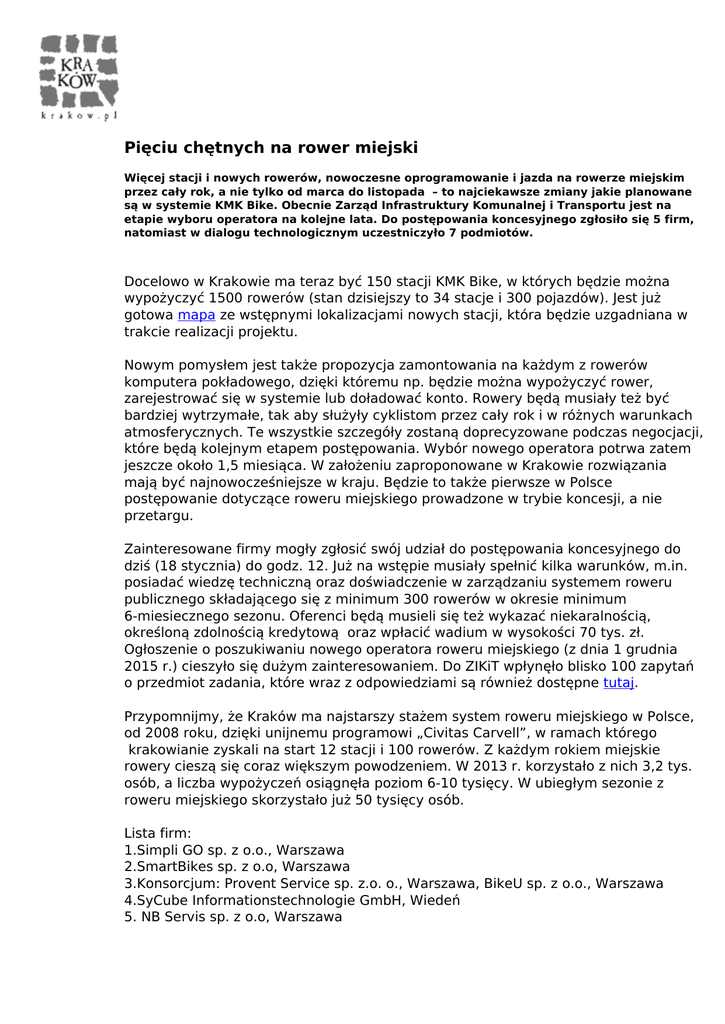 Pięciu chętnych na rower miejski Więcej stacji i nowych rowerów, nowoczesne oprogramowanie i jazda na rowerze miejskim przez cały rok, a nie tylko od marca do listopada – to najciekawsze zmiany jakie planowane są w systemie KMK Bike. Obecnie Zarząd Infrastruktury Komunalnej i Transportu jest na etapie wyboru operatora na kolejne lata. Do postępowania koncesyjnego zgłosiło się 5 firm, natomiast w dialogu technologicznym uczestniczyło 7 podmiotów. Docelowo w Krakowie ma teraz być 150 stacji KMK Bike, w których będzie można wypożyczyć 1500 rowerów (stan dzisiejszy to 34 stacje i 300 pojazdów). Jest już gotowa mapa ze wstępnymi lokalizacjami nowych stacji, która będzie uzgadniana w trakcie realizacji projektu. Nowym pomysłem jest także propozycja zamontowania na każdym z rowerów komputera pokładowego, dzięki któremu np. będzie można wypożyczyć rower, zarejestrować się w systemie lub doładować konto. Rowery będą musiały też być bardziej wytrzymałe, tak aby służyły cyklistom przez cały rok i w różnych warunkach atmosferycznych. Te wszystkie szczegóły zostaną doprecyzowane podczas negocjacji, które będą kolejnym etapem postępowania. Wybór nowego operatora potrwa zatem jeszcze około 1,5 miesiąca. W założeniu zaproponowane w Krakowie rozwiązania mają być najnowocześniejsze w kraju. Będzie to także pierwsze w Polsce postępowanie dotyczące roweru miejskiego prowadzone w trybie koncesji, a nie przetargu. Zainteresowane firmy mogły zgłosić swój udział do postępowania koncesyjnego do dziś (18 stycznia) do godz. 12. Już na wstępie musiały spełnić kilka warunków, m.in. posiadać wiedzę techniczną oraz doświadczenie w zarządzaniu systemem roweru publicznego składającego się z minimum 300 rowerów w okresie minimum 6-miesiecznego sezonu. Oferenci będą musieli się też wykazać niekaralnością, określoną zdolnością kredytową oraz wpłacić wadium w wysokości 70 tys. zł. Ogłoszenie o poszukiwaniu nowego operatora roweru miejskiego (z dnia 1 grudnia 2015 r.) cieszyło się dużym zainteresowaniem. Do ZIKiT wpłynęło blisko 100 zapytań o przedmiot zadania, które wraz z odpowiedziami są również dostępne tutaj. Przypomnijmy, że Kraków ma najstarszy stażem system roweru miejskiego w Polsce, od 2008 roku, dzięki unijnemu programowi „Civitas Carvell”, w ramach którego krakowianie zyskali na start 12 stacji i 100 rowerów. Z każdym rokiem miejskie rowery cieszą się coraz większym powodzeniem. W 2013 r. korzystało z nich 3,2 tys. osób, a liczba wypożyczeń osiągnęła poziom 6-10 tysięcy. W ubiegłym sezonie z roweru miejskiego skorzystało już 50 tysięcy osób. Lista firm: 1.Simpli GO sp. z o.o., Warszawa 2.SmartBikes sp. z o.o, Warszawa 3.Konsorcjum: Provent Service sp. z.o. o., Warszawa, BikeU sp. z o.o., Warszawa 4.SyCube Informationstechnologie GmbH, Wiedeń 5. NB Servis sp. z o.o, Warszawa Powered by TCPDF (www.tcpdf.org)