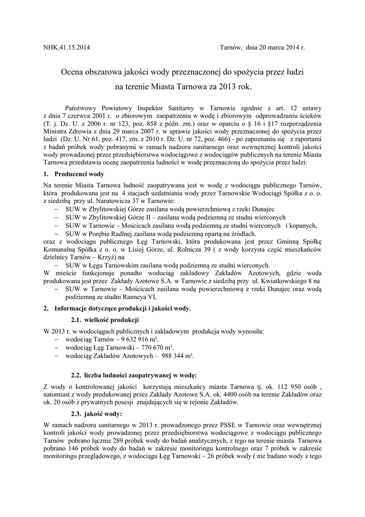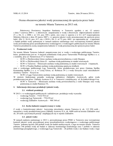 NHK.41.15.2014 Tarnów, dnia 20 marca 2014 r. Ocena obszarowa jakości wody przeznaczonej do spożycia przez ludzi na terenie Miasta Tarnowa za 2013 rok. Państwowy Powiatowy Inspektor Sanitarny w Tarnowie zgodnie z art. 12 ustawy z dnia 7 czerwca 2001 r. o zbiorowym zaopatrzeniu w wodę i zbiorowym odprowadzaniu ścieków (T. j. Dz. U. z 2006 r. nr 123, poz. 858 z późn. zm.) oraz w oparciu o § 16 i §17 rozporządzenia Ministra Zdrowia z dnia 29 marca 2007 r. w sprawie jakości wody przeznaczonej do spożycia przez ludzi (Dz. U. Nr 61, poz. 417, zm. z 2010 r. Dz. U. nr 72, poz. 466) - po zapoznaniu się z raportami z badań próbek wody pobranymi w ramach nadzoru sanitarnego oraz wewnętrznej kontroli jakości wody prowadzonej przez przedsiębiorstwa wodociągowe z wodociągów publicznych na terenie Miasta Tarnowa przedstawia ocenę zaopatrzenia ludności w wodę przeznaczoną do spożycia przez ludzi: 1. Producenci wody Na terenie Miasta Tarnowa ludność zaopatrywana jest w wodę z wodociągu publicznego Tarnów, która produkowana jest na 4 stacjach uzdatniania wody przez Tarnowskie Wodociągi Spółka z o. o. z siedzibą przy ul. Narutowicza 37 w Tarnowie: − SUW w Zbylitowskiej Górze zasilana wodą powierzchniową z rzeki Dunajec − SUW w Zbylitowskiej Górze II – zasilana wodą podziemną ze studni wierconych − SUW w Tarnowie – Mościcach zasilana wodą podziemną ze studni wierconych i kopanych, − SUW w Porębie Radlnej zasilana wodą podziemną opartą na źródłach. oraz z wodociągu publicznego Łęg Tarnowski, która produkowana jest przez Gminną Spółkę Komunalną Spółka z o. o. w Lisiej Górze, ul. Rolnicza 39 ( z wody korzysta część mieszkańców dzielnicy Tarnów – Krzyż) na − SUW w Łęgu Tarnowskim zasilana wodą podziemną ze studni wierconych. W mieście funkcjonuje ponadto wodociąg zakładowy Zakładów Azotowych, gdzie woda produkowana jest przez Zakłady Azotowe S.A. w Tarnowie z siedzibą przy ul. Kwiatkowskiego 8 na − SUW w Tarnowie – Mościcach zasilana wodą powierzchniową z rzeki Dunajec oraz wodą podziemną ze studni Ranneya VI, 2. Informacje dotyczące produkcji i jakości wody. 2.1. wielkość produkcji W 2013 r. w wodociągach publicznych i zakładowym produkcja wody wynosiła: − wodociąg Tarnów – 9 632 916 m³. − wodociąg Łęg Tarnowski – 770 670 m³. − wodociąg Zakładów Azotowych – 988 344 m³. 2.2. liczba ludności zaopatrywanej w wodę: Z wody o kontrolowanej jakości korzystają mieszkańcy miasta Tarnowa tj. ok. 112 950 osób , natomiast z wody produkowanej przez Zakłady Azotowe S.A. ok. 4400 osób na terenie Zakładów oraz ok. 20 osób z prywatnych posesji znajdujących się w rejonie Zakładów. 2.3. jakość wody: W ramach nadzoru sanitarnego w 2013 r. prowadzonego przez PSSE w Tarnowie oraz wewnętrznej kontroli jakości wody prowadzonej przez przedsiębiorstwa wodociągowe z wodociągu publicznego Tarnów pobrano łącznie 289 próbek wody do badań analitycznych, z tego na terenie miasta Tarnowa pobrano 146 próbek wody do badań w zakresie monitoringu kontrolnego oraz 7 próbek w zakresie monitoringu przeglądowego, z wodociągu Łęg Tarnowski – 26 próbek wody ( nie badano wody z tego wodociągu na terenie miasta Tarnowa), z wodociągu zakładowego Zakładów Azotowych. - 30 próbek wody. W zakresie wymagań mikrobiologicznych wykonane były oznaczenia wymienione w załącznikach 1 i 3 do rozporządzenia Ministra Zdrowia z dnia 29 marca 2007 w sprawie jakości wody przeznaczonej do spożycia przez ludzi (Dz. U. nr 61, poz.417, zm. z 2010 r. Dz. U. nr 72, poz. 466) i nie stwierdzono przekroczenia dopuszczalnych wartości wskaźników. W zakresie wskaźników fizycznych, chemicznych i organoleptycznych wykonane zostały oznaczenia wynikające z załączników 2, 3, 4 wymienionego wyżej rozporządzenia, i również nie stwierdzono przekroczenia dopuszczalnego stężenia badanych parametrów. Jakość wody w wodociągach publicznych, z których korzystają mieszkańcy miasta Tarnowa tj: z wodociągu Tarnów i Łęg Tarnowski, oraz z wodociągu zakładowego Zakładów Azotowych spełnia wymagania sanitarne i woda jest przydatna do spożycia przez ludzi. 2.4. przekroczenia wartości dopuszczalnych parametrów jakości wody: W 2013 r. nie stwierdzono przekroczeń. 2.5. postępowanie administracyjne: Nie stwierdzono nieprawidłowości i nie prowadzono postępowania administracyjnego. 2.6. działania naprawcze prowadzone przez przedsiębiorstwo wodociągowe: Nie prowadzono działań naprawczych dotyczących jakości wody. 3. Ocena ryzyka zdrowotnego: Mieszkańcy miasta Tarnowa są zaopatrywani w wodę bezpieczną dla zdrowia ludzkiego, wolną od mikroorganizmów chorobotwórczych i pasożytów w liczbie stanowiącej potencjalne zagrożenie dla zdrowia ludzkiego, oraz substancji chemicznych w ilościach zagrażających zdrowiu. Woda przeznaczona do spożycia przez ludzi na terenie miasta Tarnowa nie stanowi ryzyka dla zdrowia ludzi. NHK.41.17.2014 Tarnów, dnia 24 marca 2014 r. Ocena jakości wody przeznaczonej do spożycia przez ludzi z wodociągu zakładowego Grupa Azoty S.A. w Tarnowie za 2013 rok. Państwowy Powiatowy Inspektor Sanitarny w Tarnowie zgodnie z art. 12 ustawy z dnia 7 czerwca 2001 r. o zbiorowym zaopatrzeniu w wodę i zbiorowym odprowadzaniu ścieków (T.j. Dz. U. z 2006 r. nr 123, poz. 858 z późn. zm.) oraz w oparciu o § 16 i §17 rozporządzenia Ministra Zdrowia z dnia 29 marca 2007 r. w sprawie jakości wody przeznaczonej do spożycia przez ludzi (Dz. U. Nr 61, poz. 417, zm. z 2010 r. Dz. U. nr 72, poz. 466) - po zapoznaniu się z raportami z badań próbek wody pobranymi w ramach nadzoru sanitarnego oraz wewnętrznej kontroli jakości wody prowadzonej przez przedsiębiorstwo wodociągowo-kanalizacyjne z wodociągu zakładowego Grupa Azoty S.A. w Tarnowie przedstawia ocenę zaopatrzenia ludności w wodę przeznaczoną do spożycia przez ludzi: 1. Producenci wody Na ter
