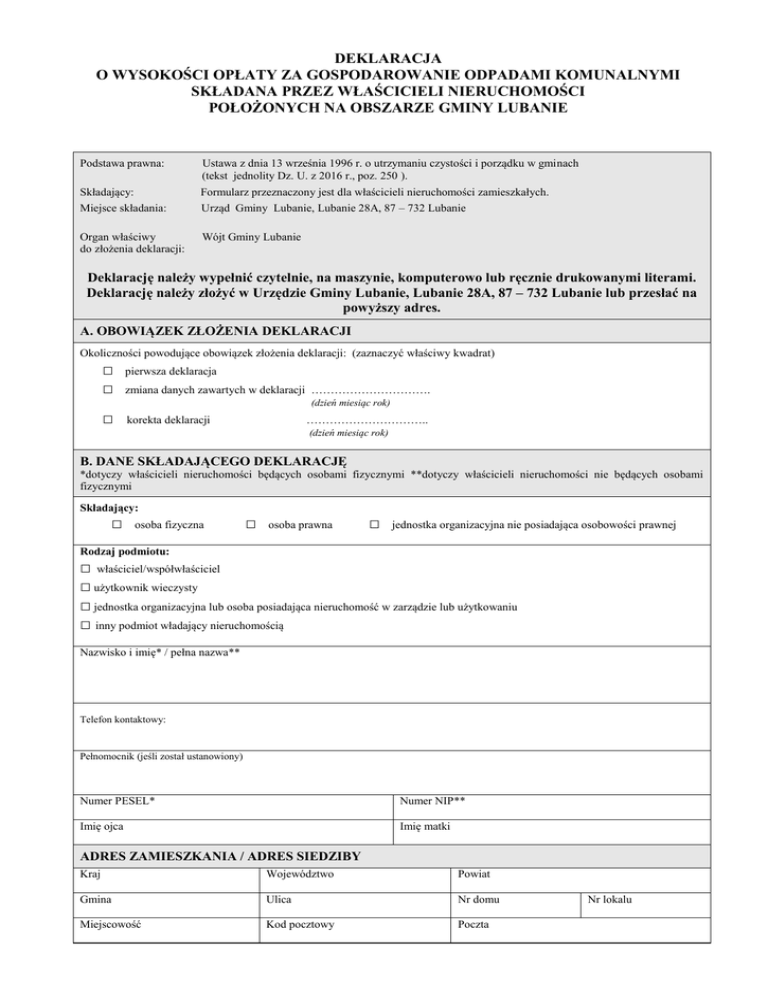 DEKLARACJA O WYSOKOŚCI OPŁATY ZA GOSPODAROWANIE ODPADAMI KOMUNALNYMI SKŁADANA PRZEZ WŁAŚCICIELI NIERUCHOMOŚCI POŁOŻONYCH NA OBSZARZE GMINY LUBANIE Podstawa prawna: Ustawa z dnia 13 września 1996 r. o utrzymaniu czystości i porządku w gminach (tekst jednolity Dz. U. z 2016 r., poz. 250 ). Składający: Formularz przeznaczony jest dla właścicieli nieruchomości zamieszkałych. Miejsce składania: Urząd Gminy Lubanie, Lubanie 28A, 87 – 732 Lubanie Organ właściwy do złożenia deklaracji: Wójt Gminy Lubanie Deklarację należy wypełnić czytelnie, na maszynie, komputerowo lub ręcznie drukowanymi literami. Deklarację należy złożyć w Urzędzie Gminy Lubanie, Lubanie 28A, 87 – 732 Lubanie lub przesłać na powyższy adres. A. OBOWIĄZEK ZŁOŻENIA DEKLARACJI Okoliczności powodujące obowiązek złożenia deklaracji: (zaznaczyć właściwy kwadrat) □ □ pierwsza deklaracja zmiana danych zawartych w deklaracji …………………………. (dzień miesiąc rok) □ ………………………….. korekta deklaracji (dzień miesiąc rok) B. DANE SKŁADAJĄCEGO DEKLARACJĘ *dotyczy właścicieli nieruchomości będących osobami fizycznymi **dotyczy właścicieli nieruchomości nie będących osobami fizycznymi Składający: □ osoba fizyczna □ osoba prawna □ jednostka organizacyjna nie posiadająca osobowości prawnej Rodzaj podmiotu: □ właściciel/współwłaściciel □ użytkownik wieczysty □ jednostka organizacyjna lub osoba posiadająca nieruchomość w zarządzie lub użytkowaniu □ inny podmiot władający nieruchomością Nazwisko i imię* / pełna nazwa** Telefon kontaktowy: Pełnomocnik (jeśli został ustanowiony) Numer PESEL* Numer NIP** Imię ojca Imię matki ADRES ZAMIESZKANIA / ADRES SIEDZIBY Kraj Województwo Powiat Gmina Ulica Nr domu Miejscowość Kod pocztowy Poczta Nr lokalu C. ADRES NIERUCHOMOŚCI, NA KTÓREJ POWSTAJĄ ODPADY KOMUNALNE Gmina Ulica Numer ewidencyjny działki (należy wypełnić w przypadku braku nadanego numeru porządkowego budynku) Nr domu Nr lokalu Kod pocztowy Poczta □ ZABUDOWA JEDNORODZINNA (budynek mieszkalny jednorodzinny lub zespół takich budynków, wraz z przeznaczonymi dla potrzeb mieszkających w nim osób budynkami garażowymi i gospodarczymi) ZABUDOWA WIELORODZINNA (budynek mieszkalny zawierający więcej niż dwa lokale mieszkalne, bądź zespół takich budynków) □ □ Blok Kamienica □ Budynek wielorodzinny D. OŚWIADCZENIE O SEGREGACJI ODPADÓW Oświadczam, iż z terenu mojej nieruchomości odpady komunalne będą zbierane w sposób selektywny: □ □ TAK NIE E. OŚWIADCZENIE O LICZBIE OSÓB ZAMIESZKUJĄCYCH NIERUCHOMOŚĆ Oświadczam, że w nieruchomości wskazanej w części C, liczba osób tworzących gospodarstwo domowe wynosi: ……….………………………………. (liczba osób) Wyliczenie miesięcznej opłaty: Gospodarstwo domowe jednoosobowe - ……………………………………. x …………………………………. = …………………………….. (stawka opłaty) 1 (liczba gospodarstw domowych) (wysokość opłaty)* Gospodarstwo domowe dwuosobowe - ……………………………………. x ……………………………….. = …………………………….. (stawka opłaty) 1 (liczba gospodarstw domowych) (wysokość opłaty)* Gospodarstwo domowe trzyosobowe - ……………………………………. x ……………………………... (stawka opłaty) 1 (liczba gospodarstw domowych) = ...………………………….. (wysokość opłaty)* Gospodarstwo domowe czteroosobowe - ……………………………………. x ………………………………... = …………………………….. (stawka opłaty) 1 (liczba gospodarstw domowych) (wysokość opłaty)* Gospodarstwo domowe pięcioosobowe - ..………………………………… (stawka opłaty) 1 x ………………………………... = …………………………….. (liczba gospodarstw domowych) (wysokość opłaty)* Gospodarstwo domowe sześcioosobowe lub większe ……………………………………. x ………………………………... = ……………………………. (stawka opłaty) 1 (liczba gospodarstw domowych) (wysokość opłaty)* Wysokość opłaty miesięcznej za gospodarowanie odpadami komunalnymi wynosi ……..…………………..……. zł. (słownie ……….……………………………………………………………………………………………..………... zł.) *wysokość opłaty stanowi iloczyn stawki opłaty i liczby gospodarstw domowych F. OŚWIADCZENIE I PODPIS SKŁADAJĄCEGO DEKLARACJĘ/OSOBY REPREZENTUJĄCEJ SKŁADAJĄCEGO DEKLARACJĘ Oświadczam, że wskazane przeze mnie dane są zgodne ze stanem faktycznym, ………………………………….. (miejscowość i data) …………………………………………. (czytelny podpis składającego d eklarację) G. ADNOTACJE ORGANU Pouczenie: 1) Niniejsza deklaracja stanowi podstawę do wystawienia tytułu wykonawczego, zgodnie z przepisami ustawy z dnia 17 czerwca 1966 r. o postępowaniu egzekucyjnym w administracji (Dz. U. z 2016r., Nr 599 ze zm.). 2) Właściciel nieruchomości zamieszkałej jest obowiązany złożyć do Urzędu Gminy Lubanie deklarację o wysokości opłaty za gospodarowanie odpadami komunalnymi w terminie 14 dni od dnia zamieszkania na danej nieruchomości pierwszego mieszkańca lub powstania na danej nieruchomości odpadów komunalnych. 3) W przypadku zmiany danych będących podstawą ustalenia wysokości należnej opłaty za gospodarowanie odpadami komunalnymi właściciel nieruchomości jest zobowiązany złożyć nową deklarację w terminie 14 dni od dnia nastąpienia zmiany. Opłatę za gospodarowanie odpadami komunalnymi w zmienionej wysokości uiszcza się za miesiąc, w którym nastąpiła zmiana. 4) W przypadku gdy w danym miesiącu na danej nieruchomości mieszkaniec zamieszkuje przez część miesiąca, op