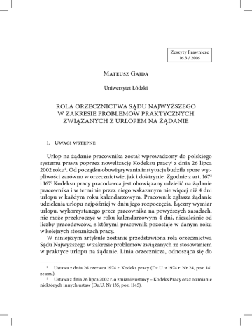 Zeszyty Prawnicze 16.3 / 2016 Mateusz Gajda Uniwersytet Łódzki ROLA ORZECZNICTWA SĄDU NAJWYŻSZEGO W ZAKRESIE PROBLEMÓW PRAKTYCZNYCH ZWIĄZANYCH Z URLOPEM NA ŻĄDANIE 1. Uwagi wstępne Urlop na żądanie pracownika został wprowadzony do polskiego systemu prawa poprzez nowelizację Kodeksu pracy1 z dnia 26 lipca 2002 roku 2. Od początku obowiązywania instytucja budziła spore wątpliwości zarówno w orzecznictwie, jak i doktrynie. Zgodnie z art. 1672 i 1673 Kodeksu pracy pracodawca jest obowiązany udzielić na żądanie pracownika i w terminie przez niego wskazanym nie więcej niż 4 dni urlopu w każdym roku kalendarzowym. Pracownik zgłasza żądanie udzielenia urlopu najpóźniej w dniu jego rozpoczęcia. Łączny wymiar urlopu, wykorzystanego przez pracownika na powyższych zasadach, nie może przekroczyć w roku kalendarzowym 4 dni, niezależnie od liczby pracodawców, z którymi pracownik pozostaje w danym roku w kolejnych stosunkach pracy. W niniejszym artykule zostanie przedstawiona rola orzecznictwa Sądu Najwyższego w zakresie problemów związanych ze stosowaniem w praktyce urlopu na żądanie. Linia orzecznicza, odnosząca się do 1 Ustawa z dnia 26 czerwca 1974 r. Kodeks pracy (Dz.U. z 1974 r. Nr 24, poz. 141 ze zm.). 2 Ustawa z dnia 26 lipca 2002 r. o zmianie ustawy – Kodeks Pracy oraz o zmianie niektórych innych ustaw (Dz.U. Nr 135, poz. 1145). 58 Mateusz Gajda [2] powołanych przepisów, ma duże znaczenie z powodu ich niejasności oraz licznych wątpliwości pojawiających się w praktyce. Wykładnia językowa regulacji może prowadzić do wniosku, że pracownikowi przysługuje bezwzględne prawo do skorzystania z urlopu na żądanie, niezależnie od woli pracodawcy. Analiza dotychczasowych wyroków SN w zakresie poruszanej problematyki prowadzi do wniosku, iż judykatura eksponuje rolę funkcji organizacyjnej prawa pracy i tym samym ogranicza swobodę korzystania przez pracowników z urlopu na żądanie. 2. Charakter prawny urlopu na żądanie Od momentu wprowadzenia urlopu na żądanie do systemu prawnego w doktrynie toczy się ożywiona dyskusja na temat jego charakteru prawnego. Zdecydowana większość autorów uznaje 4 dni, które pracownik może wykorzystać na urlop na żądanie, za część przysługującego mu urlopu wypoczynkowego3. Mimo to początkowo pojawiły się wątpliwości, czy polski ustawodawca zdecydował się na ilościową zmianę wymiaru urlopu wypoczynkowego, który zgodnie z art. 154 § 1 Kodeksu pracy wynosi 20 dni, jeżeli pracownik jest zatrudniony krócej niż 10 lat albo 26 dni, jeżeli jest zatrudniony co najmniej 10 lat. Należy zauważyć, iż urlop na żądanie charakteryzuje się kilkoma cechami dystynktywnymi, przejawiającymi się w niemożliwości zastosowania do niego niektórych z przepisów regulujących urlop wypoczynkowy. W szczególności, do urlopu na żądanie nie ma zastosowania zasada proporcjonalności udzielenia urlopu (art. 1551 Kodeksu pracy). Co więcej, na gruncie prawa pracy urlopy wypoczynkowe co do zasady są udzielane zgodnie z planem urlopów ustalanym przez pracodawcę, który bierze pod uwagę wnioski pracowników i konieczność zapewnienia normalnego toku pracy (art. 163 § 1 Kodeksu pracy). Powyższa regulacja nie ma zastosowania do urlopu na żądanie, który nie jest Tak między innymi: A. Sobczyk, Urlop na żądanie, «Praca i Zabezpieczenie Społeczne» 7/2004, s. 12; E. Chmielek-Łubińska, Urlop na żądanie pracownika, «Praca i Zabezpieczenie Społeczne» 3/2003, s. 26. 3 [3] Rola orzecznictwa Sądu Najwyższego w zakresie problemów praktycznych59 przewidziany w planie urlopów, a jego termin najczęściej nie podlega wcześniejszym ustaleniom. Możliwość skorzystania z urlopu na żądanie sprowadza się do przyznania pracownikowi uprawnienia do samodzielnego wyboru terminu urlopu oraz nałożeniu na zobowiązanego pracodawcę obowiązku jego udzielenia4. Ten strukturalnie prosty mechanizm jest jednak źródłem wielu zastrzeżeń oraz problemów praktycznych. Spore wątpliwości budzi przede wszystkim cel, w jakim urlop na żądanie może zostać wykorzystany. Przepisy Kodeksu pracy nie wymagają od pracownika uzasadnienia swojego żądania. Co więcej, urlop nie musi zostać przeznaczony na regenerację sił, w przeciwieństwie do urlopu wypoczynkowego, który jest powszechnym, odpłatnym zwolnieniem z obowiązku świadczenia pracy, udzielanym pracownikowi właśnie w tym celu5. Ratio legis urlopu na żądanie sprowadza się przede wszystkim do umożliwienia pracownikowi załatwienia ważnych spraw osobistych. Przykładowo, pracownik może wykorzystać go na regenerację sił w związku z niezbyt groźną infekcją chorobową, która nie wymaga zwolnienia lekarskiego z powodu choroby6. Nie podlega to jednak jakiejkolwiek kontroli ze strony podmiotu zatrudniającego. Pomimo tego, w doktrynie można spotkać się z postulatem oceny żądania pracownika z punktu widzenia interesów pracodawcy, zasad współżycia społecznego lub społeczno-gospodarczego przeznaczenia prawa7. Mając na uwadze interes pracownika, zasadnym jest, aby nie zgłaszał on wniosku w przypadku ważnych wydarzeń w jego życiu, w związku z którymi przysługuje mu urlop okolicznościowy8. K. Serafin, Urlop na żądanie a pracownicze formy protestu, [w:] Z zagadnień współczesnego prawa pracy. Księga jubileuszowa Profesora Henryka Lewandowskiego, red. Z. Góral, Warszawa 2009, s. 207. 5 K. Rączka, Komentarz do art. 152 KP, [w:] M. Gersdorf, K. Rączka, M. Raczkowski, Kodeks pracy. Komentarz, Warszawa 2011, s. 716. 6 A. Rzetecka-Gil, Urlop na żądanie, «Monitor Prawa Pracy» 11/2008, s. 55 i n. 7 K. Rączka, Komentarz do art.167² Kodeksu pracy, [w:] Gersdorf M., Raczkowski M., Rączka K., Kodeks pracy. Komentarz, Warszawa 2011, s. 908 i n. 8 Rozporządzenie Ministra Pracy i Polityki Socjalnej z dnia 15 maja 1996 r. w sprawie sposobu usprawiedliwiania nieobecności w pracy oraz udzielania pracownikom zwol