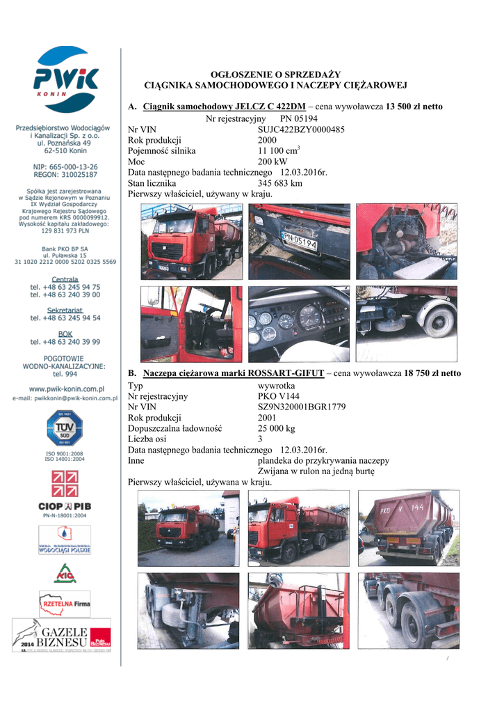 OGŁOSZENIE O SPRZEDAŻY CIĄGNIKA SAMOCHODOWEGO I NACZEPY CIĘŻAROWEJ A. Ciągnik samochodowy JELCZ C 422DM – cena wywoławcza 13 500 zł netto Nr rejestracyjny PN 05194 Nr VIN SUJC422BZY0000485 Rok produkcji 2000 Pojemność silnika 11 100 cm3 Moc 200 kW Data następnego badania technicznego 12.03.2016r. Stan licznika 345 683 km Pierwszy właściciel, używany w kraju. B. Naczepa ciężarowa marki ROSSART-GIFUT – cena wywoławcza 18 750 zł netto Typ wywrotka Nr rejestracyjny PKO V144 Nr VIN SZ9N320001BGR1779 Rok produkcji 2001 Dopuszczalna ładowność 25 000 kg Liczba osi 3 Data następnego badania technicznego 12.03.2016r. Inne plandeka do przykrywania naczepy Zwijana w rulon na jedną burtę Pierwszy właściciel, używana w kraju. Oględzin pojazdów można dokonać w siedzibie PWiK Sp. z o. o. w Koninie przy ul. Poznańskiej 49, po uprzednim uzgodnieniu telefonicznym. Osoby upoważnione do kontaktu: Grzegorz Żabierek, tel. 63 240 39 07, Przemysław Piwowarski, tel. 63 240 39 90. Termin składania ofert: Oferty zakupu na ciągnik samochodowy i/lub naczepę ciężarową należy składać, w terminie do dnia 21.12.2015r. do godziny 10:00. Sposób przygotowania oferty: Ofertę należy złożyć na formularzu cenowym, stanowiącym załącznik do niniejszego ogłoszenia, w zamkniętej kopercie zawierającej adnotację: „Oferta na ciągnik samochodowy i/lub naczepę ciężarową” - nie otwierać przed dniem 21.12.2015 r. do godz.1000”. Miejsce składania ofert: Przedsiębiorstwo Wodociągów i Kanalizacji Sp. z o. , ul. Poznańska 49, 62-510 Konin, Punkt kancelaryjny (pokój nr 115). Kryterium wyboru oferty: Jedynym kryterium wyboru oferty będzie najwyższa zaoferowana cena.