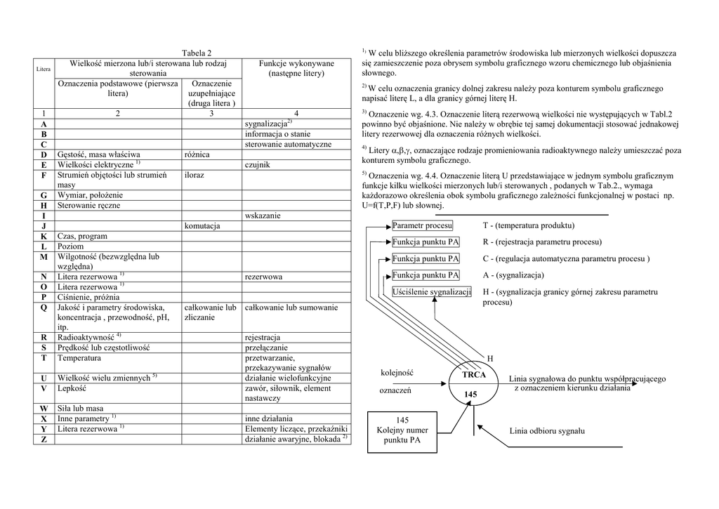 Litera 1 A B C D E F G H I J K L M Tabela 2 Wielkość mierzona lub/i sterowana lub rodzaj sterowania Oznaczenia podstawowe (pierwsza Oznaczenie litera) uzupełniające (druga litera ) 2 3 Funkcje wykonywane (następne litery) W celu oznaczenia granicy dolnej zakresu naleŜy poza konturem symbolu graficznego napisać literę L, a dla granicy górnej literę H. 4 sygnalizacja informacja o stanie sterowanie automatyczne Gęstość, masa właściwa Wielkości elektryczne 1) Strumień objętości lub strumień masy Wymiar, połoŜenie Sterowanie ręczne W celu bliŜszego określenia parametrów środowiska lub mierzonych wielkości dopuszcza się zamieszczenie poza obrysem symbolu graficznego wzoru chemicznego lub objaśnienia słownego. 2) 2) róŜnica czujnik 3) Oznaczenie wg. 4.3. Oznaczenie literą rezerwową wielkości nie występujących w Tabl.2 powinno być objaśnione. Nie naleŜy w obrębie tej samej dokumentacji stosować jednakowej litery rezerwowej dla oznaczenia róŜnych wielkości. 4) Litery α,β,γ, oznaczające rodzaje promieniowania radioaktywnego naleŜy umieszczać poza konturem symbolu graficznego. 5) iloraz Oznaczenia wg. 4.4. Oznaczenie literą U przedstawiające w jednym symbolu graficznym funkcje kilku wielkości mierzonych lub/i sterowanych , podanych w Tab.2., wymaga kaŜdorazowo określenia obok symbolu graficznego zaleŜności funkcjonalnej w postaci np. U=f(T,P,F) lub słownej. wskazanie komutacja R S T Czas, program Poziom Wilgotność (bezwzględna lub względna) Litera rezerwowa 1) Litera rezerwowa 1) Ciśnienie, próŜnia Jakość i parametry środowiska, koncentracja , przewodność, pH, itp. Radioaktywność 4) Prędkość lub częstotliwość Temperatura U V Wielkość wielu zmiennych 5) Lepkość W X Y Z Siła lub masa Inne parametry 1) Litera rezerwowa 1) N O P Q 1) rezerwowa całkowanie lub zliczanie Parametr procesu T - (temperatura produktu) Funkcja punktu PA R - (rejestracja parametru procesu) Funkcja punktu PA C - (regulacja automatyczna parametru procesu ) Funkcja punktu PA A - (sygnalizacja) Uściślenie sygnalizacji H - (sygnalizacja granicy górnej zakresu parametru procesu) całkowanie lub sumowanie rejestracja przełączanie przetwarzanie, przekazywanie sygnałów działanie wielofunkcyjne zawór, siłownik, element nastawczy inne działania Elementy liczące, przekaźniki działanie awaryjne, blokada 2) H kolejność TRCA oznaczeń 145 145 Kolejny numer punktu PA Linia sygnałowa do punktu współpracującego z oznaczeniem kierunku działania Linia odbioru sygnału