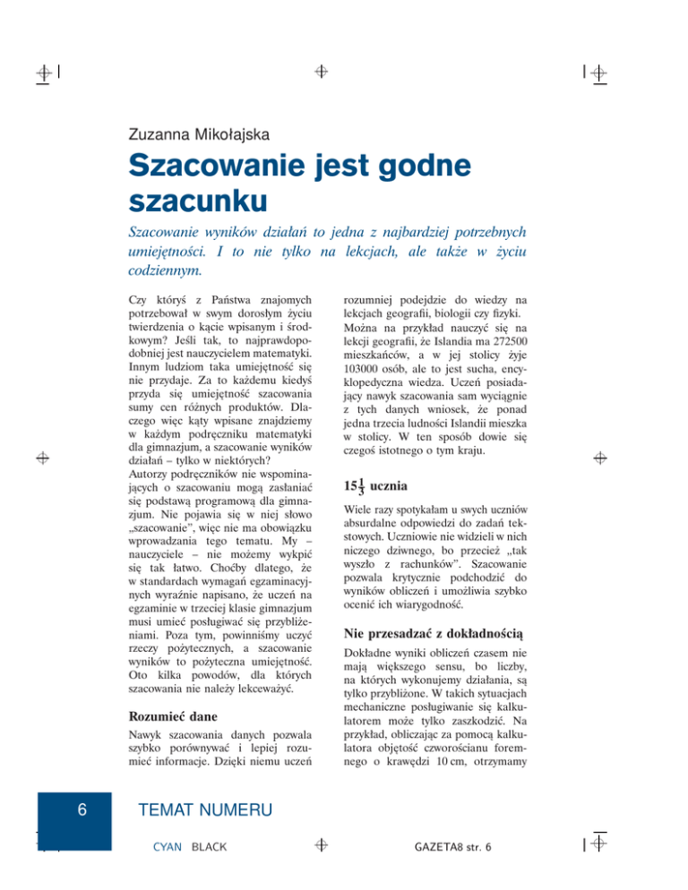 Zuzanna Mikołajska Szacowanie jest godne szacunku Szacowanie wyników działań to jedna z najbardziej potrzebnych umiejętności. I to nie tylko na lekcjach, ale także w życiu codziennym. Czy któryś z Państwa znajomych potrzebował w swym dorosłym życiu twierdzenia o kącie wpisanym i środkowym? Jeśli tak, to najprawdopodobniej jest nauczycielem matematyki. Innym ludziom taka umiejętność się nie przydaje. Za to każdemu kiedyś przyda się umiejętność szacowania sumy cen różnych produktów. Dlaczego więc kąty wpisane znajdziemy w każdym podręczniku matematyki dla gimnazjum, a szacowanie wyników działań – tylko w niektórych? Autorzy podręczników nie wspominających o szacowaniu mogą zasłaniać się podstawą programową dla gimnazjum. Nie pojawia się w niej słowo „szacowanie”, więc nie ma obowiązku wprowadzania tego tematu. My – nauczyciele – nie możemy wykpić się tak łatwo. Choćby dlatego, że w standardach wymagań egzaminacyjnych wyraźnie napisano, że uczeń na egzaminie w trzeciej klasie gimnazjum musi umieć posługiwać się przybliżeniami. Poza tym, powinniśmy uczyć rzeczy pożytecznych, a szacowanie wyników to pożyteczna umiejętność. Oto kilka powodów, dla których szacowania nie należy lekceważyć. Rozumieć dane Nawyk szacowania danych pozwala szybko porównywać i lepiej rozumieć informacje. Dzięki niemu uczeń 6 rozumniej podejdzie do wiedzy na lekcjach geografii, biologii czy fizyki. Można na przykład nauczyć się na lekcji geografii, że Islandia ma 272500 mieszkańców, a w jej stolicy żyje 103000 osób, ale to jest sucha, encyklopedyczna wiedza. Uczeń posiadający nawyk szacowania sam wyciągnie z tych danych wniosek, że ponad jedna trzecia ludności Islandii mieszka w stolicy. W ten sposób dowie się czegoś istotnego o tym kraju. 15 13 ucznia Wiele razy spotykałam u swych uczniów absurdalne odpowiedzi do zadań tekstowych. Uczniowie nie widzieli w nich niczego dziwnego, bo przecież „tak wyszło z rachunków”. Szacowanie pozwala krytycznie podchodzić do wyników obliczeń i umożliwia szybko ocenić ich wiarygodność. Nie przesadzać z dokładnością Dokładne wyniki obliczeń czasem nie mają większego sensu, bo liczby, na których wykonujemy działania, są tylko przybliżone. W takich sytuacjach mechaniczne posługiwanie się kalkulatorem może tylko zaszkodzić. Na przykład, obliczając za pomocą kalkulatora objętość czworościanu foremnego o krawędzi 10 cm, otrzymamy TEMAT NUMERU CYAN BLACK GAZETA8 str. 6 117,8511302 cm3 . Taki rezultat zobaczymy w zeszytach wielu uczniów. Nie zauważą, że nie ma sensu podawanie wyników z taką dokładnością. Ciekawe zadania Dzięki szacowaniu można uatrakcyjnić naukę rachunku pamięciowego. Oto przykład z podręcznika Matematyki z plusem dla klasy 5: Turyści często przeliczają za granicą ceny towarów na złote. Na podstawie tabeli kursów walut odpowiedz, ile mniej więcej złotych kosztują przedmioty przedstawione na fotografiach. Mnożenie 999,99 · 4, 31 jest skomplikowane, gdy jednak zamienimy je na 1000 · 4,30 – można je wykonać w pamięci. Zadanie tekstowe w pięć sekund Szacowanie pozwala czasem szybciej rozwiązywać zadania testowe (a takie zadania stanowić będą istotną część egzaminu). W informatorze Centralnej Komisji Egzaminacyjnej o egzami- nie gimnazjalnym podano następujące zadanie: Badanie czystości rzek o łącznej długości 6000 km wykazało, że ich wody na 46% długości odpowiadają obowiązującym klasom czystości. Na ilu kilometrach długości rzeki mają wody mieszczące się w obowiązujących klasach czystości? A. 130,43 km B. 276 km C. 2760 km D. 3240 km Uczeń przyzwyczajony do szacowania od razu wie, że 46% to nieco mniej niż połowa, a więc prawidłowa odpowiedź powinna być trochę mniejsza od 3000 km. Tylko odpowiedź C spełnia ten warunek. Całe rozwiązanie zajmie kilka sekund. A czas rozwiązywania może decydować o wyniku egzaminu. Zadanie to pokazuje przy okazji, że nie mają racji ci fachowcy od pomiaru dydaktycznego, którzy uważają, że układając test, można z góry określić, jaką umiejętność i na jakim poziomie sprawdzać będzie każde z zadań. Powyższe zadanie miało zapewne sprawdzać umiejętność obliczania procentu danej liczby na poziomie koniecznym lub podstawowym. A tu niespodzianka! Uczeń, który prawidłowo odpowiedział na pytanie, może mieć kłopoty z obliczaniem procentów. I pomyśleć, że są tacy, którzy twierdzą, że w czasach kalkulatorów nikt nie potrzebuje szacować, a umiejętność rachowania to przeżytek... Ogłoszenie Wydawnictwo Adamantan s.c. uprzejmie informuje, że spośród zamawiających promocyjny egzemplarz książki pt. „Tysiąc i jedna noc z nauką” dziesięć bezpłatnych egzemplarzy „Tablic matematycznych” wylosowali P.P.: Marek Boczar (Wrocław), Grażyna Czupryniak (Troszyn), Grażyna Majkut (Lublin), Bożena Olkiewicz (Wrocław), Barbara Pietrowicz (Częstochowa), Urszula Stokłosa (Szczyrzyc), Anna Tomaszek (Stara Wieś), Elżbieta Traciłowska (Konin), Barbara Wawrzyniak (Tymbark), Teresa Wator (Jurków). Wszystkim, którzy zdecydowali się na zakup naszej książki, serdecznie dziękujemy. TEMAT NUMERU CYAN BLACK GAZETA8 str. 7 7