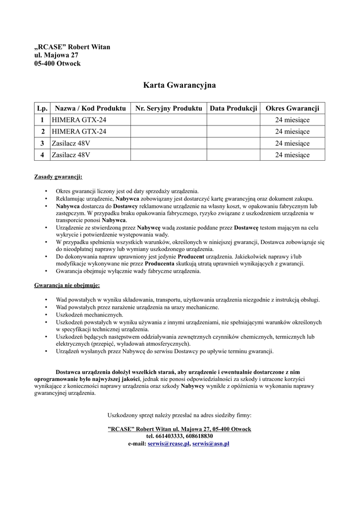 „RCASE” Robert Witan ul. Majowa 27 05-400 Otwock Karta Gwarancyjna Lp. 1 Nazwa / Kod Produktu Nr. Seryjny Produktu Data Produkcji Okres Gwarancji HIMERA GTX-24 24 miesiące 2 HIMERA GTX-24 24 miesiące 3 Zasilacz 48V 24 miesiące 4 Zasilacz 48V 24 miesiące Zasady gwarancji: • • • • • • • Okres gwarancji liczony jest od daty sprzedaży urządzenia. Reklamując urządzenie, Nabywca zobowiązany jest dostarczyć kartę gwarancyjną oraz dokument zakupu. Nabywca dostarcza do Dostawcy reklamowane urządzenie na własny koszt, w opakowaniu fabrycznym lub zastępczym. W przypadku braku opakowania fabrycznego, ryzyko związane z uszkodzeniem urządzenia w transporcie ponosi Nabywca. Urządzenie ze stwierdzoną przez Nabywcę wadą zostanie poddane przez Dostawcę testom mającym na celu wykrycie i potwierdzenie występowania wady. W przypadku spełnienia wszystkich warunków, określonych w niniejszej gwarancji, Dostawca zobowiązuje się do nieodpłatnej naprawy lub wymiany uszkodzonego urządzenia. Do dokonywania napraw uprawniony jest jedynie Producent urządzenia. Jakiekolwiek naprawy i/lub modyfikacje wykonywane nie przez Producenta skutkują utratą uprawnień wynikających z gwarancji. Gwarancja obejmuje wyłącznie wady fabryczne urządzenia. Gwarancja nie obejmuje: • • • • • • Wad powstałych w wyniku składowania, transportu, użytkowania urządzenia niezgodnie z instrukcją obsługi. Wad powstałych przez narażenie urządzenia na urazy mechaniczne. Uszkodzeń mechanicznych. Uszkodzeń powstałych w wyniku używania z innymi urządzeniami, nie spełniającymi warunków określonych w specyfikacji technicznej urządzenia. Uszkodzeń będących następstwem oddziaływania zewnętrznych czynników chemicznych, termicznych lub elektrycznych (przepięć, wyładowań atmosferycznych). Urządzeń wysłanych przez Nabywcę do serwisu Dostawcy po upływie terminu gwarancji. Dostawca urządzenia dołożył wszelkich starań, aby urządzenie i ewentualnie dostarczone z nim oprogramowanie było najwyższej jakości, jednak nie ponosi odpowiedzialności za szkody i utracone korzyści wynikające z konieczności naprawy urządzenia oraz szkody Nabywcy wynikłe z opóźnienia w wykonaniu naprawy gwarancyjnej urządzenia. Uszkodzony sprzęt należy przesłać na adres siedziby firmy: ”RCASE” Robert Witan ul. Majowa 27, 05-400 Otwock tel. 661403333, 608618830 e-mail: [email protected], [email protected]