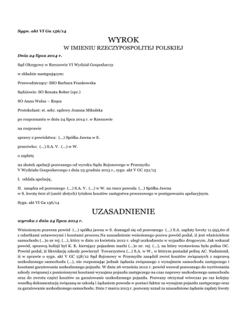 Sygn. akt VI Ga 156/14 WYROK W IMIENIU RZECZYPOSPOLITEJ POLSKIEJ Dnia 24 lipca 2014 r. Sąd Okręgowy w Rzeszowie VI Wydział Gospodarczy w składzie następującym: Przewodniczący: SSO Barbara Frankowska Sędziowie: SO Renata Bober (spr.) SO Anna Walus – Rząsa Protokolant: st. sekr. sądowy Joanna Mikulska po rozpoznaniu w dniu 24 lipca 2014 r. w Rzeszowie na rozprawie sprawy z powództwa: (...) Spółka Jawna w S. przeciwko: (...) S.A. V. (...) w W. o zapłatę na skutek apelacji pozwanego od wyroku Sądu Rejonowego w Przemyślu V Wydziału Gospodarczego z dnia 23 grudnia 2013 r., sygn. akt V GC 251/13 I. oddala apelację, II. zasądza od pozwanego (...) S.A. V. (...) w W. na rzecz powoda (...) Spółka Jawna w S. kwotę 600 zł (sześć złotych) tytułem kosztów zastępstwa procesowego w postępowaniu apelacyjnym. Sygn. akt VI Ga 156/14 UZASADNIENIE wyroku z dnia 24 lipca 2014 r. Wniesionym pozwem powód (...) spółka jawna w S. domagał się od pozwanego (...) S.A. zapłaty kwoty 11.955,60 zł z odsetkami ustawowymi i kosztami procesu.Na uzasadnienie wniesionego pozwu powód podał, iż jest właścicielem samochodu (...)o nr rej. (...), który w dniu 10 kwietnia 2012 r. uległ uszkodzeniu w wypadku drogowym. Jak wskazał powód, sprawcą kolizji był K. K. kierujący pojazdem marki (...)o nr. rej. (...), na który wystawiona była polisa OC. Powód podał, iż likwidację szkody powierzył Towarzystwu (...) S.A. w W., w którym posiadał polisę AC. Nadmienił, iż w sprawie o sygn. akt V GC 158/12 Sąd Rejonowy w Przemyślu zasądził zwrot kosztów związanych z naprawą uszkodzonego samochodu (...), nie rozpoznając jednak żądania związanego z wynajmem samochodu zastępczego i kosztami garażowania uszkodzonego pojazdu. W dniu 26 września 2012 r. powód wezwał pozwanego do wyrównania szkody związanej z poniesionymi kosztami wynajmu pojazdu zastępczego na czas naprawy uszkodzonego samochodu oraz do zwrotu części kosztów za garażowanie uszkodzonego pojazdu. Pozwany otrzymał wówczas po raz kolejny wszelką dokumentację związaną ze szkodą i żądaniem powoda w postaci faktur za wynajem pojazdu zastępczego oraz za garażowanie uszkodzonego samochodu. Dnia 7 marca 2013 r. pozwany uznał za uzasadnione żądanie zapłaty kwoty 600 zł tytułem kosztów garażowania uszkodzonego pojazdu przez 30 dni tj. od dnia 9 kwietnia 2012 r. do dnia 10 maja 2012 r. (po 20 zł netto za dzień), odnośnie kwestii wynajmu pojazdu zastępczego pozwany podniósł, iż powód powinien wystąpić na drogę sądową. Powód wskazał, iż wezwał pozwanego do zapłaty należności pismem z dnia 4 czerwca 2012 r., pismem z dnia 7 maja 2012 r. jednakowoż pozwany podtrzymywał swoje stanowisko. Powód podkreślił, iż nie z własnej winy lecz z winy pozwanego uszkodzony samochód musiał być garażowany od dnia wypadku tj. od dnia 9 kwietnia 2012 r. do dnia 30 września 2012 r. ponieważ towarzystwo ubezpieczeń nie podjęło żadnych kroków wskazujących, co powód ma zrobić z uszkodzonym pojazdem. Dopiero Sąd Rejonowy w Przemyślu w sprawie o sygn. akt V GC 158/12 stwierdził, iż z dniem 30 września 2012 r., zapadła ostateczna decyzja o likwidacji szkody, a do tej pory powód miał obowiązek przechowywać uszkodzony pojazd dla potrzeb postępowania likwidującego szkodę. Powód wskazał także, iż jest przedsiębiorcą a uszkodzony samochód służył do prowadzenia działalności gospodarczej jako pojazd przeznaczony dla zaopatrzenia sklepów i baru oraz jako środek transportu na prowadzone zadania inwestycyjne. Poniesione koszty wynajęcia pojazdu zastępczego powód udokumentował fakturą VAT nr (...) z dowodem zapłaty za wskazaną fakturę. Nie ma zatem żadnej wątpliwości zdaniem powoda, iż wynajęcie samochodu zastępczego było bezpośrednio związane z uszkodzeniem samochodu powoda. W odpowiedzi na pozew pozwany wniósł o oddalenie powództwa w całości i zasądzenie na jego rzecz kosztów procesu według norm przepisanych, w tym kosztów zastępstwa procesowego. Na uzasadnienie powyższego pozwany podał, iż neguje roszczenia zgłaszane przez powoda w niniejszym postępowaniu co do zasady i co do wysokości oraz okoliczności faktyczne podane przez powoda, w szczególności zawarcie umowy najmu pojazdu zastępczego, wyliczenie wysokości roszczeń powoda oraz twierdzenia powoda dotyczące wysokości czynszu najmu pojazdu i poniesienie przez poszkodowanego kosztów najmu i kosztów parkowania, czas przez który poszkodowany korzystał z wynajętego pojazdu zastępczego oraz związek przyczynowy między zdarzeniem wywołującym szkodę a okresem najmu przez poszkodowanego pojazdu zastępczego oraz okresem parkowania pojazdu. Pozwany wskazał, iż koszt najmu pojazdu zastępczego obejmować może tylko okres konieczny i niezbędny do naprawy pojazdu. Nie można zatem rozciągać takich kosztów na cały faktyczny okres naprawy pojazdu. Pozwany podkreślił również, iż odszkodowanie tytułem szkody w pojeździe stanowiącym własność powoda, w związku z uszkodzeniami do których doszło w wyniku wypadku z dnia 9 kwietnia 2012 r., zostało ustalone według zasad właściwych dla szkody całkowitej co nie ma znaczenia dla ustalenia odpowiedzialności pozwanego. Okoliczność, iż powyższe ustalenie dokonane zostało przez ubezpieczyciela powoda zgodnie z zawartą przez powoda umową ubezpieczenia, nie może mieć wpływu na zakres odpowiedzialności pozwanego. Na zakres odpowiedzialności pozwanego wpływu mieć nie może także okoliczność przedłużania przez ubezpieczyciela powoda postępowania likwidacyjnego. Ponadto w ocenie pozwanego, fakt naprawienia bądź nie pojazdu, zależy wyłącznie od woli poszkodowanego i nie ma wpływu na zakres jego odpowiedzialności. Fakt, iż odszkodowanie z tytułu szkody w pojeździe stanowiącym własność powoda, ustalone zostało metodą szkody całkowitej w związku z brakiem ekonomicznego uzasadnienia napr