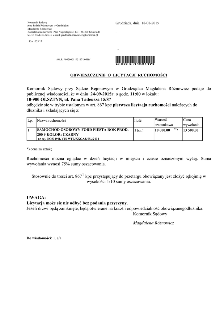 Komornik Sądowy przy Sądzie Rejonowym w Grudziądzu Magdalena Różnowicz Kancelaria Komornicza Plac Niepodległości 13/1, 86-300 Grudziądz tel. 56 6461736, fax 35 e-mail: [email protected] Grudziądz, dnia 18-08-2015 . Km 1055/15 #M.R. *0020001193117*/0419/ *0020001193117* OBWIESZCZENIE O LICYTACJI RUCHOMOŚCI Komornik Sądowy przy Sądzie Rejonowym w Grudziądzu Magdalena Różnowicz podaje do publicznej wiadomości, że w dniu 24-09-2015r. o godz. 11:00 w lokalu: 10-900 OLSZTYN, ul. Pana Tadeusza 15/87 odbędzie się w trybie ustalonym w art. 867 kpc pierwsza licytacja ruchomości należących do dłużnika i składających się z: Lp. Nazwa ruchomości Ilość 1 SAMOCHÓD OSOBOWY FORD FIESTA ROK PROD. 200 9 KOLOR: CZARNY 1 [szt.] Wartość szacunkowa 18 000,00 **) Cena wywołania 13 500,00 .nr rej. NO3319H, VIN WF0JXXGAJJ9U32404 *) cena za sztukę Ruchomości można oglądać w dzień licytacji w miejscu i czasie oznaczonym wyżej. Suma wywołania wynosi 75% sumy oszacowania. Stosownie do treści art. 8671 kpc przystępujący do przetargu obowiązany jest złożyć rękojmię w wysokości 1/10 sumy oszacowania. UWAGA: Licytacja może się nie odbyć bez podania przyczyny. Jeżeli drzwi będą zamknięte, będą otwierane na koszt i odpowiedzialność obowiązanegodłużnika. Komornik Sądowy Magdalena Różnowicz Do wiadomości: 1. a/a
