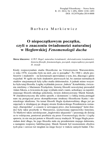 Przegląd Filozoficzny – Nowa Seria R. 23: 2014, Nr 1 (89), ISSN 1230–1493 DOI: 10.2478/pfns-2014-0008 Barbara Markiewicz O niepoczątkowym początku, czyli o znaczeniu świadomości naturalnej w Heglowskiej Fenomenologii ducha Słowa kluczowe: G.W.F. Hegel, naturalna świadomość, doświadczenia świadomości, historia filozofii, fenomenologia, początek, niepoczątkowy początek, H. Arendt Kiedy rozpoczynałam studia filozoficzne na Uniwersytecie Warszawskim, w roku 1970, wszystko było na nich „nie w porządku”. Po 1968 r. ubyło profesorów i studentów – na korytarzach opowiadano o tym, kto, dlaczego i gdzie wyjechał. W ogóle nie było studentów pierwszych lat, bo zamiast normalnych studiów stacjonarnych były tylko studia doktoranckie. A jednak mimo wszystko była tutaj filozofia. Logikę wykładała jeszcze „babcia” Kotarbińska, ćwiczenia mieliśmy z Marianem Przełęckim, historię filozofii nowożytnej prowadził Adam Sikora, a ćwiczenia do jego wykładu miał z nami, uchodzący za najzdolniejszego filozofa młodego pokolenia, świeżo doktoryzowany Marek Siemek. W charakterystyczny dla siebie sposób, z dystansem i z lekką ironią pomagał nam się przegryzać przez skomplikowane struktury filozoficzne Kanta i niemieckiego idealizmu. Na temat filozofii Hegla dyskutowaliśmy długo już po zajęciach w działającej po drugiej stronie Krakowskiego Przedmieścia restauracji „Staropolska”, a czasem w serwującej piwo „bez konsumpcji” łaźni (kiedyś były takie przybytki w Warszawie), usytuowanej naprzeciwko Instytutu. To Markowi także zawdzięczam „heglowskie ukąszenie” i pozostaję do dzisiaj za to wdzięczna, ponieważ przebicie się przez Fenomenologię ducha i Logikę sprawia, że nie ma już potem w filozofii rzeczy trudnych. W kręgu Hegla pozostałam dość długo, bo jego filozofia stała się przedmiotem mojego doktoratu, a następnie rozprawy habilitacyjnej. Marek Siemek był recenzentem obydwu tych prac i zawsze też mogłam na niego liczyć w trakcie samych badań. Cho- 64 Barbara Markiewicz ciaż dyskusje z nim były o tyle trudne, że nie prezentował nigdy gotowych rozwiązań, jednej słusznej prawdy, zmuszając do wyciągania własnych wniosków i rewizji przyjętych już tez. Właśnie dlatego chciałabym zadedykować mu ten tekst, w którym problem świadomości naturalnej u Hegla, o którym pisałam kiedyś w pracy doktorskiej, próbuję umieścić w odmiennej niż tam perspektywie, czyli odnosząc go do początków samej filozofii. Bardzo jestem ciekawa, co powiedziałby na takie przesunięcie akcentów Marek Siemek, i tak bardzo żałuję, że nie mogę go już o to zapytać. *** 1. Już dawno zauważono, że Fenomenologia ducha, czyli pierwsze duże filozoficzne dzieło Hegla, naznaczona jest tajemnicą. Do powstania takiego przekonania przyczyniły się z pewnością historyczne okoliczności, jakie towarzyszyły jego wydaniu, nieokreślone miejsce w filozoficznym systemie Hegla i nade wszystko trudny do interpretacji przedmiot tego dzieła. Chociaż druk Fenomenologii ducha rozpoczęto już w lutym 1806 roku, to ukazała się ona dopiero na początku roku 1807. To niecodzienne, jak na owe czasy, opóźnienie wynikało głównie ze sporu, w jaki wdał się Hegel ze swoim wydawcą, żądając umówionej zapłaty za połowę dzieła (I tom), podczas gdy wydawca uzależniał ją od otrzymania całego rękopisu. Można zatem wnosić, że Hegel nie dostarczył do druku od razu całej pracy, co może również sugerować, że pisane ono było niejako na raty. Być może w jakiejś mierze zamieszanie to związane było z ówczesnymi wydarzeniami historycznymi: 13 października 1806 roku, po zwycięskiej bitwie pod Jeną, do miasta, w którym przebywał wówczas także Hegel, wkroczyły wojska Napoleona, wywołując entuzjazm wśród jednych jego mieszkańców, a strach i potrzebę ucieczki wśród innych. Na podstawie tych faktów niektórzy badacze heglowskiej filozofii byli nawet skłonni uznać, że Fenomenologia nie była dziełem głęboko przemyślanym, lecz w dużej mierze wytworem improwizacji. I tak na przykład zdaniem Theodora Haeringa (1888–1964), znanego ze swych nazistowskich przekonań badacza heglowskiej filozofii, można to dzieło potraktować jako kompilację różnych prac Hegla, pochodzących z różnych części jego systemu1. Natomiast jeden z najwcześniejszych hegloznawców, Rudolf Haym (1821–1901), dopatrywał się w niej niezbyt przemyślanego połączenia dwóch różnych zasad systemowych: transcendentalno-psychologicznej i historycznej. Swoje twierdze1 Por. A. Landman, Przedmowa tłumacza, w: G.W.F. Hegel, Fenomenologia ducha, PWN, Warszawa 1963, t. I, s. XV i n., a także O. Pöggeler, Hegels Idee einer Phänomenologie des Geistes, Verlag Karl Albert, Freiburg–Munchen 1973, szczególnie rozdz. Zur Deutung der Phänomenologie des Geistes. O niepoczątkowym początku, czyli o znaczeniu świadomości naturalnej… 65 nie uzasadniał wskazując, iż postacie historyczne pojawiają się w tym dziele w przebraniu psychologicznych duchów, zaś psychologiczne moce pod maską historycznych postaci. Jak cytuje polski tłumacz Fenomenologii ducha Adam Landman, miał on stwierdzić, że: „Fenomenologia jest psychologią pogmatwaną i zdezorganizowaną przez historię i historią zdezorganizowaną przez psychologię”2. Odpierając tego rodzaju zarzuty, Adam Landman podkreślał, że Hegel dostarczał swoje dzieło do wydawcy w regularnych odstępach czasowych, co według niego świadczy o tym, że musiało być ono wcześniej przygotowane, czyli także przemyślane. Nie da się jednak zaprzeczyć, że publikacji Fenomenologii ducha towarzyszyły nieprzewidziane wydarzenia. Już nawet po wydrukowaniu części nakładu Hegel postanowił na przykład zmienić sam tytuł, co zapowiedział także w pisanej po zakończeniu całej pracy Przedmowie. W ten sposób na pierwszej stronie egzemplarza wysłaneg