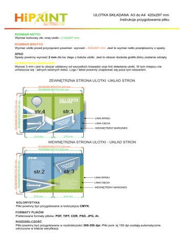 ULOTKA SKŁADANA A3 do A4 420x297 mm Instrukcja przygotowania pliku ROZMIAR NETTO Wymiar końcowy złożonej ulotki - 210x297 mm ROZMIAR BRUTTO Wymiar ulotki przed przycięciem powinien wynosić - 424x301 mm. Jest to wymiar netto powiększony o spady. SPAD Spady powinny wynosić 2 mm dla każdego z boków ulotki. Jest to obszar dookoła grafiki,który zostanie odcięty. WEWNĘTRZNY MARGINES Wynosi 3 mm i jest to obszar oddalony od wszystkich krawędzi oraz linii składania ulotki. W tym miejscu nie umieszcza się żadnych istotnych treści. Logo i tekst powinny znajdować się poza tym obszarem. ZEWNĘTRZNA STRONA ULOTKI -UKŁAD STRON ROZMIAR BRUTTO 301 mm ROZMIAR NETTO 297 mm ROZMIAR BRUTTO 424 mm ROZMIAR NETTO 420 mm str.4 str.1 LINIA SPADU LINIA CIĘCIA WEWNĘTRZNY MARGINES 210 mm 210 mm WEWNĘTRZNA STRONA ULOTKI - UKŁAD STRON ROZMIAR BRUTTO 301 mm ROZMIAR NETTO 297 mm ROZMIAR BRUTTO 424 mm ROZMIAR NETTO 420 mm str.2 str.3 LINIA SPADU LINIA CIĘCIA WEWNĘTRZNY MARGINES 210 mm 210 mm KOLORYSTYKA Pliki powinny być przygotowane w kolorystyce CMYK. FORMATY PLIKÓW Preferowane formaty plików: PDF, TIFF, CDR, PSD, JPG, AI. ROZDZIELCZOŚĆ Pliki powinny być przygotowane w rozdzielczości 300-350 dpi. Pliki poniżej 150 dpi zostają automatycznie odrzucone w trakcie weryfikacji.