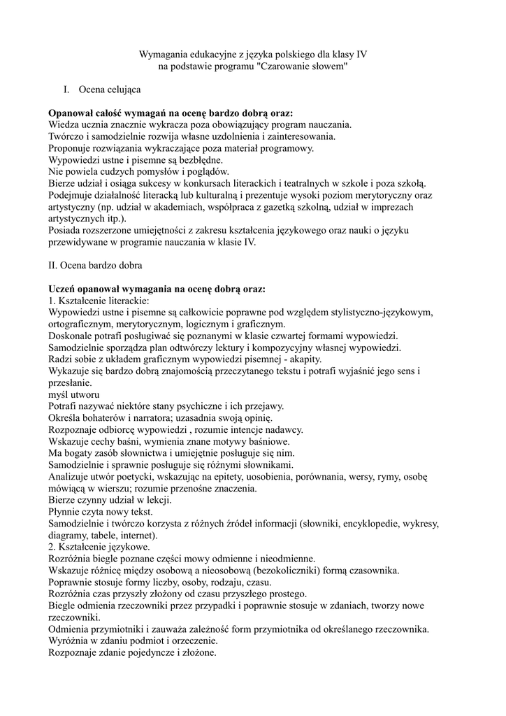 Wymagania edukacyjne z języka polskiego dla klasy IV na podstawie programu "Czarowanie słowem" I. Ocena celująca Opanował całość wymagań na ocenę bardzo dobrą oraz: Wiedza ucznia znacznie wykracza poza obowiązujący program nauczania. Twórczo i samodzielnie rozwija własne uzdolnienia i zainteresowania. Proponuje rozwiązania wykraczające poza materiał programowy. Wypowiedzi ustne i pisemne są bezbłędne. Nie powiela cudzych pomysłów i poglądów. Bierze udział i osiąga sukcesy w konkursach literackich i teatralnych w szkole i poza szkołą. Podejmuje działalność literacką lub kulturalną i prezentuje wysoki poziom merytoryczny oraz artystyczny (np. udział w akademiach, współpraca z gazetką szkolną, udział w imprezach artystycznych itp.). Posiada rozszerzone umiejętności z zakresu kształcenia językowego oraz nauki o języku przewidywane w programie nauczania w klasie IV. II. Ocena bardzo dobra Uczeń opanował wymagania na ocenę dobrą oraz: 1. Kształcenie literackie: Wypowiedzi ustne i pisemne są całkowicie poprawne pod względem stylistyczno-językowym, ortograficznym, merytorycznym, logicznym i graficznym. Doskonale potrafi posługiwać się poznanymi w klasie czwartej formami wypowiedzi. Samodzielnie sporządza plan odtwórczy lektury i kompozycyjny własnej wypowiedzi. Radzi sobie z układem graficznym wypowiedzi pisemnej - akapity. Wykazuje się bardzo dobrą znajomością przeczytanego tekstu i potrafi wyjaśnić jego sens i przesłanie. myśl utworu Potrafi nazywać niektóre stany psychiczne i ich przejawy. Określa bohaterów i narratora; uzasadnia swoją opinię. Rozpoznaje odbiorcę wypowiedzi , rozumie intencje nadawcy. Wskazuje cechy baśni, wymienia znane motywy baśniowe. Ma bogaty zasób słownictwa i umiejętnie posługuje się nim. Samodzielnie i sprawnie posługuje się różnymi słownikami. Analizuje utwór poetycki, wskazując na epitety, uosobienia, porównania, wersy, rymy, osobę mówiącą w wierszu; rozumie przenośne znaczenia. Bierze czynny udział w lekcji. Płynnie czyta nowy tekst. Samodzielnie i twórczo korzysta z różnych źródeł informacji (słowniki, encyklopedie, wykresy, diagramy, tabele, internet). 2. Kształcenie językowe. Rozróżnia biegle poznane części mowy odmienne i nieodmienne. Wskazuje różnicę między osobową a nieosobową (bezokoliczniki) formą czasownika. Poprawnie stosuje formy liczby, osoby, rodzaju, czasu. Rozróżnia czas przyszły złożony od czasu przyszłego prostego. Biegle odmienia rzeczowniki przez przypadki i poprawnie stosuje w zdaniach, tworzy nowe rzeczowniki. Odmienia przymiotniki i zauważa zależność form przymiotnika od określanego rzeczownika. Wyróżnia w zdaniu podmiot i orzeczenie. Rozpoznaje zdanie pojedyncze i złożone. Potrafi zbudować zdanie z podanych związków wyrazowych. Rozwija zdanie pojedyncze i przekształca je w złożone. Odróżnia głoskę od litery, spółgłoskę od samogłoski. Określa spółgłoski. III. Ocena dobra Uczeń opanował wymagania na ocenę dostateczną oraz: 1. Kształcenie literackie: Czyta poprawnie ze zrozumieniem, stosując zasady prawidłowego przestankowania. Umie opowiedzieć przeczytany tekst, oglądnięty film, spektakl. Jego wypowiedzi ustne i pisemne mogą zawierać jedynie nieliczne błędy językowo-stylistyczne, logiczne i ortograficzne; stosuje akapity. Poprawnie używa znaków interpunkcyjnych. Poprawnie posługuje się poznanymi formami wypowiedzi. W swych wypowiedziach ustnych i pisemnych próbuje oceniać zachowania bohaterów literackich oraz formułuje ogólne wnioski o utworach. Omawia elementy świata przedstawionego, wskazuje narratora. Wyraża własne zdanie i uzasadnia je. Nazywa cechy i uczucia bohaterów. Próbuje określić temat i główną myśl przeczytanego utworu. Wyróżnia baśń jako gatunek literacki. Potrafi posługiwać się podstawowymi słownikami. Poprawnie sporządza plan ramowy. Potrafi wskazać w wierszu epitet, przenośnie, porównanie, rymy, wersy, strofy. Samodzielnie korzysta z różnych źródeł informacji. Dobrze zna lektury obowiązkowe dla klasy IV. 2. Kształcenie językowe. Rozróżnia części mowy odmienne i nieodmienne. Poprawnie odmienia (stosuje w zdaniach) czasowniki, rzeczowniki i przymiotniki. Potrafi oddzielić temat od końcówki rzeczownika. Wskazuje przysłówki i przyimki. Umie wskazać w zdaniu podmiot i orzeczenie. Przekształca zdania w równoważniki zdań. Układa zdania pojedyncze i złożone. Rozwija zdanie pojedyncze. Rozróżnia głoskę, literę, samogłoskę, spółgłoskę. Poprawnie dzieli wyrazy na sylaby. Dobrze zna i stosuje podstawowe zasady ortograficzne(podane poniżej oraz pisownię z „nie”); wykorzystuje wiedzę o wymianie głosek. IV. Ocena dostateczna Uczeń opanował wymagania na ocenę dopuszczającą oraz: 1. Kształcenie literackie: Czyta z niewielkimi błędami, na ogół ze zrozumieniem. Recytuje z pamięci teksty poetyckie, wygłasza proste kwestie w szkolnym przedstawieniu. Umie opowiedzieć, z niewielkimi błędami, przeczytany tekst, oglądnięty film, spektakl. Słucha tekstów literackich raczej uważnie, rozumiejąc ich sens. W wypowiedziach ustnych i pisemnych na ogół przestrzega zasad poprawnościowych w zakresie budowy zdań, precyzyjnego stosowania poznanego słownictwa i ortografii. Na ogół poprawnie używa znaków interpunkcyjnych. Przy małej pomocy nauczyciela stosuje następujące formy wypowiedzi: opowiadanie, opis przedmiotu, krajobrazu i postaci, list, notatkę, przepis, zaproszenie, ogłoszenie, kartkę z dziennika, życzenia, dialog, pocztówkę, instrukcję. Umie wymienić elementy świata przedstawionego (bohaterów, miejsce i czas akcji, główne zdarzenia). Wyszukuje informacje w tekście. Sporządza plan ramowy. Wskazuje epitety, porównania, wyrazy dźwiękonaśladowcze, wersy, strofy, rymy. Odróżnia postacie i wydarzenia realistyczne od fantastycznych. Stara się samodzielnie korzystać z ró