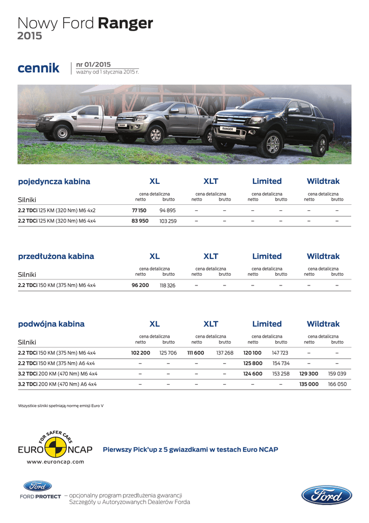 Nowy Ford Ranger 2015 cennik nr 01/2015 ważny od 1 stycznia 2015 r. XL XLT Limited Wildtrak cena detaliczna netto brutto cena detaliczna netto brutto cena detaliczna netto brutto cena detaliczna netto brutto pojedyncza kabina Silniki 2.2 TDCi 125 KM (320 Nm) M6 4x2 77 150 94 895 – – – – – – 2.2 TDCi 125 KM (320 Nm) M6 4x4 83 950 103 259 – – – – – – XL XLT Limited Wildtrak cena detaliczna netto brutto cena detaliczna netto brutto cena detaliczna netto brutto cena detaliczna netto brutto przedłużona kabina Silniki 96 200 2.2 TDCi 150 KM (375 Nm) M6 4x4 – – – – – – XL XLT Limited Wildtrak cena detaliczna netto brutto cena detaliczna netto brutto cena detaliczna netto brutto cena detaliczna netto brutto podwójna kabina Silniki 118 326 2.2 TDCi 150 KM (375 Nm) M6 4x4 102 200 125 706 111 600 137 268 120 100 147 723 – – 2.2 TDCi 150 KM (375 Nm) A6 4x4 – – – – 125 800 154 734 – – 3.2 TDCi 200 KM (470 Nm) M6 4x4 – – – – 124 600 153 258 129 300 159 039 3.2 TDCi 200 KM (470 Nm) A6 4x4 – – – – – – 135 000 166 050 Wszystkie silniki spełniają normę emisji Euro V Pierwszy Pick’up z 5 gwiazdkami w testach Euro NCAP – opcjonalny program przedłużenia gwarancji Szczegóły u Autoryzowanych Dealerów Forda Nowy Ford Ranger 2015 Specyfikacje Pojedyncza kabina Przedłużona kabina Podwójna kabina Podwójna kabina Podwójna kabina Podwójna kabina XL XL XL XLT Limited Wildtrak s s s s s s s s s s s s s s s s s s s s s s s s s s s s s s s s s s s s s s s s s s s s s s s s s s s s s s s s s s s s s s s s s s s s s s s s s s s s s s s s s s s s s s s s s s s s s s s s s s s s s s bezpieczeństwo ABS na 4 koła, sterowany elektronicznie ESP – program elektronicznej stabilizacji toru jazdy z sygnalizacją hamowania awaryjnego (EBL), systemem kontroli hamowania na zakręcie (CBC), kontrolą hamowania silnikiem (EDC), wspomaganiem nagłego hamowania (EBA), systemem kontroli obciążenia pojazdu (LAC), systemem kontroli zjazdu ze wzniesienia (HDC), wspomaganiem ruszania pod górę (HSA), systemem kontroli kołysania przyczepy (TSA) i systemem kontroli ryzyka wywrócenia pojazdu (ROM). Trzystopniowy układ kontroli trakcji wyposażony we włącznik, działający poprzez hamulce i układ sterowania pracą silnika. Poduszki powietrzne – kierowcy i pasażera z przodu Poduszki boczne Poduszki powietrzne – chroniące głowę i okolice klatki piersiowej Poduszki powietrzne – poduszka powietrzna na wysokości kolan kierowcy Sygnalizacja zapięcia pasów kierowcy i przedniego pasażera Belki wzmacniające drzwi, klatka bezpieczeństwa kabiny Kolumna kierownicy – załamująca się przy zderzeniu czołowym układ hamulcowy Hydrauliczny, z podciśnieniowym serwem hamulcowym i korektorem sił hamowania Wentylowane hamulce tarczowe z przodu, bębnowe z tyłu. zbiornik paliwa 80 litrów układ kierowniczy Ze wspomaganiem Kolumna kierownicza – z regulacją kąta pochylenia zawieszenie Z przodu – niezależne, z podwójnymi wahaczami, teleskopowymi amortyzatorami o dwukierunkowym działaniu oraz stabilizatorem poprzecznym Z tyłu – zawieszenie typu „Berlin eye” – resory piórowe z teleskopowymi amortyzatorami o dwukierunkowym działaniu s – wyposażenie standardowe – – niedostępne Nowy Ford Ranger 2015 Specyfikacje Pojedyncza kabina Przedłużona kabina Podwójna kabina Podwójna kabina Podwójna kabina Podwójna kabina XL XL XL XLT Limited Wildtrak 4 000 netto 4 000 netto 4 000 netto 4 920 brutto 4 920 brutto 4 920 brutto s – – – – – – s s 5 500 netto 5 500 netto 5 500 netto 5 500 netto 5 500 netto 5 500 netto 6 765 brutto 6 765 brutto 6 765 brutto 6 765 brutto 6 765 brutto 6 765 brutto – s – – s – – s – s s – s s s s s s – s s s s s – – – – s s – – – – s s s s s s s s – – – – – s – – – s s s s s s s s s – – s s s s 2 200 netto 2 200 netto 2 200 netto s – – – s – – – s – – – s s s – s s s s s s s s – – – – – – – s – s s s – s – s – s s s s s s s klimatyzacja Klimatyzacja – manualna, bezfreonowy czynnik chłodniczy Klimatyzacja – dwustrefowa, z automatyczną regulacją temperatury (DEATC); bezfreonowy czynnik chłodniczy Nagrzewnica spalinowa programowalna wygoda i funkcjonalność Tempomat (dostępny w połączeniu ze sterowaniem audio z kolumny kierownicy i poduszka kierowcy) Gniazdko zasilania 12V – z przodu, 2 szt. Gniazdko zasilania 12V – z tyłu, 1 szt. Konsola centralna – przednia, z podwójna pokrywą, ze schowkiem, wnęką na monety i uchwytem na dwa kubki Konsola centralna – przednia ze schowkiem chłodzonym Konsola centralna – górna, z lampkami do czytania map i miejscem na okulary Oświetlenie wnętrza – funkcja włączania oświetlenia przy wsiadaniu – lampki sufitowe i lampki oświetlające podłoże w kierunkowskazach (jeśli występują) włączane w chwili otwarcia zamków Oświetlenie wnętrza – światło w odcieniu „Ice Blue” z regulacją jasności Lusterko wsteczne – samoczynnie ściemniające się (elektrochromatyczne) Szyby – przednie, sterowane elektrycznie z otwieraniem/zamykaniem za jednym przyciśnięciem i z czujnikiem przeszkody przy zamykaniu po stronie kierowcy Szyby – tylne, sterowane elektrycznie z włącznikiem blokady po stronie kierowcy elementy funkcjonalne Pakiet Off-Road - elektroniczna blokada tylnego mechanizmu różnicowego, stalowe osłony silnika, skrzyni biegów i zbiornika paliwa System wlewu paliwa – Ford Easy Fuel (bez korka, z zabezpieczeniem przed wlaniem niewłaściwego paliwa) Reflektory – z automatycznym włączaniem Przednie lampy przeciwmgielne Czujniki cofania Kamera cofania (obraz wyświetlany w lusterku wstecznym) Wycieraczki – automatyczne z czujnikiem deszczu Przednia szyba – elektrycznie ogrzewana Przygotowanie do montażu tachografu cyfrowego s – wyposażenie standardowe – – niedostępne 2 200 netto 2 706 brutto 2 