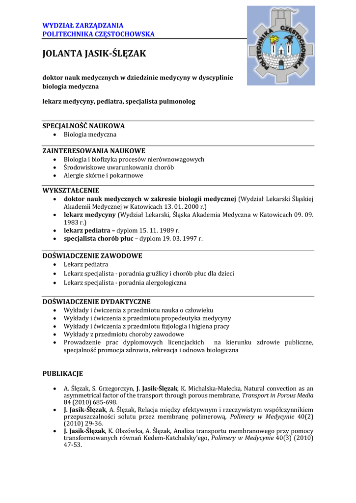 jolanta jasik-ślęzak - Politechnika Częstochowska