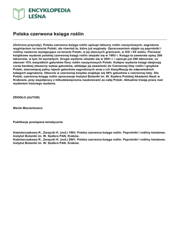 Polska czerwona księga roślin (Ochrona przyrody), Polska czerwona księga roślin opisuje taksony roślin naczyniowych, zagrożone wyginięciem na terenie Polski, ale również te, które już wyginęły. Opracowaniem objęte są paprotniki i rośliny nasienne występujące na terenie Polski, w jej obecnych granicach, w XIX i XX wieku. Pierwsze książkowe wydanie polskiej czerwonej księgi roślin ukazało się w 1993 r. Księga ta zawierała opisy 206 taksonów, w tym 34 wymarłych. Drugie wydanie ukazało się w 2001 r. i opisuje już 296 taksonów, co stanowi 15% wszystkich gatunków flory roślin naczyniowych Polski. Kolejne wydania księgi obejmują coraz bardziej obszerny wykaz gatunków, zbliżając jej zawartość do Czerwonej listy roślin i grzybów Polski, stanowiącej pełny rejestr gatunków zagrożonych wraz z ich klasyfikacją do odpowiednich kategorii zagrożenia. Obecnie w czerwonej księdze znajduje się 58% gatunków z czerwonej listy. Dla Polski, czerwoną księgę roślin opracowuje Instytut Botaniki im. W. Szafera Polskiej Akademii Nauk w Krakowie, przy współpracy z kilkudziesięcioma naukowcami za całej Polski. Aktualnie trwają prace nad wydaniem trzeciego wydania. ŹRÓDŁO (AUTOR) Marek Maciantowicz Publikacje powiązane tematycznie Kaźmierczakowa R., Zarzycki K. (red.) 1993. Polska czerwona księga roślin. Paprotniki i rośliny kwiatowe. Instytut Botaniki im. W. Szafera PAN, Kraków. Kaźmierczakowa R., Zarzycki K. (red.) 2001. Polska czerwona księga roślin. Paprotniki i rośliny kwiatowe. Instytut Botaniki im. W. Szafera PAN, Kraków.
