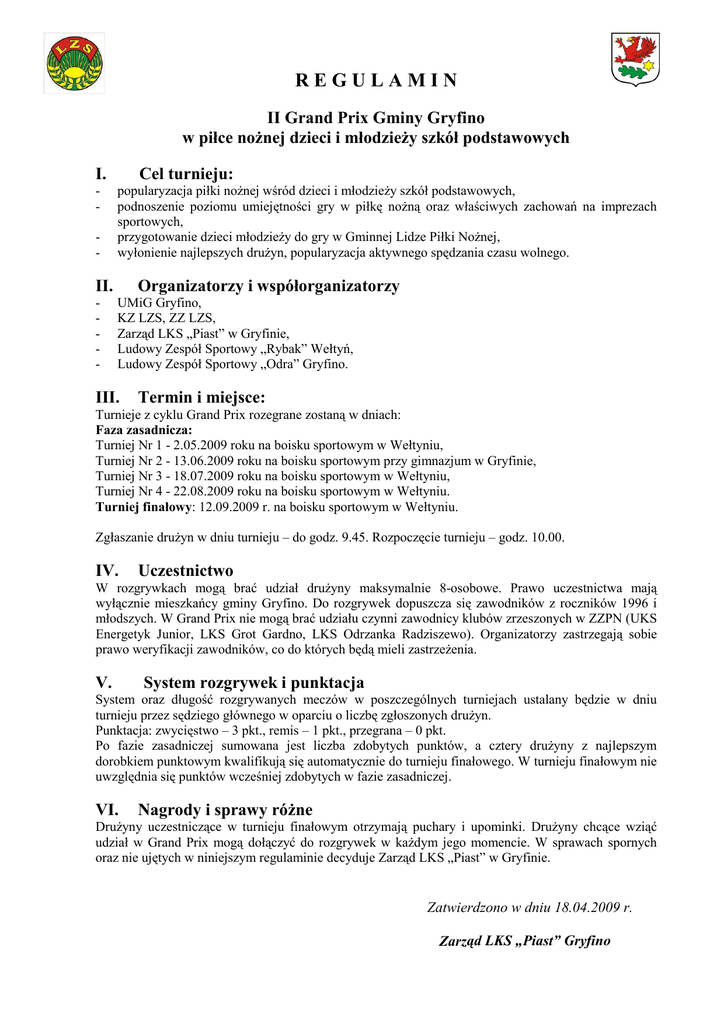 REGULAMIN II Grand Prix Gminy Gryfino w piłce noŜnej dzieci i młodzieŜy szkół podstawowych I. - Cel turnieju: popularyzacja piłki noŜnej wśród dzieci i młodzieŜy szkół podstawowych, podnoszenie poziomu umiejętności gry w piłkę noŜną oraz właściwych zachowań na imprezach sportowych, przygotowanie dzieci młodzieŜy do gry w Gminnej Lidze Piłki NoŜnej, wyłonienie najlepszych druŜyn, popularyzacja aktywnego spędzania czasu wolnego. II. - Organizatorzy i współorganizatorzy UMiG Gryfino, KZ LZS, ZZ LZS, Zarząd LKS „Piast” w Gryfinie, Ludowy Zespół Sportowy „Rybak” Wełtyń, Ludowy Zespół Sportowy „Odra” Gryfino. III. Termin i miejsce: Turnieje z cyklu Grand Prix rozegrane zostaną w dniach: Faza zasadnicza: Turniej Nr 1 - 2.05.2009 roku na boisku sportowym w Wełtyniu, Turniej Nr 2 - 13.06.2009 roku na boisku sportowym przy gimnazjum w Gryfinie, Turniej Nr 3 - 18.07.2009 roku na boisku sportowym w Wełtyniu, Turniej Nr 4 - 22.08.2009 roku na boisku sportowym w Wełtyniu. Turniej finałowy: 12.09.2009 r. na boisku sportowym w Wełtyniu. Zgłaszanie druŜyn w dniu turnieju – do godz. 9.45. Rozpoczęcie turnieju – godz. 10.00. IV. Uczestnictwo W rozgrywkach mogą brać udział druŜyny maksymalnie 8-osobowe. Prawo uczestnictwa mają wyłącznie mieszkańcy gminy Gryfino. Do rozgrywek dopuszcza się zawodników z roczników 1996 i młodszych. W Grand Prix nie mogą brać udziału czynni zawodnicy klubów zrzeszonych w ZZPN (UKS Energetyk Junior, LKS Grot Gardno, LKS Odrzanka Radziszewo). Organizatorzy zastrzegają sobie prawo weryfikacji zawodników, co do których będą mieli zastrzeŜenia. V. System rozgrywek i punktacja System oraz długość rozgrywanych meczów w poszczególnych turniejach ustalany będzie w dniu turnieju przez sędziego głównego w oparciu o liczbę zgłoszonych druŜyn. Punktacja: zwycięstwo – 3 pkt., remis – 1 pkt., przegrana – 0 pkt. Po fazie zasadniczej sumowana jest liczba zdobytych punktów, a cztery druŜyny z najlepszym dorobkiem punktowym kwalifikują się automatycznie do turnieju finałowego. W turnieju finałowym nie uwzględnia się punktów wcześniej zdobytych w fazie zasadniczej. VI. Nagrody i sprawy róŜne DruŜyny uczestniczące w turnieju finałowym otrzymają puchary i upominki. DruŜyny chcące wziąć udział w Grand Prix mogą dołączyć do rozgrywek w kaŜdym jego momencie. W sprawach spornych oraz nie ujętych w niniejszym regulaminie decyduje Zarząd LKS „Piast” w Gryfinie. Zatwierdzono w dniu 18.04.2009 r. Zarząd LKS „Piast” Gryfino