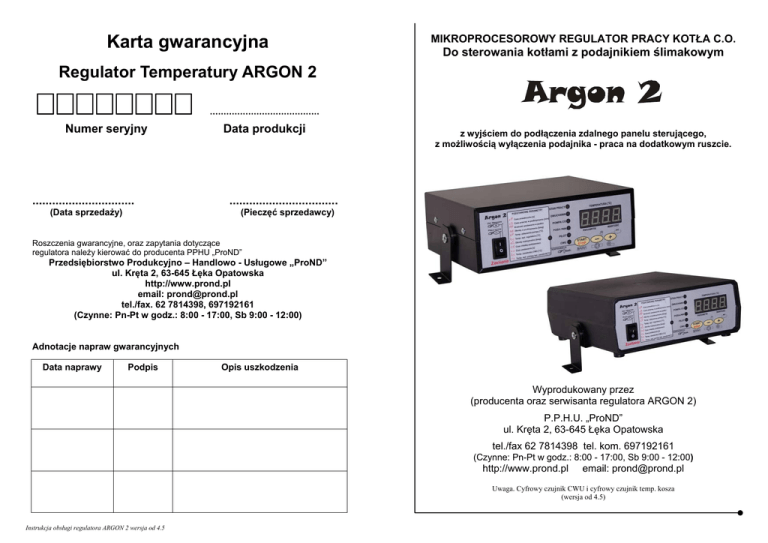 Karta gwarancyjna MIKROPROCESOROWY REGULATOR PRACY KOTŁA C.O. Do sterowania kotłami z podajnikiem ślimakowym Regulator Temperatury ARGON 2 Numer seryjny ............................... Data produkcji Nagłówek z wyjściem do podłączenia zdalnego panelu sterującego, z możliwością wyłączenia podajnika - praca na dodatkowym ruszcie. ................................. (Data sprzedaży) (Pieczęć sprzedawcy) Roszczenia gwarancyjne, oraz zapytania dotyczące regulatora należy kierować do producenta PPHU „ProND” Przedsiębiorstwo Produkcyjno – Handlowo - Usługowe „ProND” ul. Kręta 2, 63-645 Łęka Opatowska http://www.prond.pl email: [email protected] tel./fax. 62 7814398, 697192161 (Czynne: Pn-Pt w godz.: 8:00 - 17:00, Sb 9:00 - 12:00) Adnotacje napraw gwarancyjnych Data naprawy Podpis Opis uszkodzenia Wyprodukowany przez (producenta oraz serwisanta regulatora ARGON 2) P.P.H.U. „ProND” ul. Kręta 2, 63-645 Łęka Opatowska tel./fax 62 7814398 tel. kom. 697192161 (Czynne: Pn-Pt w godz.: 8:00 - 17:00, Sb 9:00 - 12:00) http://www.prond.pl email: [email protected] Uwaga. Cyfrowy czujnik CWU i cyfrowy czujnik temp. kosza (wersja od 4.5) Instrukcja obsługi regulatora ARGON 2 wersja od 4.5 – 20 – – 1 – Instrukcja obsługi regulatora ARGON 2 wersja od 4.5 Parametry konfiguracyjne Nazwa Symbol 1. Czas przedmuchu w stanie nadzoru 2. Czas przerwy w stanie nadzoru 3. Krotność podawania w podtrzymaniu 4. Obroty w podtrzymaniu 5. Temperatura załączenia pompy 6. Temperatura wyłączenia regulatora * 7. Obroty maksymalne 8. Czas między podawaniem 9. Czas podawania 10. Temp. wyłączenia pompy ładującej zasobnik C.W.U. Nas. fabryczna Zakres Jednostka 10 10 1 3 35 28 3 30 12 oF....5-59 199 020 112 2570..oF 2050 112 599..oF 599 s min. – bieg °C °C bieg s s oF 30-75..oF °C Parametry serwisowe dla instalatorów 11. Moc biegu 11 12. Moc biegu 1 13. Histereza temperatury kotła C.O. 14. Minimalna temperatura nastawiana 15. Maksymalna temperatura nastawiana 16. Opóźnienie wyłączenia kotła 17. Czas odłączenia pompy 18. Priorytet zasobnika C.W.U. 19. Temp. zadziałania alarmu podajnika 20. Czas przesypywania 40 10 1 35* 90 15 5 00 70 5 0670 165 15 30*55 6090 190 on.130..oF 00-01 40..-80..oF 0130 % % °C °C °C min. min. WPŁYW NA ŚRODOWISKO Ustawa z dnia 29 lipca 2005r. o zużytym sprzęcie elektrycznym i elektronicznym nakłada na użytkowników obowiązek zagospodarowania odpadów urządzeń elektrycznych i elektronicznych. Przekreślony znak kosza oznacza całkowity zakaz umieszczania zużytego sprzętu wraz z innymi odpadami. Wprowadzenie ww. ustawy ma na celu optymalizację odzysku oraz ponownego przetworzenia komponentów i materiałów użytych do wyprodukowania produktu. Taka selektywna zbiórka ma bezpośredni wpływ na stan środowiska naturalnego. Informacje dotyczące postępowania ze zużytymi urządzeniami można uzyskać od sprzedawcy, producenta lub władz lokalnych. Masa kompletnego urządzenia w obudowie z tworzywa, bez opakowania : 1,694kg Masa kompletnego urządzenia w obudowie metalowej, bez opakowania : 2,086kg Warunki gwarancji i warunki serwisowe 1. Tylko pompa C.O., brak pompy C.W.U.(ust. fabryczne) Pracuje tylko pompa C.O., załączana jest w temperaturze ustawionej w trybie konfiguracji. Parametr 5 (tP) ze strony 13 ustawić w zakresie 3065°C; parametr 10 (nc) ze strony 14 odpowiedzialny za C.W.U. ustawić na oF 2. Pompa C.O. i pompa C.W.U. (funkcja stałej pompy C.O.) Pompa C.O. załączana jest w temperaturze ustawionej w trybie konfiguracji. Parametr 5 (tP) ze strony 13 ustawić w zakresie 3065°C; parametr 10 (nc) ze strony 14 odpowiedzialny za C.W.U. ustawić w zakresie 30 - 65°C Parametr 18 (Pr) ze strony 15 ustawić na 00. 3. Priorytet C.W.U. Na czas grzania C.W.U. wyłączona zostaje pompa C.O. (opis w instrukcji na stronie 10). Parametr 5 (tP) ze strony 13 ustawić w zakresie 3065°C; parametr 10 (nc) ze strony 14 odpowiedzialny za C.W.U. ustawić w zakresie 30 - 65°C Parametr 18 (Pr) ze strony 15 ustawić na 01 4. Tylko pompa C.W.U. (tryb lato, kocioł wykorzystywany tylko do podgrzewania wody w zasobniku C.W.U) Pracuje tylko pompa C.W.U. W trybie konfiguracji parametr 5 (tP) ze strony 13; ustawić na oF; parametr 10 (nc) ze strony 14 odpowiedzialny za C.W.U. ustawić w zakresie 30 - 65°C . 1. Gwarancji na poprawne działanie sprzętu udziela PPHU „ProND”. na czas 24 miesięcy, nie dłużej niż 36 miesięcy od daty produkcji. Datą, od której obowiązuje gwarancja, jest data wystawienia dokumentu zakupu, zapisana w Karcie Gwarancyjnej. 2. Ujawnione w okresie gwarancji usterki będą bezpłatnie usunięte przez serwis gwaranta PPHU „ProND” 63-645 Łęka Opatowska, ul. Kręta 2, tel./fax. 62 7814398. Warunkiem udzielenia gwarancji jest odpowiednie użytkowanie określone w instrukcji obsługi 3. Niniejsza gwarancja obejmuje usterki sprzętu spowodowane wadliwymi częściami i/lub defektami produkcyjnymi. 4. Uszkodzony sprzęt Reklamujący powinien przesłać Pocztą Polską jako paczkę priorytetową na adres i koszt serwisanta - „paczka priorytetowa pobraniowa” (paczki przesłane Kurierem Poczty Polskiej Pocztex oraz firmami kurierskimi za pobraniem nie będą przyjmowane przez serwis) Przygotowanie sprzętu do serwisu oraz warunki przyjęcia sprzętu do naprawy: dokładnie sprawdzić uszkodzony sprzęt i opisać rodzaj uszkodzenia, opis uszkodzenia, uszkodzony sprzęt, kartę gwarancyjną, dokładne dane adresowe reklamującego dostarczyć do serwisu PPHU „ProND”, po wykonaniu naprawy sprzęt jest przekazywany Klientowi za pośrednictwem Poczty Polskiej (na koszt serwisanta) lub punktu sprzedaży, 5. Ewentualne wady lub uszkodzenia sprzętu ujawnione w okresie gwarancji będą usunięte bezpłatnie w terminie 4 dni roboczych, lecz w uzasadnionych przypadkach termin ten może ulec przedłużeniu, jednak nie dłużej niż 14 dni od daty dostarczenia sprzętu do naszego serwisu. Serwis nie ponosi odpowied