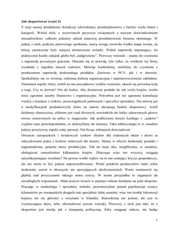 Jak eksportować (część I) Z racji naszej działalności doradczej odwiedzamy przedsiębiorstwa z bardzo wielu branż i kategorii. Wśród nich, z oczywistych przyczyn związanych z naszym doświadczeniem menadżerskim, całkiem pokaźny udział stanowią przedstawiciele biznesu okiennego. W jednej z nich, podczas pierwszego spotkania, naszą uwagę zwróciła wielka mapa świata, na której zaznaczone były miejsca dostarczenia stolarki. Widok naprawdę imponujący, bo praktycznie każdy zakątek globu był „nadgryziony”. Pierwszy wniosek – mamy do czynienia z naprawdę poważnym graczem. Okazało się to prawdą, tyle tylko, że wielkość tej firmy wynikała z zupełnie innych walorów. Mówiąc konkretniej, mieliśmy do czynienia z producentem naprawdę doskonałego produktu. Zarówno w PCV, jak i w drewnie. Spotkaliśmy się ze świetną, rodzinną kulturą organizacyjną i supernowoczesnym zakładem. Natomiast aspekt, który zrobił na nas początkowo wielkie wrażenie, okazał się poważną kulą u nogi. Czy to dziwne? Nie do końca. Aby dostarczać produkt do tak wielu krajów, trzeba mieć ogromne zasoby finansowe i organizacyjne. Potrzebna jest też ogromna kumulacja wiedzy o każdym z rynków, poszczególnych partnerach i specyfice sprzedaży. Nie mówię już o modyfikacjach produktowych, które na starcie obciążają budżet eksportowy. Jeżeli działamy chaotycznie, efektem jest rząd ślicznych, nowiutkich ale lekko zakurzonych głowic równo ustawionych na półce w magazynie. Jak podliczymy koszty każdego z „ataków” wyjdzie nam prawdopodobnie, że dołożyliśmy do interesu. Taka tablica-mapa to w zasadzie jedyny pozytywny aspekt całej operacji. Nie licząc zebranych doświadczeń. Otwarcie europejskich i światowych rynków zbytów dla rodzimych okien i drzwi to zdecydowanie jeden z kroków milowych dla branży. Mamy w ofercie doskonały produkt i nagromadzone, potężne moce produkcyjne. Tak na moje oko, moglibyśmy, w zasadzie, obsługiwać samodzielnie kilkanaście krajów. Dlaczego więc nie wszyscy osiągają satysfakcjonujące rezultaty? Na pewno wielki wpływ na to ma szalejący kryzys gospodarczy, ale nie może to być jedyne usprawiedliwienie. Wielu polskich producentów radzi sobie doskonale, nawet w obecnych, nie sprzyjających okolicznościach. Warto zastanowić się głębiej nad przyczynami takiego stanu rzeczy. W moim przypadku to sięgnięcie do nieodległych wspomnień. Mam jeszcze świeżo w pamięci własne działania na polu eksportu. Pracując w marketingu i sprzedaży stolarki, przemierzyłem ponad pięćdziesiąt tysięcy kilometrów po europejskich drogach (nie specjalnie lubię samolot, więc ten środek lokomocji kojarzy mi się głównie z wizytami w Irlandii). Rekordzistą nie jestem, ale jest to wystarczająco dużo, żeby sformułować pewne wnioski. Pierwszy z nich jest taki, że z eksportem jest trochę jak z kampanią polityczną. Żeby osiągnąć sukces, nie będąc 1 powszechnie znanym, trzeba mieć po prostu bardzo dobre buty. Relacje z odbiorcami, ich zaufanie i szacunek trzeba sobie po prostu wychodzić. Wymaga to zarówno czasu, jak i nakładów finansowych. Czekanie, że skapnie samo jest życzeniowe. Drugi czynnik jest już zdecydowanie bardziej złożony. Chodzi o analizę własnych zasobów i kompetencji w odniesieniu do wybranych rynków i ich specyfiki. Oceniam, że w tym miejscu właśnie popełniany jest pierwszy, gruby błąd, którego następstwa bywają opłakane. Jak dziś pamiętam pierwsze wizyty w przywoływanej już w tym artykule Irlandii. Wydawało się, że dla producentów okien to kraina mlekiem i miodem płynąca. Wystarczył jednak krótki rzut oka na dane makroekonomiczne związane z tym rynkiem, aby mieć pewność, że ta bańka optymizmu pęknie bardzo szybko. Ostatnią decyzją jaką należałoby podjąć w takiej sytuacji, byłoby inwestowanie w budowę trwałej sieci sprzedaży. Tym bardziej, że zainteresowanych było bardzo wielu. Diagnoza pojemności rynku to, rzecz jasna, nie jedyny wskaźnik, który należy poddać analizie. Co kraj to obyczaj. Dotyczy to zarówno charakterystyki dystrybucji, polityki cenowej, sposobów oddziaływania na odbiorców, czy też samego produktu. To oczywiste wskazówki, które winny być zawarte w strategii wejścia na obce rynki. Przyjrzyjmy się temu procesowi w ujęciu teoretycznym. Strategia w ramach marketingu międzynarodowego – wedle jednej z definicji – oznacza „formę wejścia na rynek zagraniczny w kontekście marketingowym”. Zgodnie z tą hipotezą warunkują one przyszłą, długofalową aktywność firmy na rynku, zaś od tego, czy stawiając pierwsze kroki na nowym rynku, obierzemy właściwy kierunek działania, zależeć będzie nie tylko ewentualny sukces rynkowy w krótkookresowej perspektywie, ale również perspektywa rozwoju działalności. W tymże kontekście używa się określeń: „etap internacjonalizacji przedsiębiorstwa” tudzież „forma wejścia i działania”. Wybrana metoda ekspansji nakreśla możliwości kontroli firmy nad operacjami marketingowymi. Wzajemna zależność strategii wejścia na rynek (oznaczającego powtarzalny proces, nie zaś pojedynczą operację) i strategii marketingowej realizowanej na nim, jest w takim wypadku zasadna. Strategia marketingowa definiowana jest również jako „sposoby wypełniania zamierzeń rynkowych firmy na rynku docelowym, które powinny gwarantować efektywną alokację zasobów oraz realizację jednolitych działań marketingowych, by możliwe było osiągnięcie celów przedsiębiorstwa jako całości na danym rynku albo w kontekście określonego produktu”. W przypadku, gdy docelowym rynkiem firmy jest rynek zagraniczny, ujętą w tenże sposób strategię, odnosi się do marketingu międzynarodowego. Zasadniczo dokonać tu można podziału na trzy grupy strategii: eksportu, kontraktowych (nie wymagających zaangażowania kapitałowego) oraz z zaangażowa