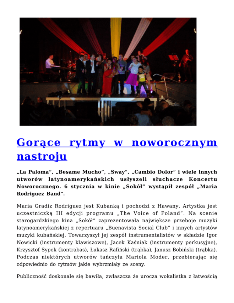 Gorące rytmy w noworocznym nastroju „La Paloma”, „Besame Mucho”, „Sway”, „Cambio Dolor” i wiele innych utworów latynoamerykańskich usłyszeli słuchacze Koncertu Noworocznego. 6 stycznia w kinie „Sokół” wystąpił zespół „Maria Rodriguez Band”. Maria Gradiz Rodriguez jest Kubanką i pochodzi z Hawany. Artystka jest uczestniczką III edycji programu „The Voice of Poland”. Na scenie starogardzkiego kina „Sokół” zaprezentowała największe przeboje muzyki latynoamerykańskiej z repertuaru „Buenavista Social Club” i innych artystów muzyki kubańskiej. Towarzyszył jej zespół instrumentalistów w składzie Igor Nowicki (instrumenty klawiszowe), Jacek Kaśniak (instrumenty perkusyjne), Krzysztof Sypek (kontrabas), Łukasz Rafiński (trąbka), Janusz Bobiński (trąbka). Podczas niektórych utworów tańczyła Mariola Moder, przebierając się odpowiednio do rytmów jakie wybrzmiały ze sceny. Publiczność doskonale się bawiła, zwłaszcza że urocza wokalistka z łatwością nawiązała kontakt z uczestnikami koncertu. Wiele osób zachęciła nawet do tańca samby, cza czy, salsy, rumby czy bossa novy. Ostatecznie zaprosiła na scenę kilka osób z publiczności, które wspólnie z wokalistką zatańczyły rytmiczną cza czę. M.in. do wspólnego tańca dali się namówić prezydenci Janusz Stankowiak i jego zastępca Maciej Kalinowski. Publiczność doceniła ich taniec gromkimi brawami. Mimo mrozu na dworze, w kinie było tego wieczoru naprawdę gorąco. To niewątpliwie zasługa energicznej, pełnej temperamentu i bardzo utalentowanej artystki. Publiczność nie chciała wypuścić Rodriguez, która jeszcze kilka razy bisowała po koncercie. Noworoczny koncert zainaugurował imprezy kulturalne, które odbędą się w Starogardzie Gdańskim w tym roku. Zanim na scenę wyszła gwiazda wieczoru Ewa Bechter – dyrektor Starogardzkiego Centrum Kultury przywitała zgromadzoną licznie publiczność i złożyła wszystkim życzenia noworoczne. Organizatorem koncertu było Starogardzkie Centrum Kultury. Sponsorami wydarzenia byli Bank Spółdzielczy w Starogardzie Gdańskim i Nadleśnictwo Starogard Gd. opracował:/Impresario Starogardzkiego Centrum Kultury/