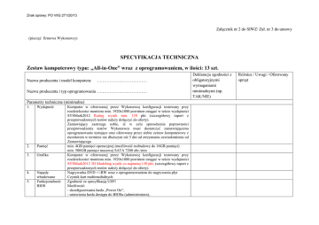 Znak sprawy: PO VIIG 271/20/13 Załącznik nr 2 do SIWZ/ Zał. nr 3 do umowy (pieczęć firmowa Wykonawcy) SPECYFIKACJA TECHICZA Zestaw komputerowy typu: „All-in-One” wraz z oprogramowaniem, w ilości: 13 szt. Nazwa producenta i model komputera: ……………………………… Nazwa producenta i typ oprogramowania ……………………………… Parametry techniczne (minimalne) 1. Wydajność 2. Pamięć 3. Grafika 4. Napędy wbudowane Funkcjonalność BIOS 5. Komputer w oferowanej przez Wykonawcę konfiguracji testowany przy rozdzielczości monitora min. 1920x1080 powinien osiągać w teście wydajności SYSMark2012 Rating wynik min. 130 pkt (szczegółowy raport z przeprowadzonych testów należy dołączyć do oferty). Zamawiający zastrzega sobie, iż w celu sprawdzenia poprawności przeprowadzenia testów Wykonawca musi dostarczyć zamawiającemu oprogramowanie testujące oraz oferowany przez siebie zestaw komputerowy z monitorem w terminie nie dłuższym niż 5 dni od otrzymania zawiadomienia od Zamawiającego min. 4GB pamięci operacyjnej (możliwość rozbudowy do 16GB pamięci) min. 500GB pamięci masowej SATA 7200 obr./min Komputer w oferowanej przez Wykonawcę konfiguracji testowany przy rozdzielczości monitora min. 1920x1080 powinien osiągać w teście wydajności SYSMark2012 3D Modeling wynik co najmniej 130 pkt. (szczegółowy raport z przeprowadzonych testów należy dołączyć do oferty). Nagrywarka DVD +/-RW wraz z oprogramowaniem do nagrywania płyt Czytnik kart multimedialnych Zgodność ze specyfikacją UEFl Możliwość: - skonfigurowania hasła „Power On”, - ustawienia hasła dostępu do BIOSu (administratora), Deklaracja zgodności z obligatoryjnymi wymaganiami minimalnymi (np. TAK/NIE) Różnica / Uwagi / Oferowany sprzęt Znak sprawy: PO VIIG 271/20/13 6. Funkcjonalność obudowy - blokady portów USB, karty sieciowej, karty audio - wyłączenia portów USB; -kontroli sekwencji boot-owania; - blokowania startu z urządzenia USB Możliwość odczytania z BIOS: - wersji BIOS - modelu procesora, prędkości procesora, wielkości pamięci podręcznej Cache L1, L2 i L3 - informacji o ilości pamięci RAM wraz z informacją o jej prędkości i technologii wykonania - informacji o dysku twardym: model oraz pojemność - Informacji o napędzie optycznym Możliwość wyłączenia/włączenia: zintegrowanej karty sieciowej, kontrolera audio, poszczególnych portów USB z poziomu BIOS bez uruchamiania systemu operacyjnego z dysku twardego komputera lub innych, podłączonych do niego, urządzeń zewnętrznych. Funkcja blokowania/odblokowania BOOT-owania komputera z dysku twardego, zewnętrznych urządzeń oraz sieci bez potrzeby uruchamiania systemu operacyjnego z dysku twardego komputera lub innych, podłączonych do niego, urządzeń zewnętrznych. Możliwość - bez potrzeby uruchamiania systemu operacyjnego z dysku twardego komputera lub innych, podłączonych do niego urządzeń zewnętrznych - ustawienia hasła na poziomie administratora. - typ All-in-One z ekranem LED antyodblaskowym min. 23" FullHD (1920x1080) o kontraście typowym min.: 1000:1; jasności min.: 250 cd/m2 - regulacja kąta nachylenia ekranu (-5/+30 stopni), opcjonalna regulacja wysokości do 11cm, obrotowa podstawa - zasilacz wewnętrzny o mocy max 230W i sprawności min 90% - konstrukcja pozwalająca na beznarzędziowy dostęp do komponentów (kart rozszerzeń, napędów) - minimalna ilość wnęk. 1x 5,25" zewnętrzne, 1x 3,5" wewnętrzne - możliwość zamontowania 1 dysku 3,5" lub do 2 dysków 2,5" - wizualny system diagnostyczny do sygnalizowania i diagnozowania problemów z komputerem i jego komponentami, sygnalizujący co najmniej: awarie procesora lub pamięci podręcznej procesora uszkodzenie lub brak pamięci RAM, uszkodzenie kontrolera Video - głośność jednostki centralnej mierzoną zgodnie z normą ISO 7779 oraz wykazaną zgodnie z normą ISO 9296 w pozycji operatora w trybie jałowym Znak sprawy: PO VIIG 271/20/13 7. Oprogramowanie (IDLE) wynoszącą maksymalnie 23 dB (wymaga się dostarczenia odpowiedniego certyfikatu lub deklaracji producenta) - System operacyjny klasy PC nie wymagający aktywacji za pomocą telefonu lub Internetu, spełniający następujące wymagania poprzez natywne dla niego mechanizmy, bez użycia dodatkowych aplikacji: • Możliwość dokonywania aktualizacji i poprawek systemu przez Internet z możliwością wyboru instalowanych poprawek; • Możliwość dokonywania uaktualnień sterowników urządzeń przez Internet – witrynę producenta systemu; • Darmowe aktualizacje w ramach wersji systemu operacyjnego przez Internet (niezbędne aktualizacje, poprawki, biuletyny bezpieczeństwa muszą być dostarczane bez dodatkowych opłat) – wymagane podanie nazwy strony serwera WWW; • Internetowa aktualizacja zapewniona w języku polskim; • Wbudowana zapora internetowa (firewall) dla ochrony połączeń internetowych; zintegrowana z systemem konsola do zarządzania ustawieniami zapory i regułami IP v4 i v6; • Zlokalizowane w języku polskim, co najmniej następujące elementy: menu, odtwarzacz multimediów, pomoc, komunikaty systemowe; • Wsparcie dla większości powszechnie używanych urządzeń peryferyjnych (drukarek, urządzeń sieciowych, standardów USB, Plug&Play, Wi-Fi) • Funkcjonalność automatycznej zmiany domyślnej drukarki w zależności od sieci, do której podłączony jest komputer • Interfejs użytkownika działający w trybie graficznym z elementami 3D, zintegrowana z interfejsem użytkownika interaktywna część pulpitu służącą do uruchamiania aplikacji, które użytkownik może dowolnie wymieniać i pobrać ze strony producenta. • Zabezpieczony hasłem hierarchiczny dostęp do systemu, konta i profile użytkowników zarządzane zdalnie; praca systemu w trybie ochrony kont użytkowników. • Zintegrowany z systemem moduł wyszukiwania informacji (plików różnego typu) dostępny z kilku poziomów: p