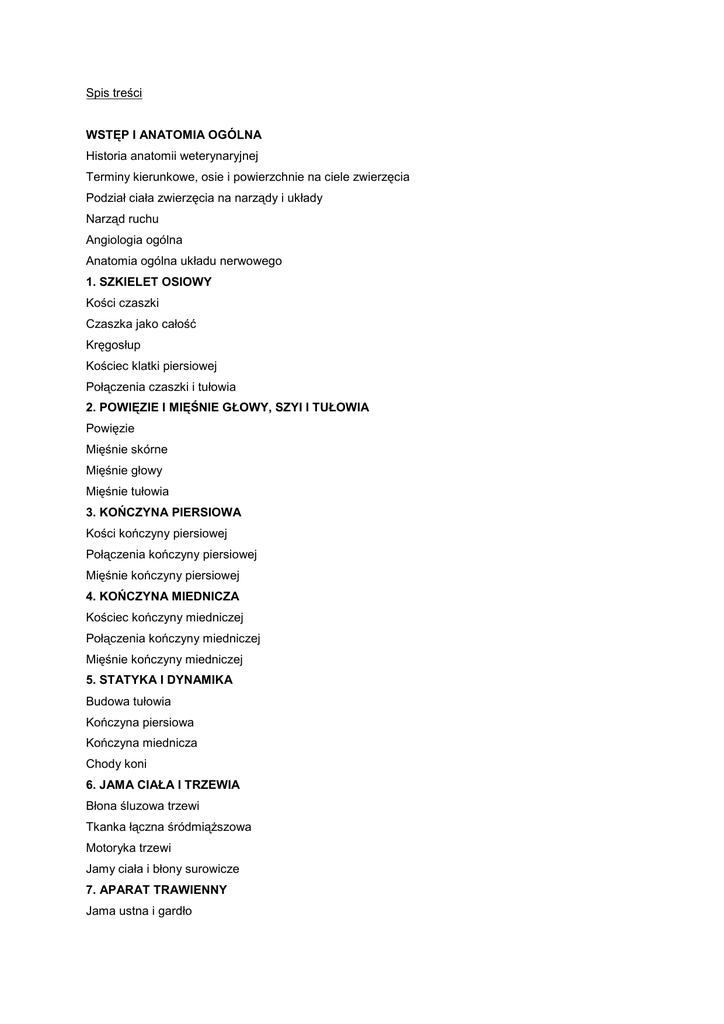 Spis treści WSTĘP I ANATOMIA OGÓLNA Historia anatomii weterynaryjnej Terminy kierunkowe, osie i powierzchnie na ciele zwierzęcia Podział ciała zwierzęcia na narządy i układy Narząd ruchu Angiologia ogólna Anatomia ogólna układu nerwowego 1. SZKIELET OSIOWY Kości czaszki Czaszka jako całość Kręgosłup Kościec klatki piersiowej Połączenia czaszki i tułowia 2. POWIĘZIE I MIĘŚNIE GŁOWY, SZYI I TUŁOWIA Powięzie Mięśnie skórne Mięśnie głowy Mięśnie tułowia 3. KOŃCZYNA PIERSIOWA Kości kończyny piersiowej Połączenia kończyny piersiowej Mięśnie kończyny piersiowej 4. KOŃCZYNA MIEDNICZA Kościec kończyny miedniczej Połączenia kończyny miedniczej Mięśnie kończyny miedniczej 5. STATYKA I DYNAMIKA Budowa tułowia Kończyna piersiowa Kończyna miednicza Chody koni 6. JAMA CIAŁA I TRZEWIA Błona śluzowa trzewi Tkanka łączna śródmiąŜszowa Motoryka trzewi Jamy ciała i błony surowicze 7. APARAT TRAWIENNY Jama ustna i gardło Doczaszkowa część przewodu pokarmowego: przełyk i Ŝołądek Środkowa i doogonowa część przewodu pokarmowego: jelito cienkie i jelito grube Gruczoły związane z przewodem pokarmowym 8. APARAT ODDECHOWY Funkcje układu oddechowego Górne drogi oddechowe Dolne drogi oddechowe 9. NARZĄDY MOCZOWE Nerka Miedniczka nerkowa Moczowód Pęcherz moczowy Cewka moczowa 10. NARZĄDY PŁCIOWE MĘSKIE Jądro Najądrze Nasieniowód Osłonki jądra Wyrostek pochwowy PołoŜenie moszny Zaopatrzenie naczyniowe i nerwowe jąder i ich osłonek Cewka moczowa Gruczoły płciowe dodatkowe Gruczoły pęcherzykowe Gruczoł krokowy, stercz Gruczoły opuszkowo – cewkowe Prącie Napletek Mięśnie prącia Zaopatrzenie naczyniowe i nerwowe cewki moczowej i prącia Erekcja i ejakulacja 11. śEŃSKIE NARZĄDY PŁCIOWE Jajnik PołoŜenie, kształt i rozmiar jajników Jajowód Macica Pochwa Srom Więzadła Mięśnie Naczynia krwionośne, chłonne i unerwienie 12. UKŁAD NACZYNIOWY Serce Naczynia 13. UKŁAD ODPORNOŚCIOWY I NARZĄDY CHŁONNE Naczynia chłonne Węzły chłonne Grasica Śledziona 14. UKŁAD NERWOWY Ośrodkowy układ nerwowy Obwodowy układ nerwowy Obwodowy autonomiczny układ nerwowy 15. GRUCZOŁY DOKREWNE Przysadka Szyszynka Tarczyca Przytarczyce Nadnercza Przyzwoje Wyspy trzustki Gruczoły płciowe jako gruczoły dokrewne 16. OKO (NARZĄD WZROKU) Gałka oczna Narządy dodatkowe oka Unaczynienie i unerwienie gałki ocznej Droga wzrokowa i odruch oczny 17. NARZĄD PRZEDSIONKOWO – ŚLIMAKOWY Ucho zewnętrzne Ucho środkowe Ucho wewnętrzne 18. POWŁOKA WSPÓLNA Tkanka podskórna Skóra Włosy Gruczoły skórne Gruczoł sutkowy Opuszki Narząd palcowy Róg 19. ANATOMIA TOPOGRAFICZNO – KLINICZNA Głowa Szyja Klatka piersiowa Brzuch Kończyna piersiowa Kończyna miednicza Rzutowanie narządów wewnętrznych na ściany ciała