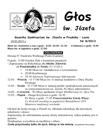 Głos św. Józefa Gazetka Sanktuarium św. Józefa w Prudniku – Lesie. 10.03.2013 r. Nr 8/2013 Msze św. niedzielne u nas o godz.: 8.00 10.00 11.30 Msza św. w tygodniu o godz. 17.00. w Dębowcu o godz. 8.45 OGŁOSZENIA Dzisiaj IV Niedziela Wielkiego Postu (Laetare) O godz. 15.00 Gorzkie Żale z kazaniem pasyjnym - Zapraszamy na Rekolekcje dla Służby Zdrowia od Poniedziałku do Środy (11-13.03.): • 19.00 Msza św. (dodatkowa) z rozważaniem • 20.00 Konferencja • 20.30 Adoracja Najświętszego Sakramentu 12.03. - Wtorek – O 17.00 Msza św. w intencji konklawe o Dary Ducha Świętego 13.03. - Środa – O 17.00 Msza w intencji próśb i podziękowań zanoszonych za wstawiennictwem św. Józefa. Po Mszy nabożeństwo. 14.03. - Czwartek – Po Mszy spotkanie Grupy Modlitewnej św. Ojca Pio. 15.03. - Piątek – Droga Krzyżowa o godz. 16.30 Po Mszy o godz. 17.45 Franciszkańska Szkoły Wiary: Co Kościół zawdzięcza papieżowi Benedyktowi XVI: Manowce medytacji wschodu. Od dziś do środy trwają w Parafii św. Michała rekolekcje dla dorosłych, młodzieży i dzieci. Zapraszamy do odwiedzania naszej strony internetowej. Adres podany jest w gazetce. Dziękujemy wszystkim za modlitwę i ofiary. Cuda przychodzą tylko do tych, którzy w nie wierzą. (przysłowie francuskie) ROZWAŻANIE NA NIEDZIELĘ Cnoty Boskie: Nadzieja. Popularne przysłowie ma do nadziei niezbyt wiele szacunku. Czy słusznie? Owszem, jeżeli polega na myśleniu życzeniowym: jakoś to będzie; może coś się nie stanie, rozejdzie się po kościach, itd. Tego rodzaju nadzieja jest pogańska, wydaje bowiem przyszłość człowieka na pastwę nie wiadomo jakich sił, które ewentualnie mogą być człowiekowi przychylne albo i nie. Taka nadzieja jest bezbożna i z całą pewnością niemądra. Nadzieja, do której człowiek o własnych siłach nie dociera, ma swoje umocowanie w wieczności. Jest darem Boga, tylko On bowiem może człowieka wyprowadzić poza ramy tego świata. Mocą cnoty nadziei chrześcijanin podejmuje swą działalność, nie oczekując jakiejkolwiek nagrody doczesnej, ani nie uzależniając jej kontynuowania od jej utrzymania. Przedmiotem cnoty nadziei nie jest bowiem ani skutek, ani doczesna gratyfikacja, lecz nagroda wieczna. Cnota nadziei pozwala spokojnie przyjąć to, że beneficjentami moich wysiłków pracy będą inni ludzie, podobnie jak ja korzystam z pracy innych. Uczy Jezus: Ja was wysłałem żąć to, nad czym wyście się nie natrudzili. Inni się natrudzili, a w ich trud wyście weszli (J 4,38). Potrzebujemy nadziei, tej od Boga pochodzącej, aby sprawnie funkcjonować także w wymiarze czysto doczesnym. Jeśli bowiem po śmierci nie istnieje nic, to zrozumiałe jest, że wszystko muszę otrzymać za swojego życia. Ktoś tak rozumujący z trudnością (jeśli w ogóle!) zgodzi się na to, by inni cieszyli się owocami jego/jej pracy. Będzie boleśnie przeżywał/przeżywała brak skądinąd zależnego uznania. I łatwo ulegnie frustrującemu przekonaniu, że jest źle i będzie gorzej. Cnota nadziei z kolei pozwala mi zrozumieć, że nie jest moją rzeczą (przynajmniej nie zawsze) zakończyć dzieło. Ojciec Niebieski oczekuje ode mnie wiernego wykonywania powierzonych mi dzieł. I niczego więcej. Co więcej: dzięki cnocie nadziei odkrywam zasadność podejmowania także tych inicjatyw, które w nikłym stopniu albo wcale (według mądrości tego świata) rokują sukces. Anglicy mają przysłowie, że gentleman zajmuje się tylko przegranymi sprawami. Przysłowie to jest przepięknym komentarzem do cnoty nadziei. To bowiem, co w oczach świata jest bezsensowne i przegrane, wcale takim nie musi być (i najczęściej nie jest) w oczach Bożych. To cnota nadziei ożywiała mistrzynie i mistrzów wiary, sławionych przez autora Listu do Hebrajczyków: Nie wystarczyłoby mi bowiem czasu na opowiadanie o Gedeonie, Baraku, Samsonie, Jeftem, Dawidzie, Samuelu i o prorokach, którzy przez wiarę pokonali królestwa, dokonali czynów sprawiedliwych, otrzymali obietnicę, zamknęli paszcze lwom, przygasili żar ognia, uniknęli ostrza miecza i wyleczyli się z niemocy, stali się bohaterami w wojnie i do ucieczki zmusili nieprzyjacielskie szyki. Dzięki dokonanym przez nich wskrzeszeniom niewiasty otrzymały swoich zmarłych. Jedni ponieśli katusze, nie przyjąwszy uwolnienia, aby otrzymać lepsze zmartwychwstanie. Inni zaś doznali zelżywości i biczowania, a nadto kajdan i więzienia. Kamienowano ich, przerzynano piłą, , przebijano mieczem; tułali się w skórach owczych, kozich, w nędzy, w utrapieniu, w ucisku - świat nie był ich wart - i błąkali się po pustyniach i górach, po jaskiniach i rozpadlinach ziemi. A ci wszyscy, choć ze względu na swą wiarę stali się godni pochwały, nie otrzymali przyrzeczonej obietnicy, gdyż Bóg, który nam lepszy los zgotował, nie chciał, aby oni doszli do doskonałości bez nas (Hbr 11,32-40). Modlitwa za pomyślny wybór papieża Domu Złotego, Arki i Niebieskiej Bramy i Gwiazdy! - grzmię słowy litanii, bo tak się ongiś praszczur w Watykanie modlił Sarbiewski. Na przyszłych wieków nadchodzącą sławę zwróć, o Królowo tej polskiej Korony, serca wyborców, spuść promień złocony w święte conclave. Daj kardynałom natchnienia i hartu, ażeby nowy papież mocniej jeszcze ścisnął ster świata, co świta w boleści na zgubę czartu. Maryjo, gwiazdo dla Piotrowej łodzi, w Tobie jedynie i trud, i zapłata, uczyń Watykan nową wiosną świata, który nadchodzi! O to, Królowo, schodząc w serca głębię, błagam, słuchając, co mówi Duch Boży: nowe papiestwo jak dąb się rozłoży przy polskim dębie. Konstanty Ildefons Gałczyński 1939 17.00 17.00 17.00 17.00 17.00 13.00 17.00 8.00 10.00 11.30 INTENCJE MSZALNE 11.03. - Poniedziałek I. Za ++ rodziców z obu stron: Czesława, Józefa z rodz. Kałużyńskich, Franciszka i Annę z rodz. Salawa oraz za ++ z rodzeństwa z obu stron. 12.03. - Wtorek I. W inten
