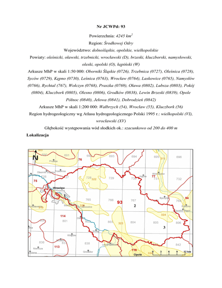 Nr JCWPd: 93 Powierzchnia: 4245 km2 Region: Środkowej Odry Województwo: dolnośląskie, opolskie, wielkopolskie Powiaty: oleśnicki, oławski, trzebnicki, wrocławski (D), brzeski, kluczborski, namysłowski, oleski, opolski (O), kępiński (W) Arkusze MhP w skali 1:50 000: Oborniki Śląskie (0726), Trzebnica (0727), Oleśnica (0728), Syców (0729), Kępno (0730), Leśnica (0763), Wrocław (0764), Laskowice (0765), Namysłów (0766), Rychtal (767), Wołczyn (0768), Praszka (0769), Oława (0802), Lubsza (0803), Pokój (0804), Kluczbork (0805), Olesno (0806), Grodków (0838), Lewin Brzeski (0839), Opole Północ (0840), Jełowa (0841), Dobrodzień (0842) Arkusze MhP w skali 1:200 000: Wałbrzych (54), Wrocław (55), Kluczbork (56) Region hydrogeologiczny wg Atlasu hydrogeologicznego Polski 1995 r.: wielkopolski (VI), wrocławski (XV) Głębokość występowania wód słodkich ok.: szacunkowo od 200 do 400 m Lokalizacja Profile 2 1 3 m n.p.m. Q Q M 100 0 Q M T T -100 T -200 warstwy wodonośne utwory słabo przepuszczalne poziomy zasolone SYMBOL całej JCWPd uwzględniający wszystkie profile: Q(1-2), (M1-2), (T(Z)) Opis symbolu: W czwartorzędzie występuje zwykle jeden poziom wodonośny (lokalnie mogą być to dwa poziomy). Poziom mioceński tworzą w zachodniej części obszaru dwie warstwy wodonośne, w kierunku wschodnim utwory mioceńskie wyklinowują się i całkowicie zanikają. Wody piętra triasowego w zachodniej części JCWPd są silnie zmineralizowane zasolone, w części wschodniej zalegają bezpośrednio pod utworami czwartorzędu (lokalne kontakty hydrauliczne) i są słabiej zmineralizowane. Q - wody porowe w utworach piaszczystych M - wody porowe w utworach piaszczystych T - wody szczelinowe w utworach piaskowcowych i szczelinowo-krasowe w utworach węglanowych Cecha szczególna JCWPd (ilościowa, chemiczna): brak GZWP występujące w obrębie JCWPd: GZWP 320 – Pradolina rzeki Odry (S Wrocław) (Qp), GZWP 322 - Zbiornik Oleśnica (Qp), GZWP Q 323 – Subzbiornik rzeki Stobrawa (Tr), GZWP 324 – Dolina kopalna Kluczbork (Qk), GZWP 335 – Zbiornik Krapkowice – Strzelce Opolskie (T1)