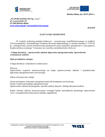 Bielsko-Biała, dn. 09.07.2015 r. „WAWRZASZEK ISS Sp. z o.o.” ul. Leszczyńska 22 43-300 Bielsko-Biała www.wiss.com.pl, [email protected] R35.029 ZAPYTANIE OFERTOWE W związku realizacją projektu badawczo - rozwojowego współfinansowanego ze środków Unii Europejskiej z Europejskiego Funduszu Rozwoju Regionalnego w ramach działania 1.5 PO IG pt. „Zintegrowany system monitorowania parametrów pracy pojazdów specjalnych w celu poprawy bezpieczeństwa czynnego” zwracamy się z prośbą o przedstawienie oferty na: - Usługę doradczą – opracowanie założeń algorytmu oprogramowania. Sprawdzenie wykonanych założeń. Opis przedmiotu zakupu: Usługa doradcza o charakterze technicznym. Dotyczy: Zapewnieniu wsparcia merytorycznego na etapie opracowywania założeń i projektowania algorytmu oprogramowania serwisowego. Zakres merytoryczny usługi: Ocena pod kątem wykonania oprogramowania dla komputera serwisowego. Ocena i analiza powstałego oprogramowania. Opracowanie założeń do programu, sposobu analizy danych i obsługi dla pracowników. Każdy element zakresu merytorycznego wymagał będzie sporządzenia pisemnego opracowania wraz z uzasadnieniem dotyczącym danego zagadnienia. Zintegrowany system monitorowania parametrów pracy pojazdów specjalnych w celu poprawy bezpieczeństwa czynnego INNOTECH-K3/IN3/17/226833/NCBiR/14 -1- Kryteria wyboru oferty: Wybór najkorzystniejszej oferty nastąpi w oparciu o następujące kryteria: L.p. Nazwa kryterium Maksymalna ilość punktów 1. Cena netto 100 (najlepsza oferta 100 pkt, każda kolejna 10 pkt mniej) Razem 100 Złożona oferta powinna zawierać: Nazwę i adres oferenta Cenę netto oraz brutto Warunki i termin płatności Datę sporządzenia oferty Datę ważności oferty Oferta może zostać dostarczona: - osobiście do siedziby firmy: „WAWRZASZEK ISS Sp. z o.o.”, ul. Leszczyńska 22, 43-300 Bielsko-Biała - pocztą na adres w/w adres siedziby firmy - pocztą elektroniczną na adres: [email protected] Oferta powinna być ważna, co najmniej do: 31.07.2015 r. Termin składania ofert upływa w dniu: 17.07.2015 r. Wszelkie kontakty w sprawach technicznych Szczegółowe wymagania i dokumentacja projektowa znajdują się w siedzibie Spółki. Zapraszamy w tej sprawie do kontaktu z panem Rafałem Warzecha, który udzieli informacji, tel.: 33 87 70 830; 608 38 79 70 E-mail: [email protected] Zamawiający zastrzega sobie prawo do nie rozstrzygnięcia postępowania ofertowego bez podawania przyczyny. Oferty niespełniające wymagań opisanych w zapytaniu nie będą podlegały ocenie. Oferta może zostać przygotowania na formularzu ofertowym stanowiącym załącznik nr 1 do niniejszego zapytania ofertowego. Zintegrowany system monitorowania parametrów pracy pojazdów specjalnych w celu poprawy bezpieczeństwa czynnego INNOTECH-K3/IN3/17/226833/NCBiR/14 -2- Załącznik nr 1 – Formularz ofertowy ….......…....................................... / Miejscowość, data / ….......…....................................... ….......…....................................... ….......…....................................... ….......…....................................... / Nazwa i adres oferenta/wykonawcy / ….......…....................................... ….......…....................................... ….......…....................................... ….......…....................................... / Imię i nazwisko oraz telefon osoby upoważnionej do kontaktu / - Usługę doradczą – opracowanie założeń algorytmu oprogramowania. Sprawdzenie wykonanych założeń. Cena netto:......................................................... VAT:.................................................................. Cena brutto:....................................................... Sposób i termin płatności:................................. W podanej powyżej cenie uwzględnione zostały wszystkie koszty wykonania przedmiotu zamówienia. 1. Oświadczamy, że zapoznaliśmy się z treścią zapytania ofertowego i nie wnosimy do niego zastrzeżeń oraz przyjmujemy warunki w nim zawarte. 2. Oświadczamy, że zapoznaliśmy się z dokumentacją projektową, a tym samym zdobyliśmy konieczne informacje do przygotowania oferty. 3. Oświadczamy, że posiadamy zdolność techniczno-organizacyjną do wykonania przedmiotu zamówienia. 3. Oświadczamy, że uważamy się za związanych niniejszą ofertą do dnia 31.07.2015 r. ….......…....................................... / data sporządzenia oferty i podpis osoby upoważnionej do jej złożenia / Zintegrowany system monitorowania parametrów pracy pojazdów specjalnych w celu poprawy bezpieczeństwa czynnego INNOTECH-K3/IN3/17/226833/NCBiR/14 -3- Protokół Odbioru Usługę doradczą – opracowanie założeń algorytmu oprogramowania. Sprawdzenie wykonanych założeń. Wykonanego w ramach umowy ______ z dnia __________ 1. Data przeprowadzenia odbioru: …………………………………………………………………………………………………. 2. Miejsce przeprowadzenia odbioru: …………………………………………………………………………………………………. 3. Dostarczona dokumentacja: …………………………………………………………………………………………………. 4. Uwagi: ………………………………………………………………………………………………… ………………………………………………………………………………………………………………………………………………………………. ………………………………………………………………………………………………………………………………………………………………. …………………………………………………………………………………………………………………………