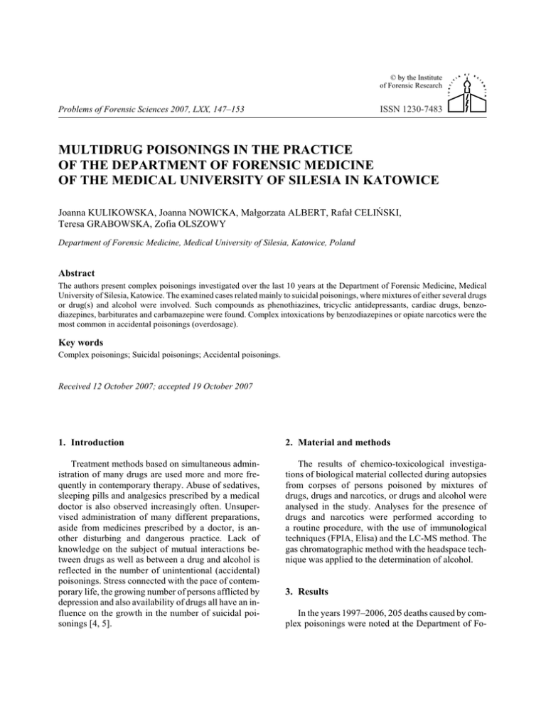 © by the Institute of Forensic Research ISSN 1230-7483 Problems of Forensic Sciences 2007, LXX, 147–153 MULTIDRUG POISONINGS IN THE PRACTICE OF THE DEPARTMENT OF FORENSIC MEDICINE OF THE MEDICAL UNIVERSITY OF SILESIA IN KATOWICE Joanna KULIKOWSKA, Joanna NOWICKA, Ma³gorzata ALBERT, Rafa³ CELIÑSKI, Teresa GRABOWSKA, Zofia OLSZOWY Department of Forensic Medicine, Medical University of Silesia, Katowice, Poland Abstract The authors present complex poisonings investigated over the last 10 years at the Department of Forensic Medicine, Medical University of Silesia, Katowice. The examined cases related mainly to suicidal poisonings, where mixtures of either several drugs or drug(s) and alcohol were involved. Such compounds as phenothiazines, tricyclic antidepressants, cardiac drugs, benzodiazepines, barbiturates and carbamazepine were found. Complex intoxications by benzodiazepines or opiate narcotics were the most common in accidental poisonings (overdosage). Key words Complex poisonings; Suicidal poisonings; Accidental poisonings. Received 12 October 2007; accepted 19 October 2007 1. Introduction 2. Material and methods Treatment methods based on simultaneous administration of many drugs are used more and more frequently in contemporary therapy. Abuse of sedatives, sleeping pills and analgesics prescribed by a medical doctor is also observed increasingly often. Unsupervised administration of many different preparations, aside from medicines prescribed by a doctor, is another disturbing and dangerous practice. Lack of knowledge on the subject of mutual interactions between drugs as well as between a drug and alcohol is reflected in the number of unintentional (accidental) poisonings. Stress connected with the pace of contemporary life, the growing number of persons afflicted by depression and also availability of drugs all have an influence on the growth in the number of suicidal poisonings [4, 5]. The results of chemico-toxicological investigations of biological material collected during autopsies from corpses of persons poisoned by mixtures of drugs, drugs and narcotics, or drugs and alcohol were analysed in the study. Analyses for the presence of drugs and narcotics were performed according to a routine procedure, with the use of immunological techniques (FPIA, Elisa) and the LC-MS method. The gas chromatographic method with the headspace technique was applied to the determination of alcohol. 3. Results In the years 1997–2006, 205 deaths caused by complex poisonings were noted at the Department of Fo- 148 J. Kulikowska, J. Nowicka, M. Albert et al. rensic Medicine in Katowice. The conducted autopsies did not allow the cause of death to be unequivocally established. In most of the cases, the histopathologic examinations which were also performed did not confirm that death resulted from a disease. In suicidal poisonings, the cause of death was often indicated by circumstances of the event: farewell letters, empty packs of drugs found or earlier suicide attempts. The undertaken chemico-toxicological examinations were aimed at confirmation of the findings of investigation. Characteristics of the analysed group are presented in Table I. TABLE I. TOTAL NUMBER OF COMPLEX POISONINGS ACCORDING TO THE GENDER OF THE POISONED PERSONS Kind of poisoning Women Men Total Accidental 32 95 127 Suicidal 29 49 78 Total 61 144 205 The structure of complex poisonings noted in the Department of Forensic Medicine of the Medical University of Silesia in Katowice during the last 10 years, taking into account the number of administered drugs and alcohol, is presented in Table II. The most frequently noted combinations of used drugs are presented in successive Tables (III–X). 4. Discussion In the analysed group of complex poisonings, 127 cases concerned unintentional (accidental) intoxications, which were mainly connected with opiate addiction (70 cases). 78 cases concerned suicidal attempts by use of several drugs or drug(s) and alcohol. The discussed group consisted of 61 women and 144 men (aged 16–60 years). The predominance of men was observed both in accidental and suicidal poisonings. 97 persons, i.e. 55 women and 42 men, consumed both alcohol and drugs. Alcohol concentration was in a broad range – from 0.3 to 4.6‰. The largest number of accidental poisonings was caused by two substances; however, poisonings by one substance in interaction with ethanol predominated amongst suicidal poisonings. Higher concentrations of alcohol were observed in accidental poisonings in comparison to suicidal poisonings. Concentrations of drugs in suicidal poisonings were located within a broad range, and were higher than in cases of accidental poisonings. Psychoactive substances such as benzodiazepines, phenothiazines, tricyclic antidepressants and derivatives of barbituric acid, as well as narcotic analgesics, cardiac drugs, antiepileptic drugs and analgesics, were detected most often both in intentional and accidental poisonings. The presented observations confirm cases described in papers of other authors [1, 2, 3]. Benzodiazepines – sedative, anticonvulsive, sleeping and miorelaxing drugs – are considered safe, but they have a large addictive potential [6]. Their pres- TABLE II. STRUCTURE OF COMPLEX POISONINGS ACCORDING TO THE NUMBER OF ADMINISTERED DRUGS AND ALCOHOL Accidental poisoning Suicidal poisoning Total Women Men Women+Men Women Men Women+Men 1 drug + alcohol 14 24 38 8 20 28 66 2 drugs 7 39 46 11 11 22 68 2 drugs + alcohol 3 9 12 2 9 11 23 3 drugs 5 18 23 5 2 7 30 3 drugs + alcohol 1 3 4 – 1 1 5 4 drugs 1 2 3 1 4 5 8 4 drugs + alcohol 1 – 1 1 1 2 3 more – – – 1 1 2 2 32 95 127 29 49 78 205 Blood alcohol concentration c Î <0.4–4.6 ‰> cmean = 1.67 ‰ c Î < 0.3–2.7 ‰> cmean = 1.33 ‰ Problems of Forensic Sciences 2007, LXX, 147–153 149 Multidrug poisonings in the practice of the Department of Forensic... TABLE III. TYPE OF SUBSTANCE IN COMPLEX POISONINGS BY ONE SUBSTANCE AND 