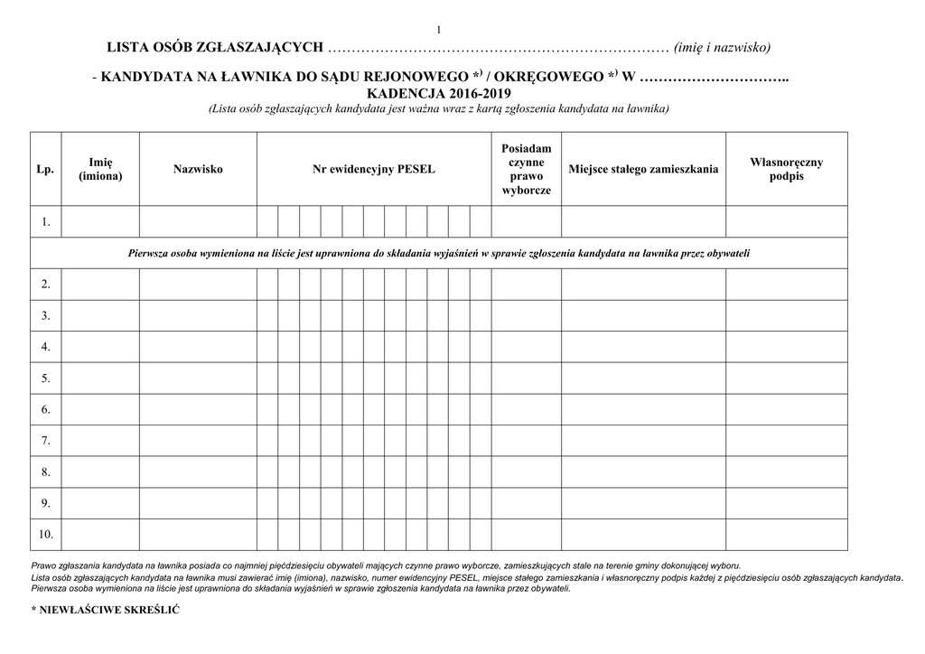 1 LISTA OSÓB ZGŁASZAJĄCYCH ……………………………………………………………… (imię i nazwisko) - KANDYDATA NA ŁAWNIKA DO SĄDU REJONOWEGO *) / OKRĘGOWEGO *) W ………………………….. KADENCJA 2016-2019 (Lista osób zgłaszających kandydata jest ważna wraz z kartą zgłoszenia kandydata na ławnika) Lp. Imię (imiona) Nazwisko Nr ewidencyjny PESEL Posiadam czynne prawo wyborcze Miejsce stałego zamieszkania Własnoręczny podpis 1. Pierwsza osoba wymieniona na liście jest uprawniona do składania wyjaśnień w sprawie zgłoszenia kandydata na ławnika przez obywateli 2. 3. 4. 5. 6. 7. 8. 9. 10. Prawo zgłaszania kandydata na ławnika posiada co najmniej pięćdziesięciu obywateli mających czynne prawo wyborcze, zamieszkujących stale na terenie gminy dokonującej wyboru. Lista osób zgłaszających kandydata na ławnika musi zawierać imię (imiona), nazwisko, numer ewidencyjny PESEL, miejsce stałego zamieszkania i własnoręczny podpis każdej z pięćdziesięciu osób zgłaszających kandydata . Pierwsza osoba wymieniona na liście jest uprawniona do składania wyjaśnień w sprawie zgłoszenia kandydata na ławnika przez obywateli. * NIEWŁAŚCIWE SKREŚLIĆ 2 LISTA OSÓB ZGŁASZAJĄCYCH ……………………………………………………………… (imię i nazwisko) - KANDYDATA NA ŁAWNIKA DO SĄDU REJONOWEGO *) / OKRĘGOWEGO *) W ………………………….. KADENCJA 2016-2019 (Lista osób zgłaszających kandydata jest ważna wraz z kartą zgłoszenia kandydata na ławnika) Lp. Imię (imiona) Nazwisko Nr ewidencyjny PESEL Posiadam czynne prawo wyborcze Miejsce stałego zamieszkania Własnoręczny podpis 11. 12. 13. 14. 15. 16. 17. 18. 19. 20. Prawo zgłaszania kandydata na ławnika posiada co najmniej pięćdziesięciu obywateli mających czynne prawo wyborcze, zamieszkujących stale na terenie gminy dokonującej wyboru. Lista osób zgłaszających kandydata na ławnika musi zawierać imię (imiona), nazwisko, numer ewidencyjny PESEL, miejsce stałego zamieszkania i własnoręczny podpis każdej z pięćdziesięciu osób zgłaszających kandydata . Pierwsza osoba wymieniona na liście jest uprawniona do składania wyjaśnień w sprawie zgłoszenia kandydata na ławnika przez obywateli. * NIEWŁAŚCIWE SKREŚLIĆ 3 LISTA OSÓB ZGŁASZAJĄCYCH ……………………………………………………………… (imię i nazwisko) - KANDYDATA NA ŁAWNIKA DO SĄDU REJONOWEGO *) / OKRĘGOWEGO *) W ………………………….. KADENCJA 2016-2019 (Lista osób zgłaszających kandydata jest ważna wraz z kartą zgłoszenia kandydata na ławnika) Lp. Imię (imiona) Nazwisko Nr ewidencyjny PESEL Posiadam czynne prawo wyborcze Miejsce stałego zamieszkania Własnoręczny podpis 21. 22. 23. 24. 25. 26. 27. 28. 29. 30. Prawo zgłaszania kandydata na ławnika posiada co najmniej pięćdziesięciu obywateli mających czynne prawo wyborcze, zamieszkujących stale na terenie gminy dokonującej wyboru. Lista osób zgłaszających kandydata na ławnika musi zawierać imię (imiona), nazwisko, numer ewidencyjny PESEL, miejsce stałego zamieszkania i własnoręczny podpis każdej z pięćdziesięciu osób zgłaszających kandydata . Pierwsza osoba wymieniona na liście jest uprawniona do składania wyjaśnień w sprawie zgłoszenia kandydata na ławnika przez obywateli. * NIEWŁAŚCIWE SKREŚLIĆ 4 LISTA OSÓB ZGŁASZAJĄCYCH ……………………………………………………………… (imię i nazwisko) - KANDYDATA NA ŁAWNIKA DO SĄDU REJONOWEGO *) / OKRĘGOWEGO *) W ………………………….. KADENCJA 2016-2019 (Lista osób zgłaszających kandydata jest ważna wraz z kartą zgłoszenia kandydata na ławnika) Lp. Imię (imiona) Nazwisko Nr ewidencyjny PESEL Posiadam czynne prawo wyborcze Miejsce stałego zamieszkania Własnoręczny podpis 31. 32. 33. 34. 35. 36. 37. 38. 39. 40. Prawo zgłaszania kandydata na ławnika posiada co najmniej pięćdziesięciu obywateli mających czynne prawo wyborcze, zamieszkujących stale na terenie gminy dokonującej wyboru. Lista osób zgłaszających kandydata na ławnika musi zawierać imię (imiona), nazwisko, numer ewidencyjny PESEL, miejsce stałego zamieszkania i własnoręczny podpis każdej z pięćdziesięciu osób zgłaszających kandydata . Pierwsza osoba wymieniona na liście jest uprawniona do składania wyjaśnień w sprawie zgłoszenia kandydata na ławnika przez obywateli. * NIEWŁAŚCIWE SKREŚLIĆ 5 LISTA OSÓB ZGŁASZAJĄCYCH ……………………………………………………………… (imię i nazwisko) - KANDYDATA NA ŁAWNIKA DO SĄDU REJONOWEGO *) / OKRĘGOWEGO *) W ………………………….. KADENCJA 2016-2019 (Lista osób zgłaszających kandydata jest ważna wraz z kartą zgłoszenia kandydata na ławnika) Lp. Imię (imiona) Nazwisko Nr ewidencyjny PESEL Posiadam czynne prawo wyborcze Miejsce stałego zamieszkania Własnoręczny podpis 41. 42. 43. 44. 45. 46. 47. 48. 49. 50. Prawo zgłaszania kandydata na ławnika posiada co najmniej pięćdziesięciu obywateli mających czynne prawo wyborcze, zamieszkujących stale na terenie gminy dokonującej wyboru. Lista osób zgłaszających kandydata na ławnika musi zawierać imię (imiona), nazwisko, numer ewidencyjny PESEL, miejsce stałego zamieszkania i własnoręczny podpis każdej z pięćdziesięciu osób zgłaszających kandydata . Pierwsza osoba wymieniona na liście jest uprawniona do składania wyjaśnień w sprawie zgłoszenia kandydata na ławnika przez obywateli. * NIEWŁAŚCIWE SKREŚLIĆ 6 LISTA OSÓB ZGŁASZAJĄCYCH ……………………………………………………………… (imię i nazwisko) - KANDYDATA NA ŁAWNIKA DO SĄDU REJONOWEGO *) / OKRĘGOWEGO *) W ………………………….. KADENCJA 2016-2019 (Lista osób zgłaszających kandydata jest ważna wraz z kartą zgłoszenia kandydata na ławnika) Lp. Imię (imiona) Nazwisko Nr ewidencyjny PESEL Posiadam czynne 