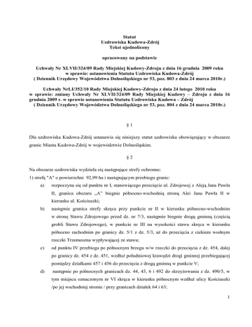 Statut Uzdrowiska Kudowa-Zdrój Tekst ujednolicony opracowany na podstawie Uchwały Nr XLVII/324/09 Rady Miejskiej Kudowy-Zdroju z dnia 16 grudnia 2009 roku w sprawie: ustanowienia Statutu Uzdrowiska Kudowa-Zdrój ( Dziennik Urzędowy Województwa Dolnośląskiego nr 53, poz. 803 z dnia 24 marca 2010r.) Uchwały NrLI/352/10 Rady Miejskiej Kudowy-Zdroju z dnia 24 lutego 2010 roku w sprawie: zmiany Uchwały Nr XLVII/324/09 Rady Miejskiej Kudowy – Zdroju z dnia 16 grudnia 2009 r. w sprawie ustanowienia Statutu Uzdrowiska Kudowa – Zdrój ( Dziennik Urzędowy Województwa Dolnośląskiego nr 53, poz. 804 z dnia 24 marca 2010r.) §1 Dla uzdrowiska Kudowa-Zdrój ustanawia się niniejszy statut uzdrowiska obowiązujący w obszarze granic Miasta Kudowa-Zdrój w województwie Dolnośląskim. §2 Na obszarze uzdrowiska wydziela się następujące strefy ochronne: 1) strefę "A" o powierzchni 92,99 ha i następującym przebiegu granic: a) rozpoczyna się od punktu nr I, stanowiącego przecięcie ul. Zdrojowej z Aleją Jana Pawła II, granica obszaru „A” biegnie północno-wschodnią stroną Alei Jana Pawła II w kierunku ul. Kościuszki; b) następnie granica strefy skręca przy punkcie nr II w kierunku północno-wschodnim w stronę Stawu Zdrojowego przed dz. nr 7/3, następnie biegnie drogą gminną (częścią grobli Stawu Zdrojowego), w punkcie nr III na wysokości stawu skręca w kierunku północno zachodnim po granicy dz. 5/1 z dz. 5/3, aŜ do przecięcia z ciekiem wodnym rzeczki Trzemeszna wypływającej ze stawu; c) od punktu IV przebiega po północnym brzegu w/w rzeczki do przecięcia z dz. 454, dalej po granicy dz. 454 z dz. 451, wzdłuŜ południowej krawędzi drogi gminnej przebiegającej pomiędzy działkami 457 i 456 do przecięcia z drogą gminną w punkcie V; d) następnie po północnych granicach dz. 44, 45, 6 i 492 do skrzyŜowania z dz. 490/5, w tym miejscu oznaczonym nr VI skręca w kierunku północnym wzdłuŜ ulicy Kościuszki /po jej wschodniej stronie / przy granicach działek 64 i 63; 1 e) w punkcie VII skręca wzdłuŜ granicy północnej działki 63 i 56 do punktu VIII , w tym miejscu przebiega dalej w kierunku wschodnim po granicy północnej działek 56, 57, 59, 60, 61 do punktu IX, gdzie skręca pod kątem prostym w kierunku południowo – zachodnim wzdłuŜ granicy działki 61, aŜ do punktu X na styku z działką 71; f) okala działkę 71 /ze znajdującą się anteną przekaźnikową Telewizyjnego Ośrodka Nadawczego – w punktach oznaczonych XI i XII/ do zachodniego naroŜnika dz. 71, omijając teren wieŜy; g) następnie przebiega do końca pasa drogowego ul. Moniuszki i tu granica przecina teren leśny dz. 289 i przebiega do punktu przecięcia dz. 189 z dz. 180, wzdłuŜ granicy dz. 180 z dz. 181 do punktu nr XIII skrzyŜowania z ulicą Okrzei; h) następnie wzdłuŜ z dojazdową drogą gminną do punktu XIV, po granicy tejŜe drogi z dz. 179/2 i 178/24 do skrzyŜowania ul. 1 Maja punkt nr XV; i) następnie wzdłuŜ północnej krawędzi ulicy 1 Maja do punktu nr XVI - skrzyŜowania z ul. Warszawską, dalej południowo-zachodnią krawędzią ul. Warszawskiej do skrzyŜowania z ulica Chopina – punkt XVII, po granicy dz. 196 aŜ do naroŜnika dz. 195; j) następnie po granicy dz. 3/2 i 4 do punktu XVIII, okalając działkę 4 styka się z ulicą Słoneczną w punkcie XIX; k) następnie przebiega wzdłuŜ ulicy Słonecznej /jej wschodnia krawędzią / do styku z działką nr 2 – punkt XX, w tym miejscu skręca w kierunku zachodnim do punktu przecięcia z działką Kombatantów nr 6 – punkt XXI skręca wzdłuŜ /zachodniej krawędzi/ ulicy do naroŜnika działki 260/4, w punkcie nr XXII nawraca wzdłuŜ południowej granicy dz. 260/4 i 259 aŜ do pasa drogowego ulicy J. Słowackiego; l) następnie przebiega po granicy dz. 268/3 do punktu nr XXIII, gdzie skręca w kierunku północno zachodnim wzdłuŜ granicy dz. 268/3, 268/2, 268/1, 269 i 270, w punkcie nr XXIV wzdłuŜ krawędzi ulicy J. Słowackiego; m) następnie przechodzi skosem przez dz. 229/7 do południowej krawędzi drogi dojazdowej do Szpitala Uzdrowiskowego /24 Szpital Wojskowy/ i następnie łączy się z punktem wyjścia nr I. 2) strefę "B " o powierzchni o powierzchni 367,49 ha i następującym przebiegu granic: a) od punktu stanowiącego przecięcie ul. Zdrojowej z ul. Nad Potokiem rozpoczyna przebieg w kierunku zachodnim, wzdłuŜ północnej krawędzi ul. Nad Potokiem; 2 b) w odległości ok. 500 m od w/w punktu skręca w kierunku północnym przy naroŜniku działki nr 115/1 w ulicę bez nazwy /działka nr 108/, dalej przebiega wzdłuŜ działek: 115/2, 115/5, 115/20, 115/8, 115/13, 115/14, 115/19, 110, 109, aŜ do styku prostopadłego z pasem granicznym /działka nr 17/, następnie przebiega pasem granicznym Polski i Republiki Czeskiej; c) od tego miejsca granica strefy „B” i „C” przebiega jednocześnie wzdłuŜ granicy zachodniej miasta po granicy państwa, aŜ do cieku wodnego na działce nr 394; d) dalej granica strefy B skręca w kierunku północno-wschodnim, wzdłuŜ cieku wodnego i granicy działki nr 394,407, 413, 421/1, 383, 380/2, 282/2, 368/1, 367, 366, 364, 284, 299, 302, 304, 305, 306, 307, 308/3, aŜ do działki nr 98/7, gdzie kończy się wydzielony geodezyjnie ciek wodny; e) dalej granica obszaru skręca w kierunku północno-wschodnim i przecina działkę nr 97 i przebiega dalej północną granicą działki 88/2 i 107/2, przecinając prostopadle działkę 87 do drogi gminnej oznaczonej numerem 108/7; f) dalej granica przebiega tą droga wzdłuŜ działek 107/2 i 107/1 do połączenia się z ul. Kościuszki; g) dalej zachodnią krawędzią ul. Kościuszki do przecięcia ze ścieŜką /działka nr 258/ przebiegającą przez potok wzdłuŜ działek nr 165, 167, 215, 261, kontynuując kierunek przecina dz. 262 i łączy się ze ścieŜką – dz. 263; h) kontynuując przebieg ścieŜką - dz. 263 i 76/3 wzdłuŜ wschodniej krawędzi działki 289 i 75, przec