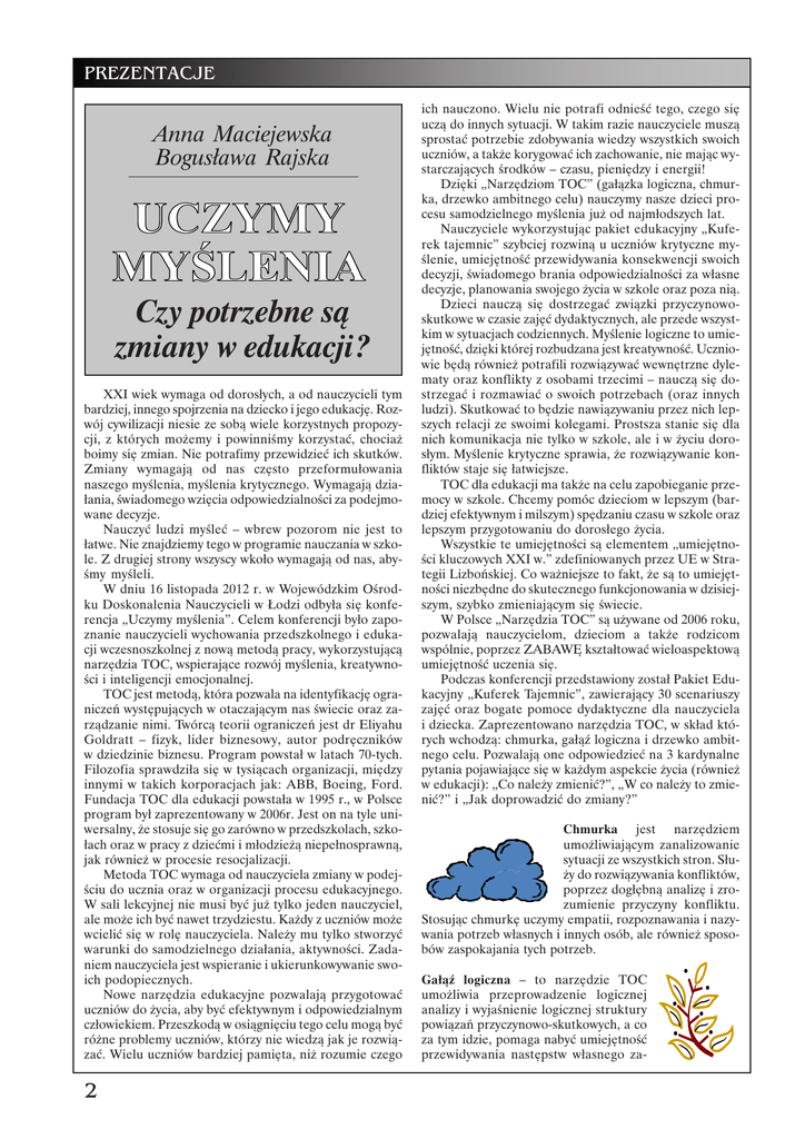 PREZENTACJE Anna Maciejewska Bogusława Rajska Czy potrzebne są zmiany w edukacji? XXI wiek wymaga od dorosłych, a od nauczycieli tym bardziej, innego spojrzenia na dziecko i jego edukację. Rozwój cywilizacji niesie ze sobą wiele korzystnych propozycji, z których możemy i powinniśmy korzystać, chociaż boimy się zmian. Nie potrafimy przewidzieć ich skutków. Zmiany wymagają od nas często przeformułowania naszego myślenia, myślenia krytycznego. Wymagają działania, świadomego wzięcia odpowiedzialności za podejmowane decyzje. Nauczyć ludzi myśleć – wbrew pozorom nie jest to łatwe. Nie znajdziemy tego w programie nauczania w szkole. Z drugiej strony wszyscy wkoło wymagają od nas, abyśmy myśleli. W dniu 16 listopada 2012 r. w Wojewódzkim Ośrodku Doskonalenia Nauczycieli w Łodzi odbyła się konferencja „Uczymy myślenia”. Celem konferencji było zapoznanie nauczycieli wychowania przedszkolnego i edukacji wczesnoszkolnej z nową metodą pracy, wykorzystującą narzędzia TOC, wspierające rozwój myślenia, kreatywności i inteligencji emocjonalnej. TOC jest metodą, która pozwala na identyfikację ograniczeń występujących w otaczającym nas świecie oraz zarządzanie nimi. Twórcą teorii ograniczeń jest dr Eliyahu Goldratt – fizyk, lider biznesowy, autor podręczników w dziedzinie biznesu. Program powstał w latach 70-tych. Filozofia sprawdziła się w tysiącach organizacji, między innymi w takich korporacjach jak: ABB, Boeing, Ford. Fundacja TOC dla edukacji powstała w 1995 r., w Polsce program był zaprezentowany w 2006r. Jest on na tyle uniwersalny, że stosuje się go zarówno w przedszkolach, szkołach oraz w pracy z dziećmi i młodzieżą niepełnosprawną, jak również w procesie resocjalizacji. Metoda TOC wymaga od nauczyciela zmiany w podejściu do ucznia oraz w organizacji procesu edukacyjnego. W sali lekcyjnej nie musi być już tylko jeden nauczyciel, ale może ich być nawet trzydziestu. Każdy z uczniów może wcielić się w rolę nauczyciela. Należy mu tylko stworzyć warunki do samodzielnego działania, aktywności. Zadaniem nauczyciela jest wspieranie i ukierunkowywanie swoich podopiecznych. Nowe narzędzia edukacyjne pozwalają przygotować uczniów do życia, aby być efektywnym i odpowiedzialnym człowiekiem. Przeszkodą w osiągnięciu tego celu mogą być różne problemy uczniów, którzy nie wiedzą jak je rozwiązać. Wielu uczniów bardziej pamięta, niż rozumie czego 2 ich nauczono. Wielu nie potrafi odnieść tego, czego się uczą do innych sytuacji. W takim razie nauczyciele muszą sprostać potrzebie zdobywania wiedzy wszystkich swoich uczniów, a także korygować ich zachowanie, nie mając wystarczających środków – czasu, pieniędzy i energii! Dzięki „Narzędziom TOC” (gałązka logiczna, chmurka, drzewko ambitnego celu) nauczymy nasze dzieci procesu samodzielnego myślenia już od najmłodszych lat. Nauczyciele wykorzystując pakiet edukacyjny „Kuferek tajemnic” szybciej rozwiną u uczniów krytyczne myślenie, umiejętność przewidywania konsekwencji swoich decyzji, świadomego brania odpowiedzialności za własne decyzje, planowania swojego życia w szkole oraz poza nią. Dzieci nauczą się dostrzegać związki przyczynowoskutkowe w czasie zajęć dydaktycznych, ale przede wszystkim w sytuacjach codziennych. Myślenie logiczne to umiejętność, dzięki której rozbudzana jest kreatywność. Uczniowie będą również potrafili rozwiązywać wewnętrzne dylematy oraz konflikty z osobami trzecimi – nauczą się dostrzegać i rozmawiać o swoich potrzebach (oraz innych ludzi). Skutkować to będzie nawiązywaniu przez nich lepszych relacji ze swoimi kolegami. Prostsza stanie się dla nich komunikacja nie tylko w szkole, ale i w życiu dorosłym. Myślenie krytyczne sprawia, że rozwiązywanie konfliktów staje się łatwiejsze. TOC dla edukacji ma także na celu zapobieganie przemocy w szkole. Chcemy pomóc dzieciom w lepszym (bardziej efektywnym i milszym) spędzaniu czasu w szkole oraz lepszym przygotowaniu do dorosłego życia. Wszystkie te umiejętności są elementem „umiejętności kluczowych XXI w.” zdefiniowanych przez UE w Strategii Lizbońskiej. Co ważniejsze to fakt, że są to umiejętności niezbędne do skutecznego funkcjonowania w dzisiejszym, szybko zmieniającym się świecie. W Polsce „Narzędzia TOC” są używane od 2006 roku, pozwalają nauczycielom, dzieciom a także rodzicom wspólnie, poprzez ZABAWĘ kształtować wieloaspektową umiejętność uczenia się. Podczas konferencji przedstawiony został Pakiet Edukacyjny „Kuferek Tajemnic”, zawierający 30 scenariuszy zajęć oraz bogate pomoce dydaktyczne dla nauczyciela i dziecka. Zaprezentowano narzędzia TOC, w skład których wchodzą: chmurka, gałąź logiczna i drzewko ambitnego celu. Pozwalają one odpowiedzieć na 3 kardynalne pytania pojawiające się w każdym aspekcie życia (również w edukacji): „Co należy zmienić?”, „W co należy to zmienić?” i „Jak doprowadzić do zmiany?” Chmurka jest narzędziem umożliwiającym zanalizowanie sytuacji ze wszystkich stron. Służy do rozwiązywania konfliktów, poprzez dogłębną analizę i zrozumienie przyczyny konfliktu. Stosując chmurkę uczymy empatii, rozpoznawania i nazywania potrzeb własnych i innych osób, ale również sposobów zaspokajania tych potrzeb. Gałąź logiczna – to narzędzie TOC umożliwia przeprowadzenie logicznej analizy i wyjaśnienie logicznej struktury powiązań przyczynowo-skutkowych, a co za tym idzie, pomaga nabyć umiejętność przewidywania następstw własnego za- PREZENTACJE PRZEGLĄD Edukacyjny 1 (88) chowania czy podjętych decyzji. Gałąź służy kształtowaniu umiejętności tworzenia związków przyczynowo-skutkowych pomiędzy działaniem i konsekwencją, przewidywania zdarzeń, czy zmiany negatywnych i impulsywnych zachowań. Drzewko ambitnego celu umożliwia przeanalizowanie kroków niezb