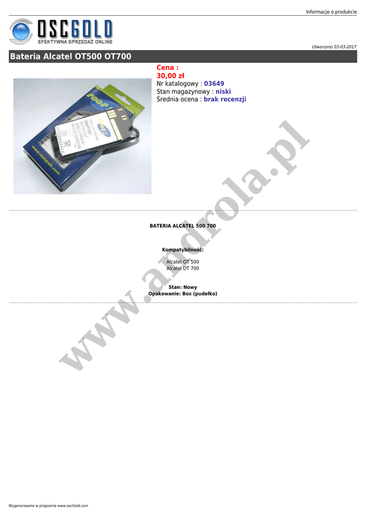 Informacje o produkcie Utworzono 03-03-2017 Bateria Alcatel OT500 OT700 Cena : 30,00 zł ro la .p l Nr katalogowy : 03649 Stan magazynowy : niski Średnia ocena : brak recenzji nd BATERIA ALCATEL 500 700 Kompatybilność: w .a Alcatel OT 500 Alcatel OT 700 w w Stan: Nowy Opakowanie: Box (pudełko) Wygenerowano w programie www.oscGold.com