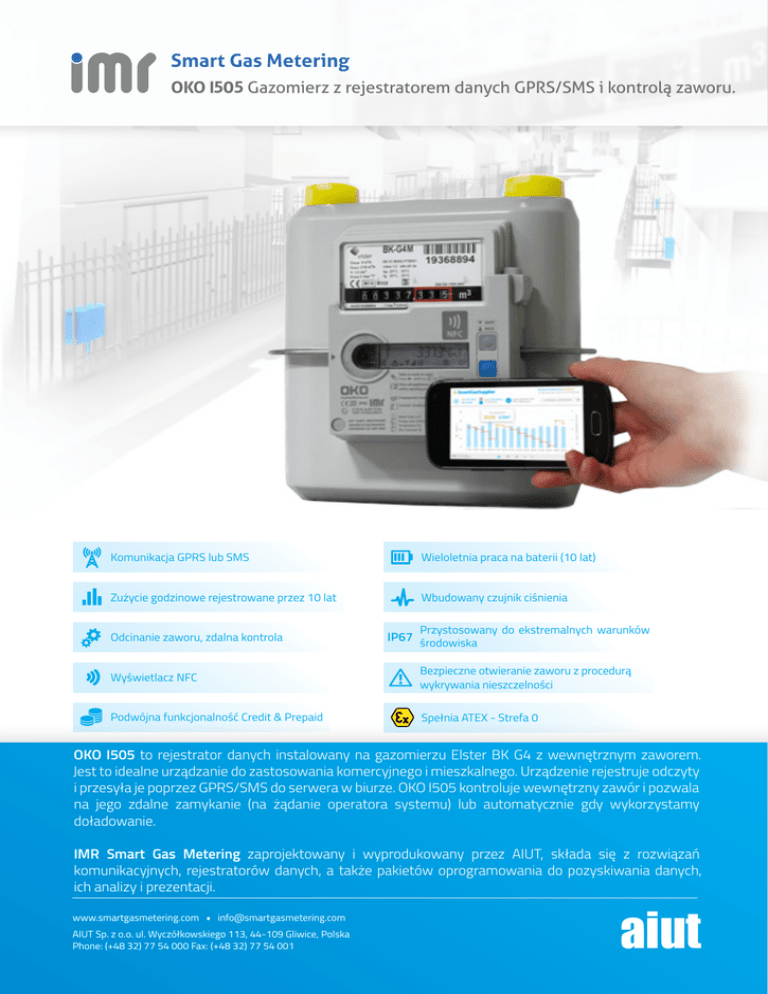 Smart Gas Metering OKO I505 Gazomierz z rejestratorem danych GPRS/SMS i kontrolą zaworu. Komunikacja GPRS lub SMS Wieloletnia praca na baterii (10 lat) Zużycie godzinowe rejestrowane przez 10 lat Wbudowany czujnik ciśnienia Odcinanie zaworu, zdalna kontrola IP67 Przystosowany do ekstremalnych warunków środowiska Wyświetlacz NFC Bezpieczne otwieranie zaworu z procedurą wykrywania nieszczelności Podwójna funkcjonalność Credit & Prepaid Spełnia ATEX - Strefa 0 OKO I505 to rejestrator danych instalowany na gazomierzu Elster BK G4 z wewnętrznym zaworem. Jest to idealne urządzanie do zastosowania komercyjnego i mieszkalnego. Urządzenie rejestruje odczyty i przesyła je poprzez GPRS/SMS do serwera w biurze. OKO I505 kontroluje wewnętrzny zawór i pozwala na jego zdalne zamykanie (na żądanie operatora systemu) lub automatycznie gdy wykorzystamy doładowanie. IMR Smart Gas Metering zaprojektowany i wyprodukowany przez AIUT, składa się z rozwiązań komunikacyjnych, rejestratorów danych, a także pakietów oprogramowania do pozyskiwania danych, ich analizy i prezentacji. www.smartgasmetering.com • [email protected] AIUT Sp. z o.o. ul. Wyczółkowskiego 113, 44-109 Gliwice, Polska Phone: (+48 32) 77 54 000 Fax: (+48 32) 77 54 001 aiut Smart Gas Metering OKO I505 Gazomierz z rejestratorem danych GPRS/SMS i kontrolą Rejestrator danych umożliwia zdalną kontrolę zaworu, bez konieczności uzyskania zgody klienta: zawór jest zamykany na żądanie i za zgodą otwierany manualnie. Pozwala to utrzymać lojalność klientów oraz wspiera płatności „na czas”. W trybie prepaid OKO I505 wspiera użytkowników w kontrolowaniu swojego stanu konta i pozwala niezależnie doładowywać urządzenie poprzez GPRS lub NFC. Gdy wyczerpiemy wszystkie kredyty, zawór jest automatycznie zamykany. Funkcjonalność i Specyfikacja Techniczna Struktura danych Środowisko pracy • Rejestrowanie danych o godzinowej konsumpcji przez 20 lat. Konfigurowanie rejestracji w odstępach 30 lub 60 minut • Codzienne odczyty: aktualne stany urządzeń, temperatura, dzienne zużycie, podsumowanie GSM • Wykrywanie sabotażu: demontaż urządzenia, magnes zewnętrzny, przekroczenie Qmax lub zakresu temperatury pracy • Zabezpieczenie plombami jednorazowymi • Urządzenie odporne na działanie warunków zewnętrznych • Temperatura pracy: -25°C do +55°C • IP67. Odporny na wysoką wilgotność • Spełnia ATEX - Z0 Komunikacja Technologia NFC dostępna miejscu eksploatacji • GPRS (TCP, UDP) i SMS • Standardowy protokół Smart-Gas, opcjonalnie obsługa dedykowanych protokołów wymaganych przez klienta • szyfrowanie transmisji danych AES-128 • Zaplanowane codzienne odczyty, konfiguracja • Zdarzenia uruchamiają alarm • Serwer inicjuje zapytania, komendy (zamykanie zaworu), konfigurację • Zdalna aktualizacja oprogramowania • Opcjonalnie zewnętrzny replikator impulsów - złącze RJ 9 Przyjazny interfejs Wyświetlacz LCD z dwoma przyciskami do nawigacji menu: bieżący stan licznika, numer klienta i licznika, stan konta, tryb płatności, zalecana kwota i data doładowania. www.smartgasmetering.com • [email protected] AIUT Sp. z o.o. ul. Wyczółkowskiego 113, 44-109 Gliwice, Polska Phone: (+48 32) 77 54 000 Fax: (+48 32) 77 54 001 Wyświetlacz NFC to nowa generacja gazomierzy przyjaznych użytkownikom: • Dostęp do historii zużycia gazu • Łatwe doładowanie stanu konta Dla działań serwisowych: • Rozbudowana diagnostyka • Uruchamianie i konfiguracja urządzeń System zarządzania • Serwer akwizycyjny do zarządzania odczytami i konfiguracjami rejestratorów • Zarządzanie komunikacją i obsługą masowych systemów opomiarowania liczników gazu w taryfach W1-W4 • Przegląd aktualnych i historycznych danych, przesyłanie raportów • Zarządzanie procesem instalacji, nadzór i utrzymanie wysokiej wydajności systemu • Zintegrowany proces transakcji płatniczych aiut