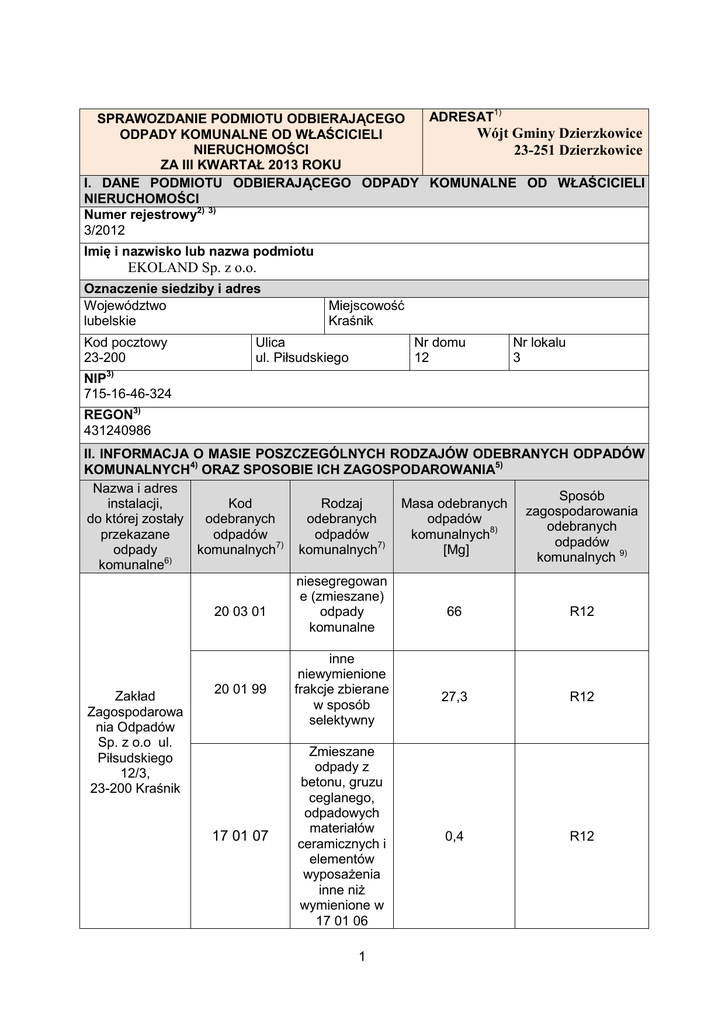 ADRESAT1) SPRAWOZDANIE PODMIOTU ODBIERAJĄCEGO Wójt Gminy Dzierzkowice ODPADY KOMUNALNE OD WŁAŚCICIELI NIERUCHOMOŚCI 23-251 Dzierzkowice ZA III KWARTAŁ 2013 ROKU I. DANE PODMIOTU ODBIERAJĄCEGO ODPADY KOMUNALNE OD WŁAŚCICIELI NIERUCHOMOŚCI Numer rejestrowy2) 3) 3/2012 Imię i nazwisko lub nazwa podmiotu EKOLAND Sp. z o.o. Oznaczenie siedziby i adres Województwo lubelskie Kod pocztowy 23-200 Miejscowość Kraśnik Ulica ul. Piłsudskiego Nr domu 12 Nr lokalu 3 NIP3) 715-16-46-324 REGON3) 431240986 II. INFORMACJA O MASIE POSZCZEGÓLNYCH RODZAJÓW ODEBRANYCH ODPADÓW KOMUNALNYCH4) ORAZ SPOSOBIE ICH ZAGOSPODAROWANIA5) Nazwa i adres Sposób instalacji, Kod Rodzaj Masa odebranych zagospodarowania do której zostały odebranych odebranych odpadów odebranych 8) przekazane odpadów odpadów komunalnych odpadów 7) 7) odpady komunalnych komunalnych [Mg] komunalnych 9) 6) komunalne niesegregowan e (zmieszane) 20 03 01 odpady 66 R12 komunalne Zakład Zagospodarowa nia Odpadów Sp. z o.o ul. Piłsudskiego 12/3, 23-200 Kraśnik 20 01 99 inne niewymienione frakcje zbierane w sposób selektywny 17 01 07 Zmieszane odpady z betonu, gruzu ceglanego, odpadowych materiałów ceramicznych i elementów wyposażenia inne niż wymienione w 17 01 06 1 27,3 R12 0,4 R12 Masa odebranych odpadów o kodzie 20 03 018) [Mg] Masa odpadów o kodzie 20 03 01 poddanych składowaniu8) [Mg] Masa odpadów o kodzie 20 03 01 poddanych innym niż składowanie procesom przetwarzania8) [Mg] Odebranych z obszarów miejskich 0 0 0 Odebranych z obszarów wiejskich 66 0 66 III. INFORMACJA O MASIE ODPADÓW BIODEGRADACJI10) Łączna masa selektywnie odebranych odpadów komunalnych ulegających biodegradacji8) [Mg] KOMUNALNYCH ULEGAJĄCYCH 0 a) przekazanych do składowania na składowisku odpadów Nazwa i adres składowiska, na które przekazano odpady komunalne ulegające biodegradacji Rodzaj odebranych odpadów komunalnych ulegających biodegradacji7) Kod odebranych odpadów komunalnych ulegających biodegradacji7) Masa odpadów komunalnych ulegających biodegradacji przekazanych do składowania na składowisku odpadów8) [Mg] 0 b) nieprzekazanych do składowania na składowisku odpadów Nazwa i adres instalacji, Kod Rodzaj do której odebranych odebranych przekazano odpadów odpadów odpady komunalnych komunalnych komunalne ulegających ulegających ulegające biodegradacji7) biodegradacji7) biodegradacji6) Masa odpadów komunalnych ulegających biodegradacji nieprzekazanych do składowania na składowiska odpadów8) [Mg] Sposób zagospodarowania odpadów komunalnych ulegających biodegradacji 11) nieprzekazanych do składowania na składowiska odpadów 0 IV. OGRANICZENIE MASY ODPADÓW KOMUNALNYCH ULEGAJĄCYCH 12) BIODEGRADACJI PRZEKAZYWANYCH DO SKŁADOWANIA Osiągnięty poziom ograniczenia masy odpadów komunalnych ulegających biodegradacji 7,3 przekazywanych do składowania 13) V. POZIOM RECYKLINGU I PRZYGOTOWANIA DO PONOWNEGO UŻYCIA NASTĘPUJĄCYCH FRAKCJI ODPADÓW KOMUNALNYCH: PAPIERU, METALI, TWORZYW SZTUCZNYCH I SZKŁA14) ODEBRANYCH Z OBSZARU GMINY Kod odebranych Rodzaj odebranych Łączna masa Masa Masa odpadów odpadów odpadów odebranych odpadów przygotowanych komunalnych7) komunalnych7) odpadów poddanych do ponownego 2 15 01 01 15 01 07 15 01 02 15 01 04 komunalnych8) [Mg] recyklingowi8) [Mg] użycia8) [Mg] 1,3 1,3 - 9,4 9,4 - 3,5 3,5 - 0,6 0,6 - Opakowania z papieru i tektury Opakowania ze szkła Opakowania z tworzyw sztucznych Opakowania z metali Osiągnięty poziom recyklingu, przygotowania 57,3 do ponownego użycia 15) następujących frakcji odpadów komunalnych: papieru, metali, tworzyw sztucznych i szkła12) [%] VI. POZIOM RECYKLINGU, PRZYGOTOWANIA DO PONOWNEGO UŻYCIA I ODZYSKU INNYMI METODAMI INNYCH NIŻ NIEBEZPIECZNE ODPADÓW BUDOWLANYCH I ROZBIÓRKOWYCH16) Z ODEBRANYCH Z OBSZARU GMINY ODPADÓW KOMUNALNYCH Masa odpadów poddanych Łączna Masa Masa odpadów odzyskowi Kod Rodzaj masa odpadów przygotowanych innymi odebranych odebranych odebranych poddanych do ponownego metodami odpadów7) odpadów7) odpadów8) recyklingowi8) użycia8) niż recykling [Mg] [Mg] [Mg] i ponowne użycie8) [Mg] Zmieszane 17 01 07 0,4 0,4 0 0 odpady z betonu, gruzu ceglanego, odpadowych materiałów ceramicznyc hi elementów wyposażenia inne niż wymienione w 17 01 06 Osiągnięty poziom recyklingu, przygotowania do ponownego użycia i odzysku innymi 100 metodami15) innych niż niebezpieczne odpadów budowlanych i rozbiórkowych12) [%] VII. WŁAŚCICIELE NIERUCHOMOŚCI, OD KTÓRYCH ZOSTAŁY ODEBRANE ODPADY KOMUNALNE 3 Liczba właścicieli nieruchomości, od których zostały odebrane odpady komunalne 1306 Do sprawozdania dołączono wykaz właścicieli nieruchomości, z którymi podmiot w okresie objętym sprawozdaniem zawarł umowy na odbieranie odpadów komunalnych 0 oraz wykaz właścicieli nieruchomości, z którymi umowy te uległy rozwiązaniu lub wygasły. Liczba stron załączników12) 17) VIII. WSKAZANIE WŁAŚCICIELI NIERUCHOMOŚCI, KTÓRZY ZBIERAJĄ ODPADY KOMUNALNE W SPOSÓB NIEZGODNY Z REGULAMINEM UTRZYMANIA CZYSTOŚCI I PORZĄDKU NA TERENIE GMINY18) Imię i nazwisko lub nazwa właściciela Adres nieruchomości nieruchomości Zofia Płecha Dzierzkowice Wola 124 Adam Zapalski Kolonia Wyżnianka 71 Wojciech Wójtowicz Kolonia Wyżnianka 84b Bogusław Siudym Sosnowa Wola 105 IX. DANE OSOBY WYPEŁNIAJĄCEJ SPRAWOZDANIE Imię Nazwisko Beata Telefon służbowy3) 665701080 Data Fiut Faks służbowy 3) E-mail służbowy3) 81 825 14 89 [email protected] 3) odbierającego odpady komunalne od Podpis i pieczątka 19) właścicieli nieruchomości 24.10.2013 r. 4