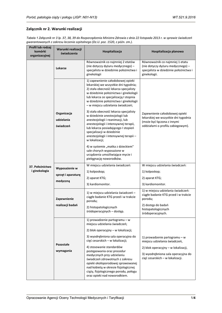 Poród, patologia ciąży i połogu (JGP: N01-N13) WT.521.9.2016 Załącznik nr 2. Warunki realizacji Tabela 1 Załącznik nr 3 lp. 37, 38, 39 do Rozporządzenia Ministra Zdrowia z dnia 22 listopada 2013 r. w sprawie świadczeń gwarantowanych z zakresu leczenia szpitalnego (Dz.U. poz. 1520, z późn. zm.). Profil lub rodzaj komórki organizacyjnej Warunki realizacji świadczenia Lekarze Hospitalizacja Hospitalizacja planowa Równoważnik co najmniej 2 etatów (nie dotyczy dyżuru medycznego) – specjalista w dziedzinie położnictwa i ginekologii Równoważnik co najmniej 1 etatu (nie dotyczy dyżuru medycznego) – specjalista w dziedzinie położnictwa i ginekologii. 1) zapewnienie całodobowej opieki lekarskiej we wszystkie dni tygodnia; 2) stała obecność lekarza specjalisty w dziedzinie położnictwa i ginekologii lub lekarza ze specjalizacją I stopnia w dziedzinie położnictwa i ginekologii – w miejscu udzielania świadczeń; Organizacja udzielania świadczeń 3) stała obecność lekarza specjalisty w dziedzinie anestezjologii lub anestezjologii i reanimacji, lub anestezjologii i intensywnej terapii, lub lekarza posiadającego I stopień specjalizacji w dziedzinie anestezjologii i intensywnej terapii – w lokalizacji; Zapewnienie całodobowej opieki lekarskiej we wszystkie dni tygodnia (może być łączona z innymi oddziałami o profilu zabiegowym). 4) w systemie „matka z dzieckiem" sale chorych wyposażone w urządzenia umożliwiające mycie i pielęgnację noworodków. 37. Położnictwo i ginekologia Wyposażenie w sprzęt i aparaturę medyczną Zapewnienie realizacji badań W miejscu udzielania świadczeń: W miejscu udzielania świadczeń: 1) kolposkop; 1) kolposkop; 2) aparat KTG; 2) aparat KTG; 3) kardiomonitor. 3) kardiomonitor. 1) w miejscu udzielania świadczeń – ciągłe badanie KTG przed i w trakcie porodu; 2) histopatologicznych śródoperacyjnych – dostęp. 1) w miejscu udzielania świadczeń: ciągłe badanie KTG przed i w trakcie porodu; 2) dostęp do badań histopatologicznych śródoperacyjnych. 1) prowadzenie partogramu – w miejscu udzielania świadczeń; 2) blok operacyjny – w lokalizacji; Pozostałe wymagania 3) wyodrębniona sala operacyjna do cięć cesarskich – w lokalizacji; 1) prowadzenie partogramu – w miejscu udzielania świadczeń, 4) stosowanie standardów postępowania oraz procedur medycznych przy udzielaniu świadczeń zdrowotnych z zakresu opieki okołoporodowej sprawowanej nad kobietą w okresie fizjologicznej ciąży, fizjologicznego porodu, połogu oraz opieki nad noworodkiem. 2) blok operacyjny – w lokalizacji, Opracowanie Agencji Oceny Technologii Medycznych i Taryfikacji 3) wyodrębniona sala operacyjna do cięć cesarskich – w lokalizacji. 1/4 Poród, patologia ciąży i połogu (JGP: N01-N13) Lekarze WT.521.9.2016 Równoważnik co najmniej 2 etatów (nie dotyczy dyżuru medycznego) – specjalista w dziedzinie położnictwa i ginekologii. 1) wyodrębniona opieka lekarska we wszystkie dni tygodnia – dwóch lekarzy; 2) stała obecność lekarza specjalisty w dziedzinie położnictwa i ginekologii – w miejscu udzielania świadczeń; Organizacja udzielania świadczeń 38. Położnictwo i ginekologia – drugi poziom referencyjny 3) stała obecność lekarza specjalisty w dziedzinie anestezjologii lub anestezjologii i reanimacji, lub anestezjologii i intensywnej terapii albo lekarza posiadającego I stopień specjalizacji w dziedzinie anestezjologii, lub anestezjologii i reanimacji, lub anestezjologii i intensywnej terapii pod warunkiem zapewnienia w strukturze szpitala OAiIT oraz spełniania standardów postępowania medycznego w dziedzinie anestezjologii i intensywnej terapii określonych w przepisach wydanych na podstawie art. 22 ust. 5 ustawy z dnia 15 kwietnia 2011 r. o działalności leczniczej (Dz. U. z 2013 r. poz. 217) – w lokalizacji; 4) możliwość wykonania znieczulenia Dziennik Ustaw – 666 – Poz. 1520 śródporodowego; 5)w systemie „matka z dzieckiem" sale chorych wyposażone w urządzenia umożliwiające mycie i pielęgnację noworodków. 1) w miejscu udzielania świadczeń: a) kolposkop, b) aparat KTG, Wyposażenie w sprzęt i aparaturę medyczną c) kardiomonitor, d) aparat USG zapewniający wykonanie badań zgodnych z profilem udzielanych świadczeń; 2) w lokalizacji: a) laparoskop, b) histeroskop diagnostycznooperacyjny. Zapewnienie 1) w miejscu udzielania świadczeń – ciągłe badanie KTG przed i w trakcie porodu; realizacji badań 2) laboratoryjnych – w lokalizacji; 3) histopatologicznych śródoperacyjnych – dostęp. Opracowanie Agencji Oceny Technologii Medycznych i Taryfikacji 2/4 Poród, patologia ciąży i połogu (JGP: N01-N13) WT.521.9.2016 1) blok operacyjny, 2) wyodrębniona sala operacyjna do cięć cesarskich, 3) oddział neonatologiczny z równoważnym lub wyższym poziomem referencyjnym – w lokalizacji; Pozostałe wymagania 4) prowadzenie partogramu – w miejscu udzielania świadczeń; 5) stosowanie standardów postępowania oraz procedur medycznych przy udzielaniu świadczeń zdrowotnych z zakresu opieki okołoporodowej sprawowanej nad kobietą w okresie fizjologicznej ciąży, fizjologicznego porodu, połogu oraz opieki nad noworodkiem. Lekarze Równoważnik co najmniej 2 etatów (nie dotyczy dyżuru medycznego) – specjalista w dziedzinie położnictwa i ginekologii. 1) wyodrębniona opieka lekarska we wszystkie dni tygodnia – trzech lekarzy; 2) stała obecność lekarza specjalisty w dziedzinie położnictwa i ginekologii – w miejscu udzielania świadczeń; 39. Położnictwo i ginekologia – trzeci poziom referencyjny Organizacja udzielania świadczeń 3) stała obecność lekarza specjalisty w dziedzinie anestezjologii lub anestezjologii i reanimacji, lub anestezjologii i intensywnej terapii albo lekarza posiadającego I stopień specjalizacji w dziedzinie anestezjologii, lub anestezjologii i reanimacji, lub anestezjologii i intensywnej terapii pod w