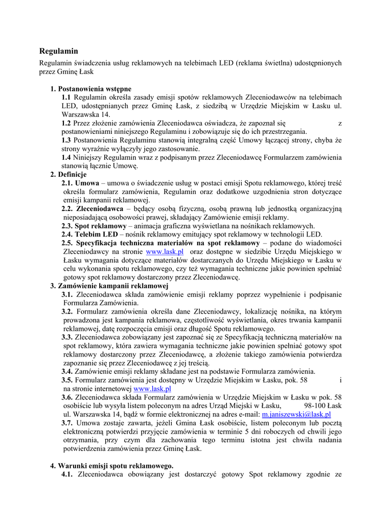 Regulamin Regulamin świadczenia usług reklamowych na telebimach LED (reklama świetlna) udostępnionych przez Gminę Łask 1. Postanowienia wstępne 1.1 Regulamin określa zasady emisji spotów reklamowych Zleceniodawców na telebimach LED, udostępnianych przez Gminę Łask, z siedzibą w Urzędzie Miejskim w Łasku ul. Warszawska 14. 1.2 Przez złożenie zamówienia Zleceniodawca oświadcza, że zapoznał się z postanowieniami niniejszego Regulaminu i zobowiązuje się do ich przestrzegania. 1.3 Postanowienia Regulaminu stanowią integralną część Umowy łączącej strony, chyba że strony wyraźnie wyłączyły jego zastosowanie. 1.4 Niniejszy Regulamin wraz z podpisanym przez Zleceniodawcę Formularzem zamówienia stanowią łącznie Umowę. 2. Definicje 2.1. Umowa – umowa o świadczenie usług w postaci emisji Spotu reklamowego, której treść określa formularz zamówienia, Regulamin oraz dodatkowe uzgodnienia stron dotyczące emisji kampanii reklamowej. 2.2. Zleceniodawca – będący osobą fizyczną, osobą prawną lub jednostką organizacyjną nieposiadającą osobowości prawej, składający Zamówienie emisji reklamy. 2.3. Spot reklamowy – animacja graficzna wyświetlana na nośnikach reklamowych. 2.4. Telebim LED – nośnik reklamowy emitujący spot reklamowy w technologii LED. 2.5. Specyfikacja techniczna materiałów na spot reklamowy – podane do wiadomości Zleceniodawcy na stronie www.lask.pl oraz dostępne w siedzibie Urzędu Miejskiego w Łasku wymagania dotyczące materiałów dostarczanych do Urzędu Miejskiego w Łasku w celu wykonania spotu reklamowego, czy też wymagania techniczne jakie powinien spełniać gotowy spot reklamowy dostarczony przez Zleceniodawcę. 3. Zamówienie kampanii reklamowej 3.1. Zleceniodawca składa zamówienie emisji reklamy poprzez wypełnienie i podpisanie Formularza Zamówienia. 3.2. Formularz zamówienia określa dane Zleceniodawcy, lokalizację nośnika, na którym prowadzona jest kampania reklamowa, częstotliwość wyświetlania, okres trwania kampanii reklamowej, datę rozpoczęcia emisji oraz długość Spotu reklamowego. 3.3. Zleceniodawca zobowiązany jest zapoznać się ze Specyfikacją techniczną materiałów na spot reklamowy, która zawiera wymagania techniczne jakie powinien spełniać gotowy spot reklamowy dostarczony przez Zleceniodawcę, a złożenie takiego zamówienia potwierdza zapoznanie się przez Zleceniodawcę z jej treścią. 3.4. Zamówienie emisji reklamy składane jest na podstawie Formularza zamówienia. 3.5. Formularz zamówienia jest dostępny w Urzędzie Miejskim w Łasku, pok. 58 i na stronie internetowej www.lask.pl 3.6. Zleceniodawca składa Formularz zamówienia w Urzędzie Miejskim w Łasku w pok. 58 osobiście lub wysyła listem poleconym na adres Urząd Miejski w Łasku, 98-100 Łask ul. Warszawska 14, bądź w formie elektronicznej na adres e-mail: [email protected] 3.7. Umowa zostaje zawarta, jeżeli Gmina Łask osobiście, listem poleconym lub pocztą elektroniczną potwierdzi przyjęcie zamówienia w terminie 5 dni roboczych od chwili jego otrzymania, przy czym dla zachowania tego terminu istotna jest chwila nadania potwierdzenia zamówienia przez Gminę Łask. 4. Warunki emisji spotu reklamowego. 4.1. Zleceniodawca obowiązany jest dostarczyć gotowy Spot reklamowy zgodnie ze Specyfikacją techniczną materiałów na spot reklamowy, nie później niż 5 dni roboczych przed pierwszą emisją. 4.2. Gmina Łask potwierdzi Zleceniodawcy odbiór Spotu oraz oceni jego zgodność ze Specyfikacją techniczną materiałów na spot reklamowy, która zawiera wymagania techniczne jakie powinien spełniać gotowy spot reklamowy dostarczony przez Zleceniodawcę. W przypadku niezgodności dostarczonego Spotu ze Specyfikacją techniczną Zleceniodawca zostanie powiadomiony o tym fakcie w terminie 3 dni roboczych od otrzymania Spotu reklamowego. 4.3. Gmina Łask zastrzega sobie prawo do odmowy lub wstrzymania emisji reklamy Zleceniodawcy w sytuacji, gdy Spot reklamowy jest złej jakości, która uniemożliwia jego emisję. 4.4. Za opóźnienie lub zwłokę w emisji reklamy lub brak emisji reklamy spowodowane niedostarczeniem Spotu reklamowego lub dostarczeniem Spotu reklamowego niezgodnego ze Specyfikacją techniczną materiałów na spot reklamowy, dostarczony przez Zleceniodawcę, Gmina Łask nie ponosi odpowiedzialności i może żądać zapłaty wynagrodzenia określonego w Umowie. 5. Zmiany Spotu Reklamowego. 5.1. Zleceniodawca upoważnia Gminę Łask do dokonywania opracowań, zmian, przeróbek lub adaptacji Spotu reklamowego (zwanych łącznie zmianami Spotu reklamowego) w zakresie niezbędnym dla prawidłowej emisji reklamy. Gmina Łask nie ma jednak obowiązku dokonywania zmian Spotu reklamowego. 5.2. Gmina Łask może zawiadomić Zleceniodawcę o potrzebie wprowadzenia zmian do Spotu reklamowego. Zleceniodawca w ciągu 3 dni roboczych od dnia otrzymania projektu zmian zobowiązany jest je zaakceptować lub zaproponować inne zmiany. 6. Treść Spotu Reklamowego. 6.1. Zleceniodawca oświadcza, że przysługują mu wszelkie prawa, w tym prawa autorskie, do Spotów reklamowych i ich treści. 6.2. Gmina Łask nie ponosi odpowiedzialności związanej z emisją reklamy z tytułu naruszenia praw osób trzecich. 6.3. Zleceniodawca zwróci Gminie Łask na pierwsze żądanie w terminie 7 dni wszelkie wydatki i koszty, jakie Gmina Łask poniosła w związku z obroną przed powyższymi roszczeniami lub ich realizacją, w tym w szczególności koszty doradztwa prawnego, koszty zastępstwa procesowego, koszty sądowe oraz zasądzone lub ustalone w ugodzie odszkodowania, zadośćuczynienia lub inne świadczenia na rzecz osób trzecich. 6.4. Spoty reklamowe nie mogą być sprzeczne z prawem ani zasadami współżycia społecznego. 6.5. Spoty reklamowe nie mogą zawierać treści o charakterze wyborczym. 6.6. Spoty reklamowe nie mogą prezentować reklam dyskontów spożywczych z wyłączeniem sieci Kau