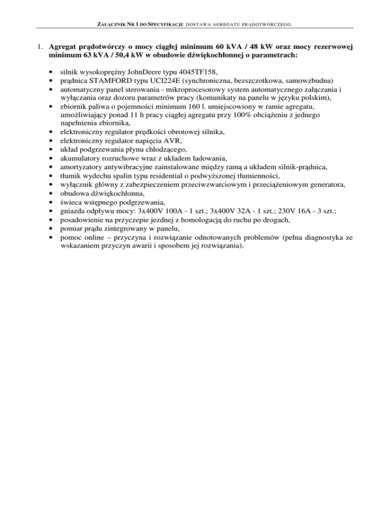 ZAŁĄCZNIK NR 1 DO SPECYFIKACJI: DOSTAWA AGREGATU PRĄDOTWÓRCZEGO . 1. Agregat prądotwórczy o mocy ciągłej minimum 60 kVA / 48 kW oraz mocy rezerwowej minimum 63 kVA / 50,4 kW w obudowie dźwiękochłonnej o parametrach: • silnik wysokopręŜny JohnDeere typu 4045TF158, • prądnica STAMFORD typu UCI224E (synchroniczna, bezszczotkowa, samowzbudna) • automatyczny panel sterowania - mikroprocesorowy system automatycznego załączania i wyłączania oraz dozoru parametrów pracy (komunikaty na panelu w języku polskim), • zbiornik paliwa o pojemności minimum 160 l. umiejscowiony w ramie agregatu, umoŜliwiający ponad 11 h pracy ciągłej agregatu przy 100% obciąŜeniu z jednego napełnienia zbiornika, • elektroniczny regulator prędkości obrotowej silnika, • elektroniczny regulator napięcia AVR, • układ podgrzewania płynu chłodzącego, • akumulatory rozruchowe wraz z układem ładowania, • amortyzatory antywibracyjne zainstalowane między ramą a układem silnik-prądnica, • tłumik wydechu spalin typu residential o podwyŜszonej tłumienności, • wyłącznik główny z zabezpieczeniem przeciwzwarciowym i przeciąŜeniowym generatora, • obudowa dźwiękochłonna, • świeca wstępnego podgrzewania, • gniazda odpływu mocy: 3x400V 100A - 1 szt.; 3x400V 32A - 1 szt.; 230V 16A - 3 szt.; • posadowienie na przyczepie jezdnej z homologacją do ruchu po drogach, • pomiar prądu zintegrowany w panelu, • pomoc online – przyczyna i rozwiązanie odnotowanych problemów (pełna diagnostyka ze wskazaniem przyczyn awarii i sposobem jej rozwiązania).