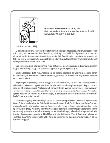 Parafia Św. Kazimierza w St. Louis, Mo. Historya Polska w Ameryce, X. Wacław Kruszka, Tom XI, Milwaukee, WI, 1907, p. 126-128. (założona w roku 1889) O kilkanaście bloków na wschód od Stanisława, bliżej rzeki Mississippi, stoi drugi kościół polski w St. Louis, pod wezwaniem św. Kazimierza, założony roku 1889. Założycielem i proboszczem tej parafii był ks. F. Gnieliński. Parafia jego, w sile 600 familii, rosła i rozwijała się pomału, ale stale. Do szkoły uczęszczało tu około 200 dzieci, których uczyło pięć Sióstr Franciszkanek. Kościół poświęcono we wrześniu roku 1895. Sąd okręgowy, dnia 12 października roku 1895 uznał ks. Gnielińskiego jedynym właścicielem majątku kościelnego, dając mu prawo zaciągania pożyczek, sprzedaży itd. Dnia 16 listopada 1905 roku, rozeszła się po mieście pogłoska, że tyloletni proboszcz parafii św. Kazimierza, ks. Franciszek Ksawery Gnieliński, przeniósł się poza ocean. Asystentem wówczas był ks. Stefan Płaza. Pogłoskę tę większość parafian przyjęła z niedowierzaniem, bo przecież ostatniej niedzieli na kazaniu ks. Gnieliński ogłosił z ambony, że tylko odprowadzi swą kuzynkę do okrętu, i natychmiast do St. Louis powróci. Pogłoska atoli sprawdziła się. Wielce rozgoryczeni i zaintrygowani parafianie udali się do Arcybiskupa Glennona z prośbą o wyjaśnienie stanu rzeczy. Arcybiskup wyraził nadzieję w powrót ks. Gnielińskiego, a tymczasem polecił komitetowi parafialnemu zbadać finansowy stan parafii. Jako też następnej niedzieli odbyły się po raz pierwszy w parafii św. Kazimierza wybory parafialne. Dotychczas bowiem ks. Gnieliński mianował zwykle 2 lub 3 członków „pro forma", a sam zarządzał parafią, jako udzielny pan na Kazimierzowie. Nowo wybrany komitet parafialny wziął się gorliwie do pracy. Najpierw zrobił najważniejsze odkrycie, że cały majątek parafialny, jakimś nadzwyczajnym cudem został przepisany na ks. Gnielińskiego, jako absolutnego właściciela. Długów hipotecznych znaleziono $11,200, z których niejakiemu Wm. B. Popinowi należało się $10,000 a pewnemu Niemcowi $1,200, które ks. Gnieliński na dwa dni przed wyjazdem do Europy był zaciągnął. 1 Po zbadaniu książek depozytowych, okazało się, że ks. Gnieliński przyjął na przechowanie od poszczególnych parafian sumę $35,725, które wraz z nim powędrowały do Europy. Następcą ks. Gnielińskiego został dzielny i odważny ks. Teofil Pudłowski, który 21 grudnia 1905 szturmem wziął to probostwo. Po upływie dni paru, ks. Pudłowski, za poręczeniem arcybiskupa, pożyczył z banku Mercantile Trust Co. $35,725 na 5 procent, i takowymi wypłacił ludziom depozyty złożone u ks. Gnielińskiego. Ani parafia, ani komitet o tym nie wiedzieli, pomimo, że dług na parafię zaciągnięto. Mr. Papin, który pożyczył ks. Gnielińskiemu $10,000, sprzedał morgicz Arcybiskupowi. Parafia wniosła do sądu prośbę o wstrzymanie zamierzonej sprzedaży, na podstawie nieważności hipoteki. Sąd prośbę parafian uwzględnił, i wstrzymał sprzedaż kościoła do czasu procesu. Asystentem nowego proboszcza ks. Pudłowskiego był w roku 1906 ks. Stanisław Wiśniewski. W szkole w tymże roku było 300 dzieci, 5 Sióstr Franciszkanek. W czasie zamieszek, ni stad ni zowąd trzech niezależnych księży zawitało do St. Louis, Mo. Jeden z nich, (jakiś Wincenty De Łagan) zyskał wielu zwolenników i począł odprawiać nabożeństwa polskie w episkopalnej katedrze, naturalnie za pozwoleniem episkopalnego biskupa Tootle. Przybył także zmartwychwstaniec ks. Spetz z Chicago. Arcybiskup pierwotnie chciał ks. Matauszka zrobić proboszczem. Lud chciał ks. Stefana Płazę lub ks. Szymona Zielińskiego. Arcybiskup narzucił im przemocą ks. Pudłowskiego, który dotychczas tam rządzi „laską żelazną." 2