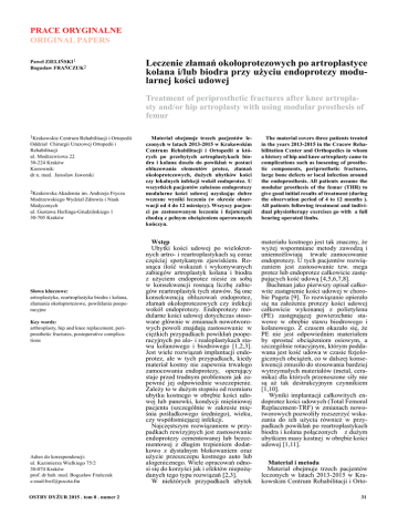 PRACE ORYGINALNE ORIGINAL PAPERS Paweł Zieliński1 Bogusław Frańczuk2 Leczenie złamań okołoprotezowych po artroplastyce kolana i/lub biodra przy użyciu endoprotezy modularnej kości udowej Treatment of periprosthetic fractures after knee artroplasty and/or hip artroplasty with using modular prosthesis of femur 1Krakowskie Centrum Rehabilitacji i Ortopedii Oddział Chirurgii Urazowej Ortopedii i Rehabilitacji ul. Modrzewiowa 22 30-224 Kraków Kierownik: dr n. med. Jarosław Jaworski 2Krakowska Akademia im. Andrzeja Frycza Modrzewskiego Wydział Zdrowia i Nauk Medycznych ul. Gustawa Herlinga-Grudzińskiego 1 30-705 Kraków Słowa kluczowe: artroplastyka, reartroplastyka biodra i kolana, złamania okołoprotezowe, powikłania pooperacyjne Key words: arthroplasty, hip and knee replacement, periprosthetic fractures, postoperative complications Adres do korespondencji: ul. Kazimierza Wielkiego 75/2 30-074 Kraków prof. dr hab. med. Bogusław Frańczuk e-mail:[email protected] OSTRY DYŻUR 2015 . tom 8 . numer 2 Materiał obejmuje trzech pacjentów leczonych w latach 2013-2015 w Krakowskim Centrum Rehabilitacji i Ortopedii u których po przebytych artroplastykach biodra i kolana doszło do powikłań w postaci obluzowania elementów protez, złamań okołoprotezowych, dużych ubytków kości czy lokalnych infekcji wokół endoprotez. U wszystkich pacjentów założono endoprotezy modularne kości udowej uzyskując dobre wczesne wyniki leczenia (w okresie obserwacji od 4 do 12 miesięcy). Wszyscy pacjenci po zastosowanym leczeniu i fizjoterapii chodzą z pełnym obciążeniem operowanych kończyn. The material covers three patients treated in the years 2013-2015 in the Cracow Rehabilitation Center and Orthopedics in whom a history of hip and knee artroplasty came to complications such as loosening of prosthetic components, periprosthetic fractures, large bone defects or local infection around the endoprosthesis. All patients assume the modular prosthesis of the femur (THR) to give good initial results of treatment (during the observation period of 4 to 12 months ). All patients following treatment and individual physiotherapy exercises go with a full bearing operated limbs. Wstęp Ubytki kości udowej po wielokrotnych artro- i reartroplastykach są coraz częściej spotykanym zjawiskiem. Rosnąca ilość wskazań i wykonywanych zabiegów artroplastyk kolana i biodra z użyciem endoprotez niesie za sobą w konsekwencji rosnącą liczbę zabiegów reartroplastyk tych stawów. Są one konsekwencją obluzowań endoprotez, złamań okołoprotezowych czy infekcji wokół endoprotezy. Endoprotezy modularne kości udowej dotychczas stosowane głównie w zmianach nowotworowych powoli znajdują zastosowanie w ciężkich przypadkach powikłań pooperacyjnych po alo- i realoplastykach stawu kolanowego i biodrowego [1,2,3]. Jest wiele rozwiązań implantacji endoprotez, ale w tych przypadkach, kiedy materiał kostny nie zapewnia trwałego zamocowania endoprotezy, operujący staje przed trudnym problemem jak zapewnić jej odpowiednie wszczepienie. Zależy to w dużym stopniu od rozmiaru ubytku kostnego w obrębie kości udowej lub panewki, kondycji mięśniowej pacjenta (szczególnie w zakresie mięśnia pośladkowego średniego), wieku, czy współistniejącej infekcji. Najczęstszym rozwiązaniem w przypadkach rewizyjnych jest zastosowanie endoprotezy cementowanej lub bezcementowej z długim trzpieniem dodatkowo z dystalnym blokowaniem oraz użycie przeszczepu kostnego auto lub alogenicznego. Wiele opracowań odnosi się do korzyści jak i efektów niepożądanych tego typu rozwiązań [2,3]. W niektórych przypadkach ubytek materiału kostnego jest tak znaczny, że wyżej wspomniane metody zawodzą i uniemożliwiają trwałe zamocowanie endoprotezy. U tych pacjentów rozwiązaniem jest zastosowanie tzw. mega protez lub endoprotez całkowicie zastępujących kość udową [4,5,6,7,8]. Buchman jako pierwszy opisał całkowite zastąpienie kości udowej w chorobie Pageta [9]. To rozwiązanie opierało się na założeniu protezy kości udowej całkowicie wykonanej z polietylenu (PE) zastępującej powierzchnie stawowe w obrębie stawu biodrowego i kolanowego. Z czasem okazało się, że PE nie jest odpowiednim materiałem by sprostać obciążeniom osiowym, a szczególnie rotacyjnym, którym poddawana jest kość udowa w czasie fizjologicznych obciążeń, co w dalszej konsekwencji zmusiło do stosowania bardziej wytrzymałych materiałów (metal, ceramika) dla których przenoszone siły nie są aż tak destrukcyjnym czynnikiem [1,10]. Wyniki implantacji całkowitych endoprotez kości udowych (Total Femoral Replacement-TRF) w zmianach nowotworowych pozwoliły rozszerzyć wskazania do ich użycia również w przypadkach powikłań po reartroplastykach biodra i kolana połączonych z dużym ubytkiem masy kostnej w obrębie kości udowej [1,11]. Materiał i metoda Materiał obejmuje trzech pacjentów leczonych w latach 2013-2015 w Krakowskim Centrum Rehabilitacji i Orto31 pedii, u których po przebytych artroplastykach biodra i kolana doszło do powikłań, w wyniku których w procesie leczenia zastosowano endoprotezy modularne kości udowej. Planowanie przedoperacyjne Chociaż całkowita reimplantacja uda nie jest tak wymagającym zabiegiem jak rekonstrukcja z zastosowaniem przeszczepów alogenicznych, to planowanie przedoperacyjne wymaga jednak szczegółowych pomiarów operowanego odcinka kończyny [5,6,12]. Bardzo ważny w planowaniu jest prawidłowo wykonany radiogram [6]. Projekcje AP i boczne służą do pomiarów długości kończyny dolnej, dobrania długości elementów endoprotezy, jak też jej średnicy, a także uwidocznienia wszelkich anomalii i ubytków kostnych po wcześniejszych operacjach. Ważne jest również zaopatrzenie się w odpowiednie instrumentarium w celu usunięcia zaimplantowanej endoprotezy wokół której doszło do złamania. Nierzadko są to endoprotezy rewizyjne, wymagaj