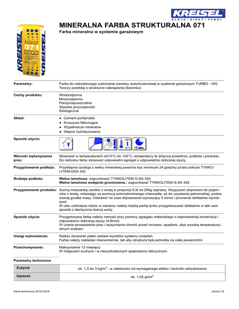 MINERALNA FARBA STRUKTURALNA 071 Farba mineralna w systemie garażowym Parametry: Farba do natryskowego wykonania warstwy wykończeniowej w systemie garażowym TURBO - WG Tworzy powłokę o strukturze nakrapianej (baranka) Cechy produktu: Wodoodporna Mrozoodporna Paroprzepuszczalna Wysoka przyczepność Ekologiczna Skład: ● ● ● ● Cement portlandzki Kruszywo fakturujące Wypełniacze mineralne Wapno hydratyzowane Sposób użycia: Warunki wykonywania prac: Stosować w temperaturach od+5°C do +25°C, temperatury te dotyczą powietrza, podłoża i produktu. Do natrysku farby stosować odpowiedni agregat o odpowiednio dobranej dyszy. Przygotowanie podłoża: Przyklejona izoalcja z wełny mineralnej powinna być minimum 24 godziny przed pokryta TYNKOLITEM-GSA 342 Rodzaje podłoża: Wełna lamelowa: zagruntować TYNKOLITEM G-SA 342 Wełna lamelowa wstępnie gruntowana.: zagruntować TYNKOLITEM G-SA 342 Przygotowanie produktu: Suchą mieszankę zarobić z wodą w proporcji 6,5l na 25kg zaprawy. Wsypywać stopniowo do pojemnika z wodą, mieszając za pomocą wolnoobrotowego mieszadła, aż do uzyskania jednorodnej, pozbawionej grudek masy. Odstawić na czas dojrzewania wynoszący 5 minut i ponownie dokładnie wymieszać. W celu uniknięcia różnic w odcieniu należy każdą partię tynku przygotowywać dokładnie w taki sam sposób z identyczna ilością wody. Sposób użycia: Przygotowana farbę należy nanosić przy pomocy agregatu malarskiego o odpowiedniej konstrukcji i odpowiednio dobranej dyszy (4-8mm) W czasie prowadzenia prac i wysychania chronić przed mrozem, opadami, zbyt wysoką temperaturą i silnym wiatrem. Uwagi wykonawcze: Należy stosować pełen zestaw wyrobów systemu ociepleń. Farbę należy nakładać równomiernie, tak aby struktura była jednolita na całej powierzchni Przechowywanie: Maksymalnie 12 miesięcy W miejscach suchych i w nieuszkodzonym opakowaniu fabrycznym. Parametry techniczne Zużycie ok. 1,3 do 3 kg/m - w zależności od wymaganego efektu i techniki natryskiwania Gęstość ok. 1,02 g/cm Karta techniczna 25.03.2016 2 3 strona 1/2 MINERALNA FARBA STRUKTURALNA 071 Farba mineralna w systemie garażowym Parametry techniczne Odporność systemu na uderzenie > 3J Przyczepność międzywarstwowa ≥ 0,08 MPa Przyczepność międzywarstwowa po mrozoodporności ≥ 0,04 MPa Reakcja na ogień niepalny Wskazówki ogólne: Ta karta zastępuje wszystkie poprzednie wersje. Informacje zawarte w niniejszej karcie technicznej reprezentuje naszą aktualną wiedzę i praktyczne doświadczenie. Są to jedynie ogólne informacje i nie stanowią o odpowiedzialności producenta za wykonawstwo i sposób użytkowania. Mogą bowiem występować różnice i specyficzne warunki sposobu wykonania. Produkt należy stosować zgodnie z wymaganą wiedzą techniczną, oraz zasadami BHP. Należy unikać kontaktu ze skórą oraz chronić oczy. W przypadku kontaktu z oczami, przemyć je obficie czystą wodą i zasięgnąć porady lekarza. Zaleca się używanie rękawic, okularów i odzieży ochronnej. Karta techniczna 25.03.2016 strona 2/2