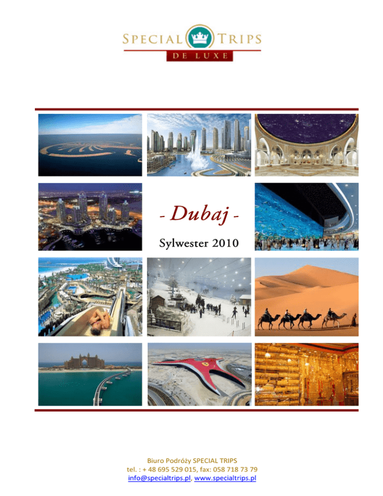 - Dubaj Sylwester 2010 Biuro Podróży SPECIAL TRIPS tel. : + 48 695 529 015, fax: 058 718 73 79 [email protected], www.specialtrips.pl PROPOZYCJA HOTELU HOTEL ATLANTIS 5* Opis: zaplanowany z rozmachem, jedyny w swoim rodzaju, słynny na całym świecie hotel położony jest na sztucznie usypanej wyspie Jumeirah w kształcie palmy, na szczycie jej korony. Z hotelu rozciąga sie piękny widok na Morze Arabskie i na pozostałe wyspy. Skrzydła Royal Towers spięte łukiem i typowa arabska architektura nadają nowy kształt panoramie Dubaju. Hotel leży przy piaszczystej plaży o długości 1400 m. Czas transferu z lotniska wynosi ok. 45 minut. Pokoje: wszystkie pokoje leżą w Royal Towers i oferują wspaniały widok na Zatokę Perską lub na pozostałą część wyspy The Palm. Wyposażone są w łóżka 2-osobowe lub 2 łóżka 1-osobowe, łazienkę i WC, klimatyzację. Pokoje Deluxe położone są na piętrach 1.-5. i posiadają na wyposażeniu suszarkę do włosów, jedno łóżko typu Kingsize i balkon lub dwa łóżka typu Queensize i balkon francuski. Pokoje Atlantis mają wyposażenie jak pokoje Deluxe ale położone są wyżej. Pokoje Imperial Club leżą na piętrach 12.-15., posiadają wspaniały widok na park wodny Aquaventure, dostęp do salonu VIP, który gwarantuje indywidualne zakwaterowanie, śniadanie kontynentalne, przekąski, wieczorny koktajl, darmowy dostęp do internetu, biblioteczki oraz lokalnej prasy. Dodatkowo taras ze strefą dla osób palących. Biuro Podróży SPECIAL TRIPS tel. : + 48 695 529 015, fax: 058 718 73 79 [email protected], www.specialtrips.pl Pokoje klubowe Dodatkowe usługi oferowane bezpłatnie dla gości pokoi klubowych: − Dostęp do klubowego salonu Imperial w godzinach od 7 rano do 23 wieczorem; − Śniadanie podawane osobno, w klubowym salonie od 7:00 do 11:00 lub w innych proponowanych lokalizacjach; − Popołudniowa herbata ze słodką przekąską między 15:00 a 17:00; − Koktajle i przekąski przed kolacją w godzinach od 18:00 do 20:00; − Lekkie przekąski, kawa, herbata i napoje dostępne przez cały dzień; − Codzienny wstęp do Atlantis Kids Club w godzinach od 11:00 do 18:00; − Dostęp do internetu w pokoju. Jest możliwość skorzystania z laptopów w obrębie klubowej lodgy; − Możliwość korzystania z sauny i basenu typu „jet” w Spa Atlantis; − Wybór prasy międzynarodowej; − Specjalna oferta Spa; − Specjalne ceny na ekskluzywne lodge przy basenie. Kuchnia: 17 restauracji i barów, od najwyższej klasy do restauracji rodzinnych, bar przy basenie i salon. Na klientów czekają restauracje włoskie, arabskie, azjatyckie, z owocami morza oraz steakhouse. Śniadania: samoobsługa przy obfitych bufetach, bufetach restauracjach "Kaliedoscope" i "Saffron". Menu sylwestrowe za obowiązkową dopłatą (informacje w cenniku). Biuro Podróży SPECIAL TRIPS tel. : + 48 695 529 015, fax: 058 718 73 79 [email protected], www.specialtrips.pl Rozrywka: Rozrywka: największy w tym rejonie świata park wodny, fantastyczne zjeżdżalnie, sztuczna rzeka o długości 2 km z metrowej wysokości falami i basen ze sztucznymi falami zapewnią niezapomnianą rozrywkę dla całej rodziny. Centralnym punktem parku jest prawie 30-metrowa budowla w kształcie zigguratu przywodząca na myśl zaginioną mityczną Atlantydę. Kryje ona zjeżdżalnię-tunel prowadzącą przez basen z rekinami. W skład kompleksu hotelowego wchodzi również ogromna laguna z setkami gatunków zwierząt morskich, delfinarium oraz podziemny kompleks tuneli ukazujący zaginioną Atlantydę. Na terenie hotelu znajduje się również w pełni wyposażone centrum fitness, a za dodatkową opłatą (oferta firm zewnętrznych): kajaki i windsurfing, sporty wodne, wędkowanie na pełnym morzu. PAKIETY SYLWESTROWE W dniu 31 grudni Hotel Atlantis oferuje swoim gościom pakiety sylwestrowe, obejmujące kolację w jednej wybranej restauracji w ramach pakietu. Pakiet Srebrny Restauracja RONDA LOCATELLI: włoskie menu sylwestrowe przygotowane przez słynnego włoskiego Szefa Kuchni Giorgio Locatelli. Restauracja NASIMI BEACH: azjatyckie przekąski, wielodaniowa kolacja sylwestrowa składająca się z dań europejskich i azjatyckich. W sylwestrowy nastrój wprowadzi gości kubański zespół muzyczny. Restauracja LEVANTINE: pyszne i oryginalne dania kuchni libijskiej, podawane w czasie występów tancerek tańca brzucha. Restauracja SEAFIRE: klasyczna i elegancka restauracja w nowojorskim stylu oferuję na ten wieczór obszerne menu dla miłośników mięs i dobrych napitków. Biuro Podróży SPECIAL TRIPS tel. : + 48 695 529 015, fax: 058 718 73 79 [email protected], www.specialtrips.pl Pakiet Złoty Restauracja OSSIANO: Szef Santi Santamaria, którego restauracja Ossiano otrzymała 3* Michelin, oferuje na ten wieczór bardzo wykwintne galowe menu, uzupełnione wyjątkową atmosferą tego miejsca. Pakiet obejmuje również nielimitowaną ilość napoi. Restauracja NOBU: Znany na całym świecie Szef Kuchni Nobu Matsuhisa przygotował na ten wieczór wyśmienite dania rodem z Japonii. Przekąski i napoje przed kolacją serwowane będą w Barze Nobu. Pakiet Galowy Jest to główna i najbardziej szampańska propozycja spędzenia Sylwestra w Hotelu Atlantis. Dla gości przygotowana będzie kolacja „Pod Gwiazdami”, u stóp Royal Towers na tle Palm Jumeraih. Taka lokalizacja zapewni najlepszy widok na pokaz noworocznych fajerwerków, który będzie zdecydowanie jednym z najbardziej spektakularnych na świecie. Wieczór rozpocznie się od aperitifów, serwowanych przy basenie na parterze kompleksu. Kolacja będzie serwowana w formie niezwykle bogatego bufetu ze stanowiskami gotowania na żywo i grillami, a wszystko w niezwykle eleganckiej oprawie podawane tuż nad brzegiem basenu. Goście mogą przetańczyć całą noc przy akompaniamencie muzyki na żywo, a DJ zadba o dobry nastrój i najważniejszy punkt wieczoru: odliczanie do Nowego Roku! CENNIK Cena za osobę w pokoju d