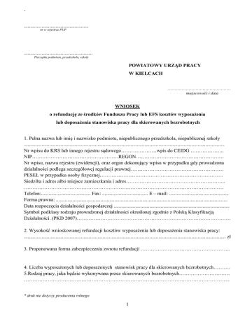 - ................................................... nr w rejestrze PUP ...................................................... Pieczątka podmiotu, przedszkola, szkoły POWIATOWY URZĄD PRACY W KIELCACH ……………………………………… miejscowość i data WNIOSEK o refundację ze środków Funduszu Pracy lub EFS kosztów wyposażenia lub doposażenia stanowiska pracy dla skierowanych bezrobotnych 1. Pełna nazwa lub imię i nazwisko podmiotu, niepublicznego przedszkola, niepublicznej szkoły .............................................................................................................................................................. Nr wpisu do KRS lub innego rejestru sądowego…………………wpis do CEIDG ……………….. NIP……………………………………………REGON……………………………………………. Nr wpisu, nazwa rejestru (ewidencji), oraz organ dokonujący wpisu w przypadku gdy prowadzona działalności podlega szczegółowej regulacji prawnej………………………………………………. PESEL w przypadku osoby fizycznej………………………………………………………………. Siedziba i adres albo miejsce zamieszkania i adres………………………………………………….. ………………………………………………………………………………………………………. Telefon:....................................... Fax: .................................... E – mail: ............................................... Forma prawna: ....................................................................................................................................... Data rozpoczęcia działalności gospodarczej ........................................................................................... Symbol podklasy rodzaju prowadzonej działalności określonej zgodnie z Polską Klasyfikacją Działalności. (PKD 2007)………………………………………………………………………………. 2. Wysokość wnioskowanej refundacji kosztów wyposażenia lub doposażenia stanowiska pracy: ............................................................................................................................................................... zł 3. Proponowana forma zabezpieczenia zwrotu refundacji …………………………………………….. 4. Liczba wyposażonych lub doposażonych stanowisk pracy dla skierowanych bezrobotnych………. 5.Rodzaj pracy, jaka będzie wykonywana przez skierowanych bezrobotnych………………………… ………………………………………………………………………………………………………….. * druk nie dotyczy producenta rolnego 1 6. Adres, pod jakim będzie utworzone stanowisko(-a) pracy .............................................................. ....................................................................................................................................................... 7. Wymagane kwalifikacje i inne wymagania niezbędne do wykonywania pracy, jakie powinien spełniać skierowany bezrobotny. Zawód lub specjalność zgodna z klasyfikacją zawodów ( www.psz.praca.gov.pl ) Poziom i kierunek wykształcenia, kwalifikacje, umiejętności, doświadczenie zawodowe Dodatkowe kwalifikacje i predyspozycje 8. Kwota kosztów jakie zostaną poniesione w okresie 24- m-cy z tytułu zatrudnienia skierowanych bezrobotnych na stanowiskach refundowanych, obejmujących wypłatę wynagrodzeń brutto oraz opłaconych od tych wynagrodzeń składek na ubezpieczenie społeczne …………………... …………………………………………………………………………………………………………... 9. Liczba zatrudnionych pracowników w przeliczeniu na pełne etaty na dzień złożenia wniosku ………………………………………………………………………………………………… 10.Informacja czy planowane do wyposażenia lub doposażenia stanowiska pracy będą utworzone w związku z realizacją nowej inwestycji lub dużego projektu inwestycyjnego w rozumieniu przepisów wydanych na podstawie art. 10 ustawy z dnia 30.04.2004 r. o postępowaniu w sprawach dotyczących pomocy publicznej (Dz. U. 2007 r. 59 poz.. 404 z późn. zm.) ……………………………………………………………… 11.Podać informację, czy wnioskodawca zawarł już umowy o refundację kosztów wyposażenia lub doposażenia stanowiska pracy dla skierowanego bezrobotnego. Jeżeli tak, to kiedy i z jakim urzędem ………………………………………………………………………………………………… ………………………………………………………………………………………………………….. 12.Podać informację, czy wnioskodawca otrzymał środki na podjęcie działalności gospodarczej dla bezrobotnego. Jeżeli tak, to kiedy i w jakim urzędzie …………………………………………………. ………………………………………………………………………………………………………….. ………………………………………………………. Pieczątka i podpis podmiotu, przedszkola, szkoły lub osoby uprawnionej do reprezentowania tego podmiotu, przedszkola, szkoły 2 OŚWIADCZENIE WNIOSKODAWCY Mając świadomość odpowiedzialności karnej przewidzianej w art. 233 Kodeksu Karnego za zatajenie prawdy lub zeznanie nieprawdy podmiot, przedszkole, szkoła oświadczają o: - - - - - - niezmniejszeniu wymiaru czasu pracy pracownika i nie rozwiązaniu stosunku pracy z pracownikiem w drodze wypowiedzenia dokonanego przez podmiot, przedszkole lub szkołę** bądź na mocy porozumienia stron z przyczyn niedotyczących pracowników w okresie 6 miesięcy bezpośrednio poprzedzających dzień złożenia wniosku oraz w okresie od dnia 