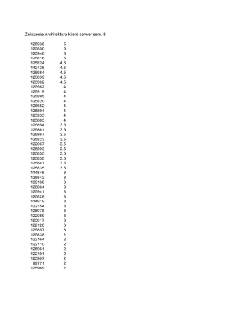 Zaliczenie Architektura klient serwer sem. 8 125936 125850 125946 125816 125824 142436 125984 125839 123902 125982 125919 125895 125820 126652 125894 125935 125883 125854 125861 125867 125823 122067 125893 125855 125830 125841 125835 114846 125842 109168 125864 125941 125828 114919 122154 125978 122089 125817 122120 125857 125838 122164 122110 125961 122191 125907 99771 125969 5 5 5 5 4.5 4.5 4.5 4.5 4.5 4 4 4 4 4 4 4 4 3.5 3.5 3.5 3.5 3.5 3.5 3.5 3.5 3.5 3.5 3 3 3 3 3 3 3 3 3 3 3 3 3 2 2 2 2 2 2 2 2